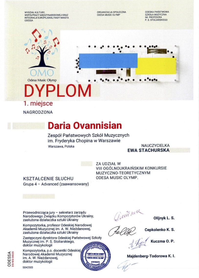 I miejsce w grupie IV - V Międzynarodowy Konkurs Odesa Music Olymp, kategoria: teoria muzyki - kształcenie słuchu