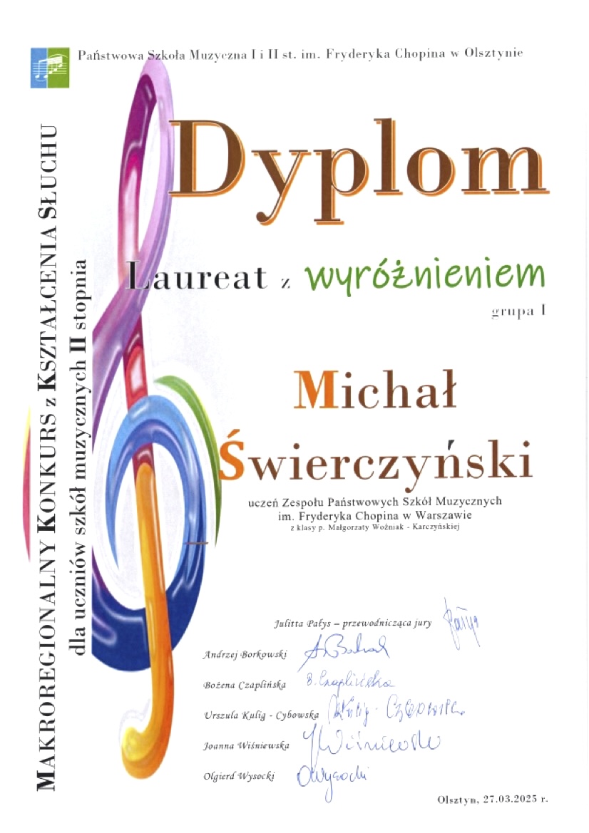 Wyróżnienie - Makroregionalny Konkurs z Kształcenia Słuchu dla Szkół Muzycznych II stopnia