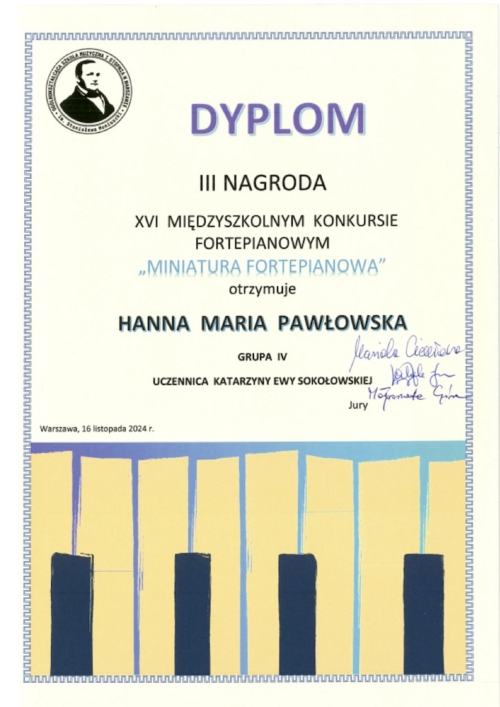 III Nagroda - XVI Międzyszkolny Konkurs Fortepianowy "Miniatura Fortepianowa''