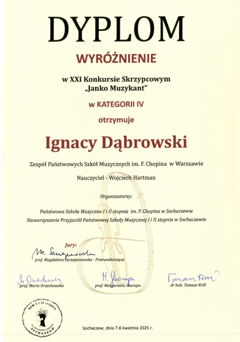 Wyróżnienie - XXI Konkurs Skrzypcowy ,,Janko Muzykant''