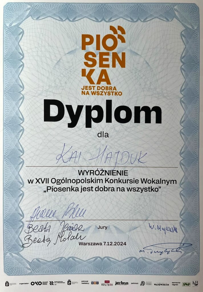 Wyróżnienie - XVII Ogólnopolski Konkurs Wokalny "Piosenka jest dobra na wszystko"