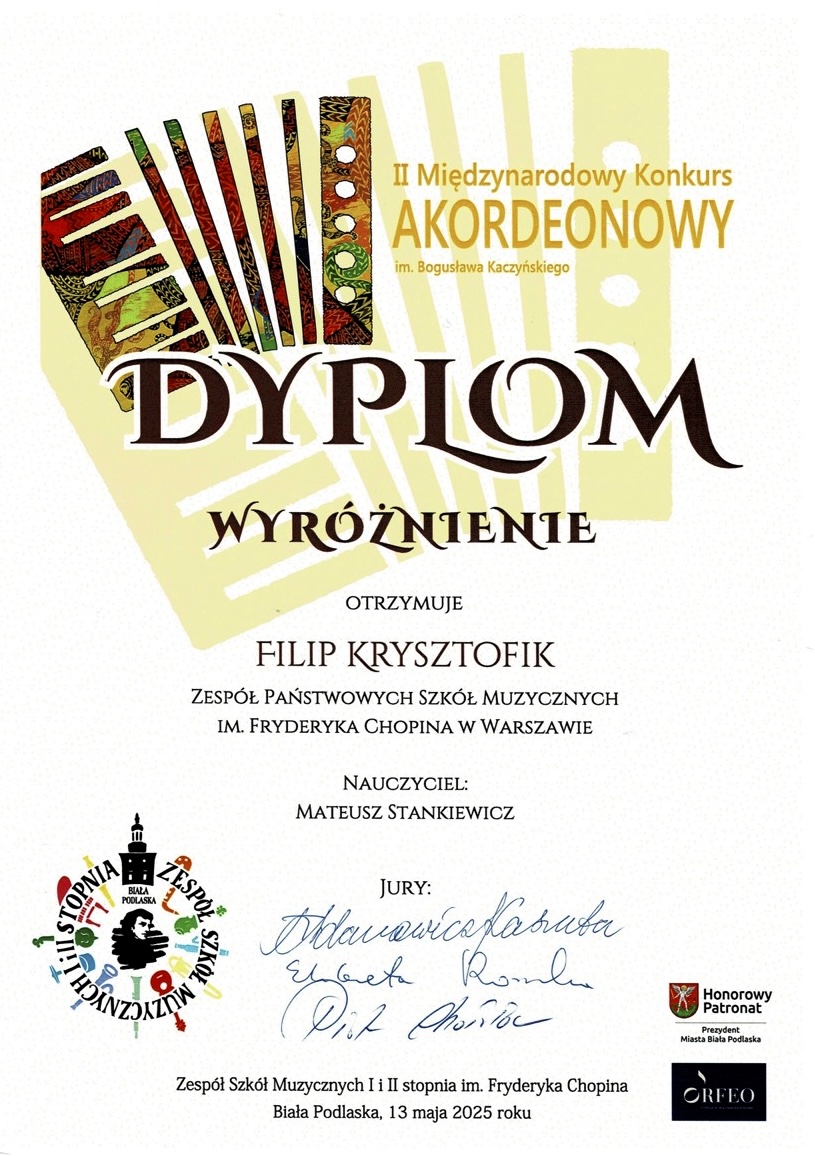 Wyróżnienie - II Międzynarodowy Konkurs Akordeonowy im. Bogusława Kaczyńskiego