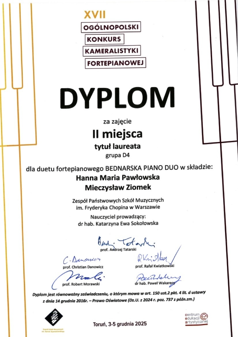 II miejsce tytuł laureata /grupa D4/dla duetu fortepianowego Bednarska Duo