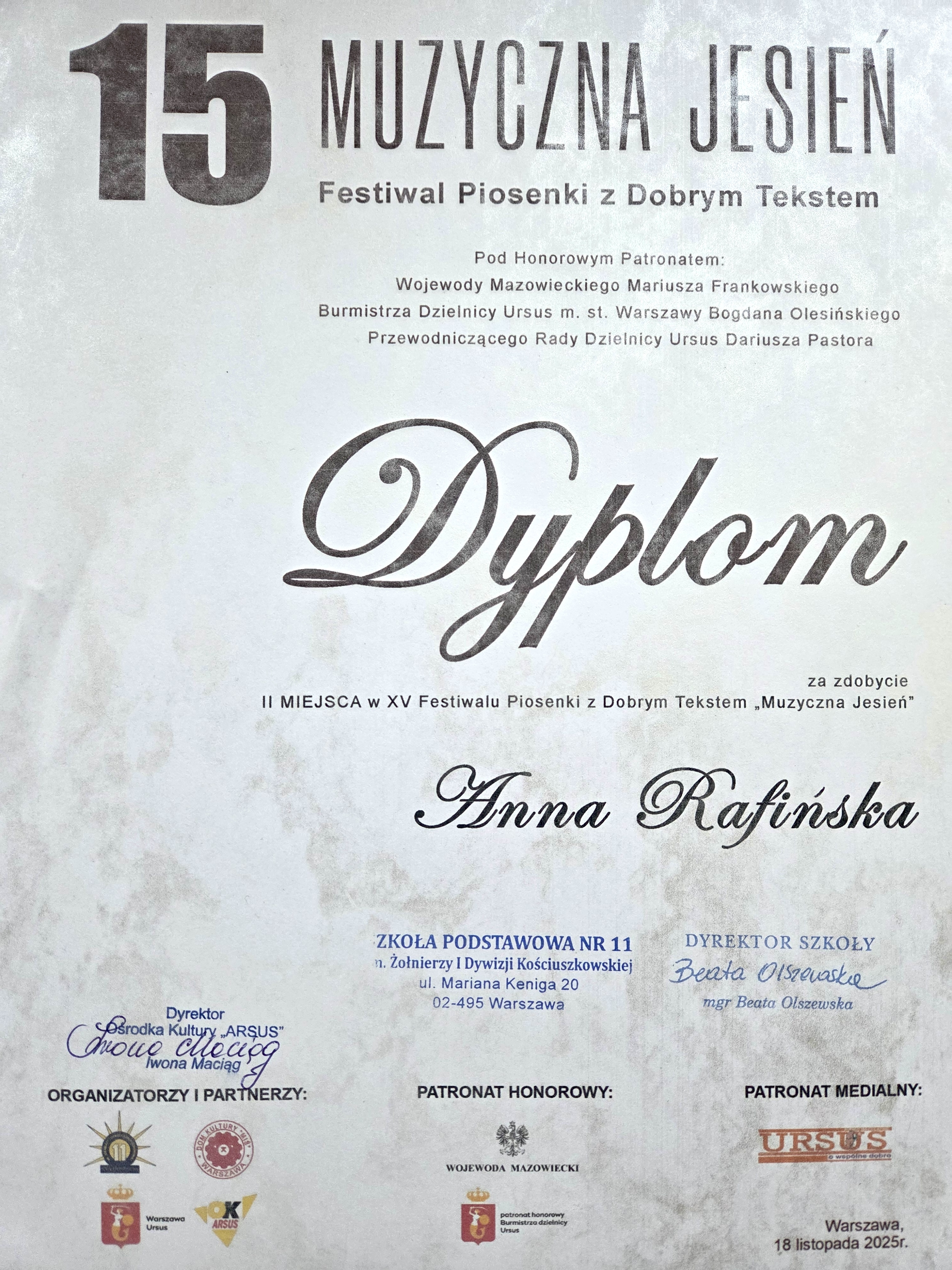 II nagroda - XV Festiwal Piosenki z Dobrym Tekstem "Muzyczna Jesień"