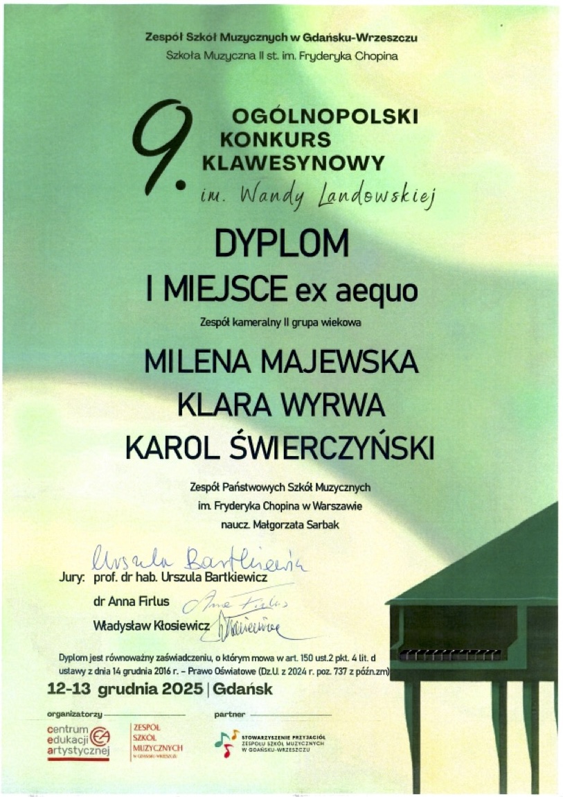 I miejsce w grupie wiekowej II - Ogólnopolski Konkurs Klawesynowy im. W. Landowskiej