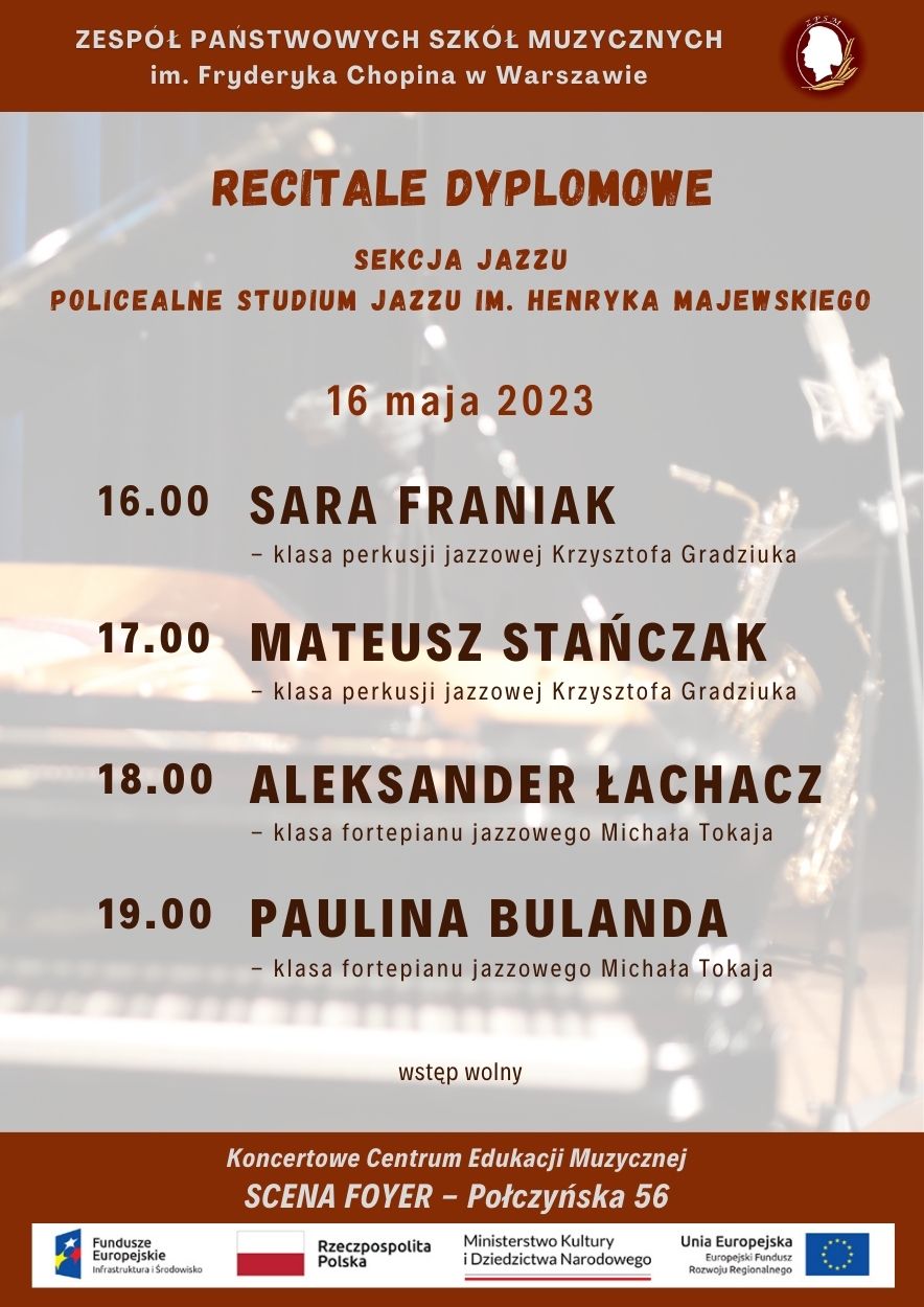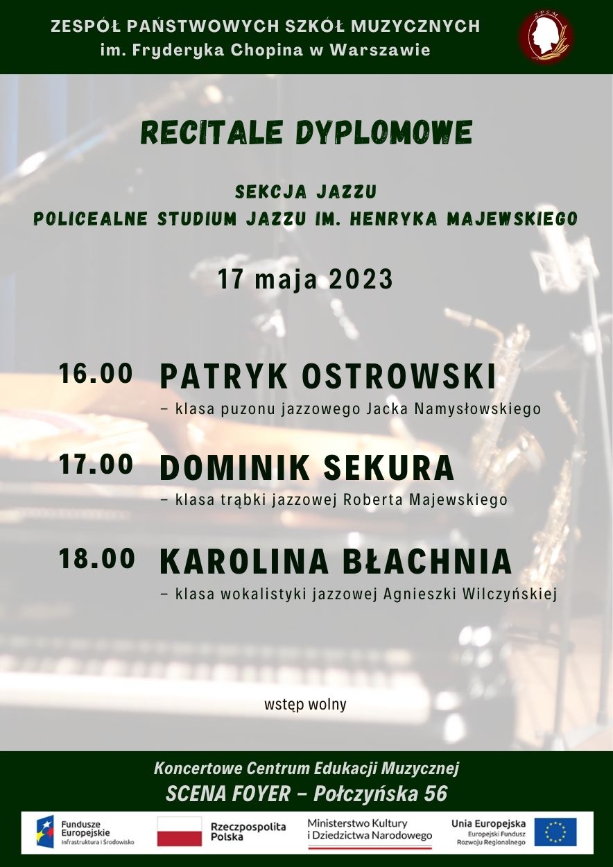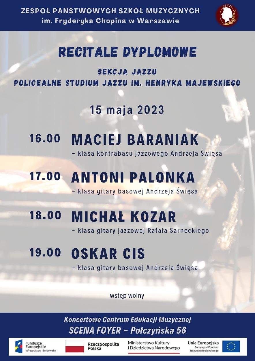 Zapraszamy do sali koncertowej przy ul. Połczyńskiej 56 - Scena Foyer na recitale dyplomowe uczniów Sekcji Jazzu oraz Policealnego Studium Jazzu.