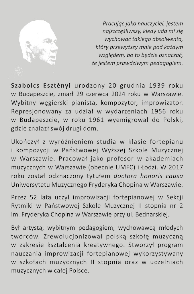 Szabolcs Esztényi urodzony 20 grudnia 1939 roku w Budapeszcie, zmarł 29 czerwca 2024 roku w Warszawie. Wybitny węgierski pianista, kompozytor, improwizator. Represjonowany za udział w wydarzeniach 1956 roku w Budapeszcie, w roku 1961 wyemigrował do Polski, gdzie znalazł swój drugi dom.