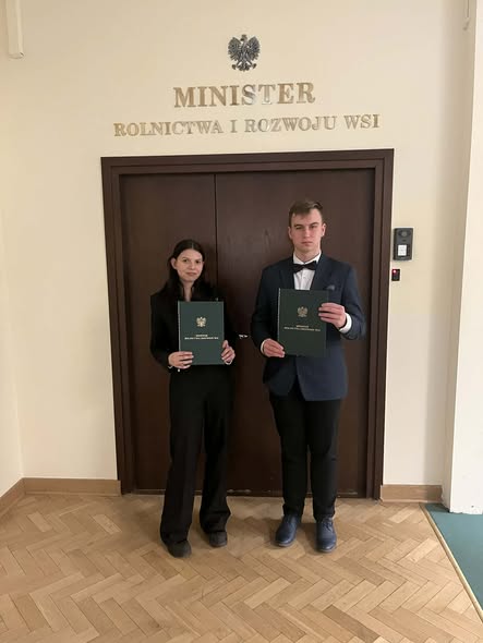 12 stycznia 2026 r. w siedzibie Ministerstwa Rolnictwa i Rozwoju Wsi w Warszawie odbyła się uroczystość wręczenia nagród najlepszym uczniom szkół rolniczych, wchodzących w skład Sieci Szkół Rolniczych MRiRW. Wśród wyróżnionych znalazło się 95 uczniów, którzy wykazali się najwyższymi wynikami w nauce w roku szkolnym 2024/2025, a także osiągnięciami w olimpiadach i konkursach. Wśród nagrodzonych znalazła się również dwójka uczniów naszej szkoły, Nikola Świątek uczennica klasy trzeciej Branżowej w zawodzie kucharz oraz Hubert Bobrowski z klasy trzeciej Technikum Turystyki na Obszarach Wiejskich.