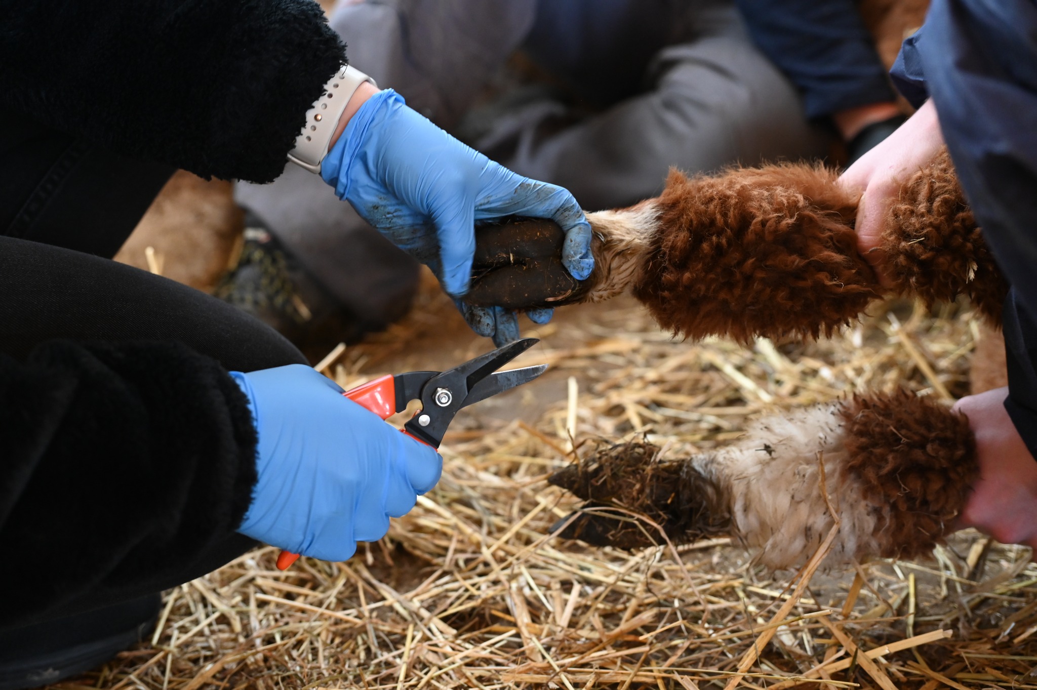 Uczniowie 5 klasy technikum weterynarii zdobywali kolejne cenne doświadczenia w pracy ze zwierzętami. Podczas zajęć praktycznych uczyli się, jak prawidłowo obcinać pazury alpakom. Warto pamiętać, że alpaki – w przeciwieństwie do wielu zwierząt gospodarskich – nie mają racic, lecz miękkie stopy zakończone dwoma pazurami, które wymagają regularnej pielęgnacji.