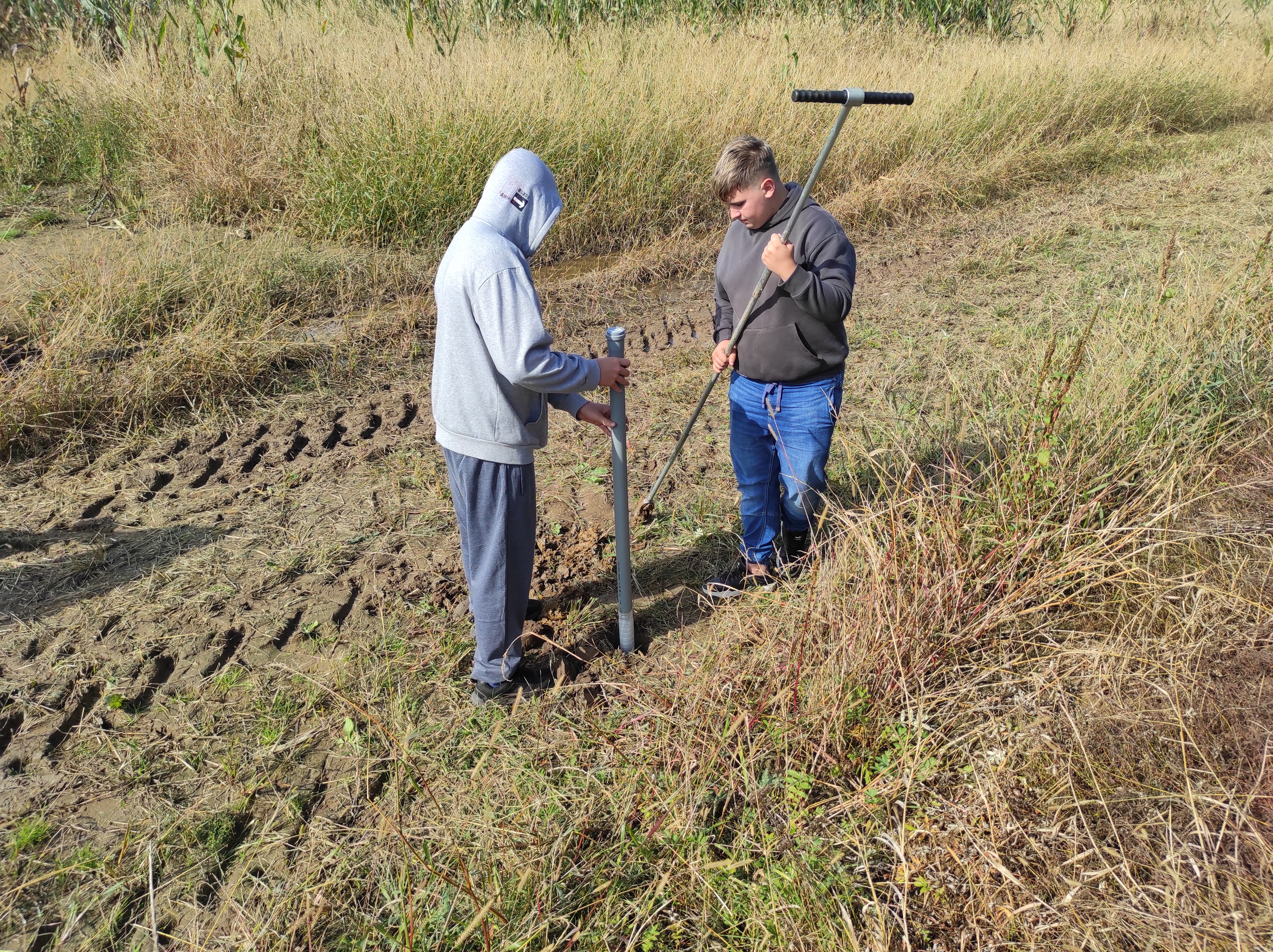 Po części teoretycznej nadszedł czas na najciekawsze zadanie – zamontowanie piezometrów w terenie oraz pobór próbek wody i ich analiza. Dzięki temu uczniowie mogli na własne oczy zobaczyć, jak w praktyce wygląda monitoring jakości wód i jakie znaczenie ma to w ochronie środowiska.