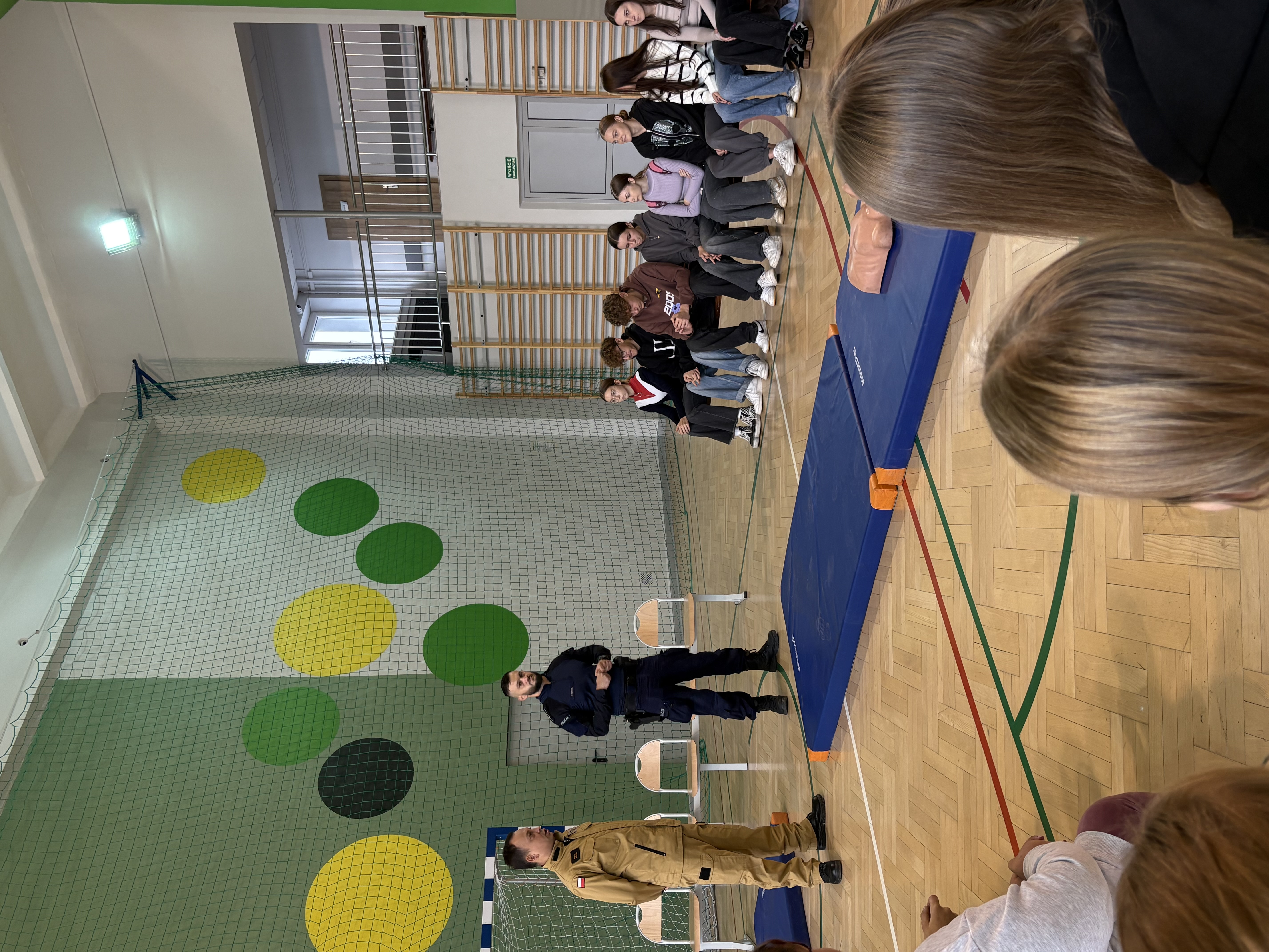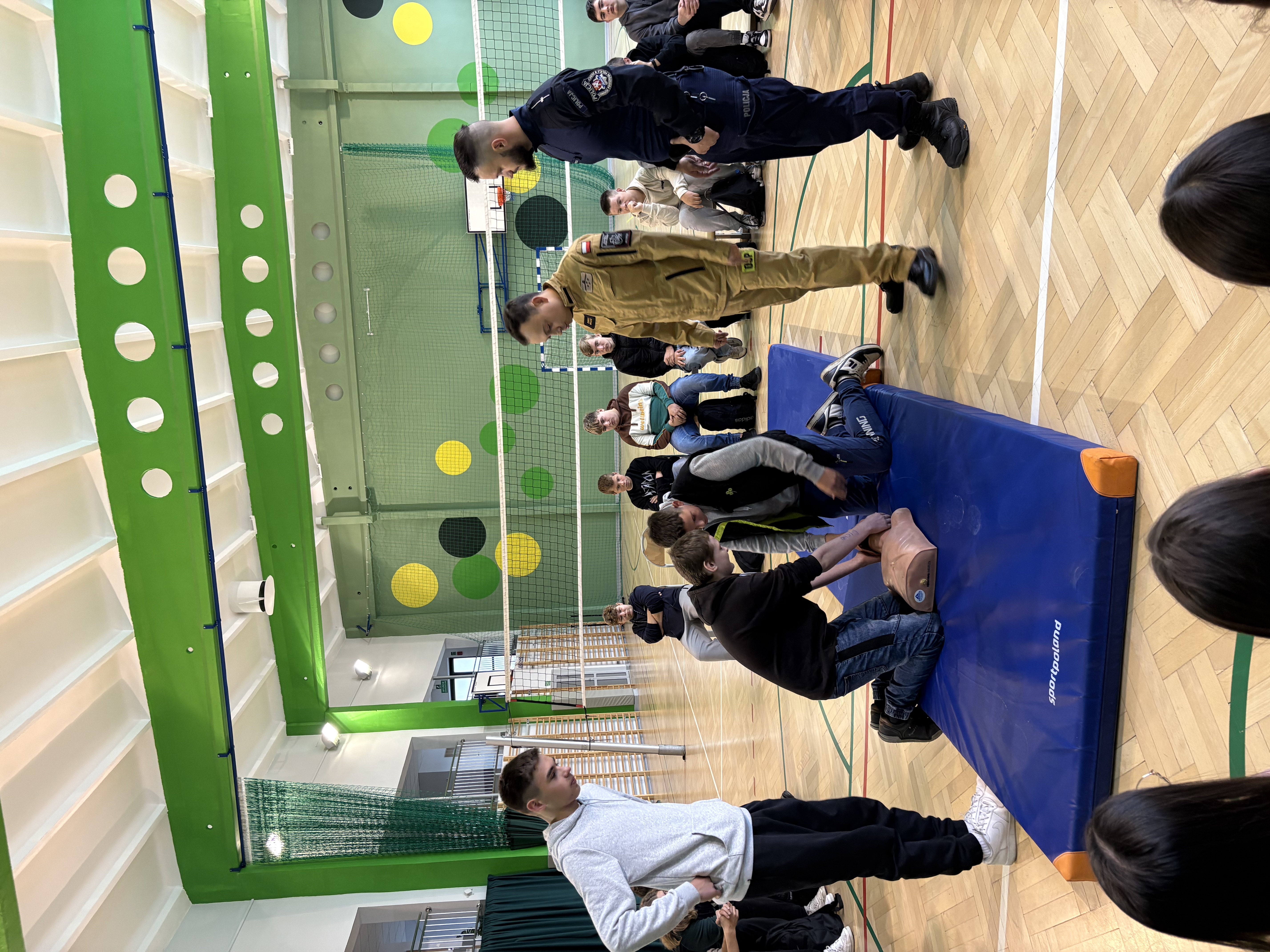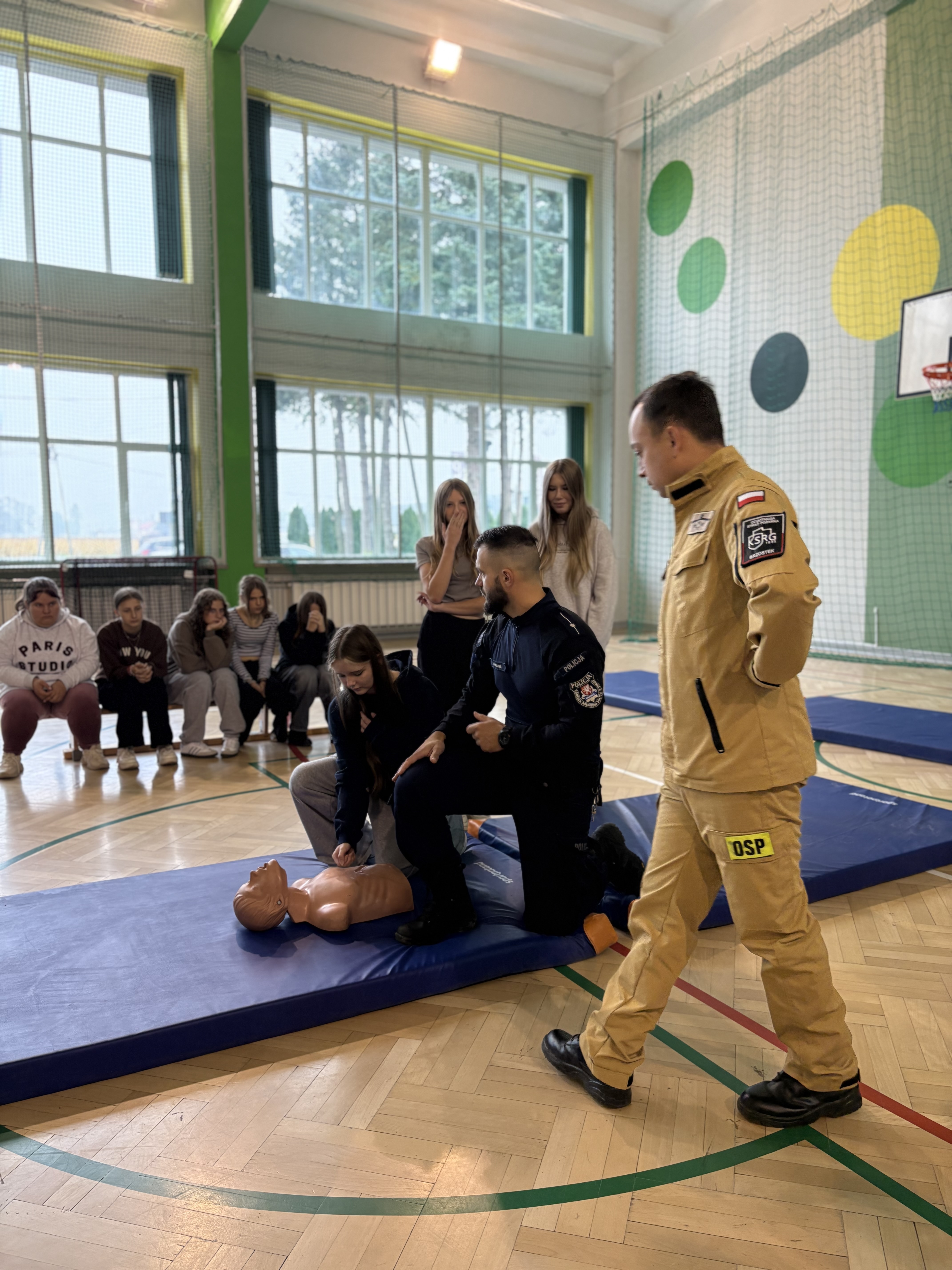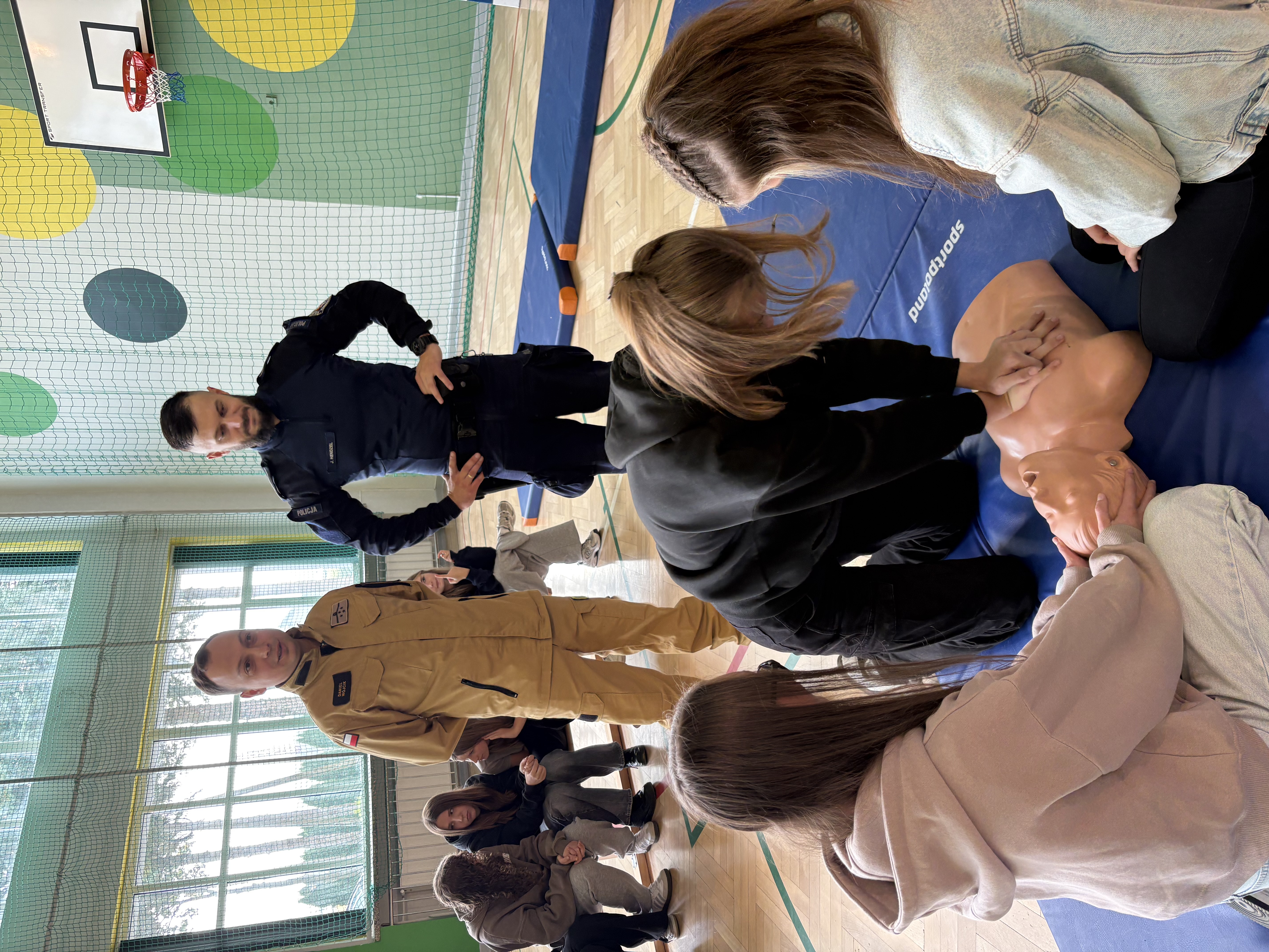 8.10.2025 r. funkcjonariusz policji asp. J. Hendzel i funkcjonariusz straży pożarnej D. Wójcik ćwiczyli z uczniami klas I udzielanie pierwszej pomocy.