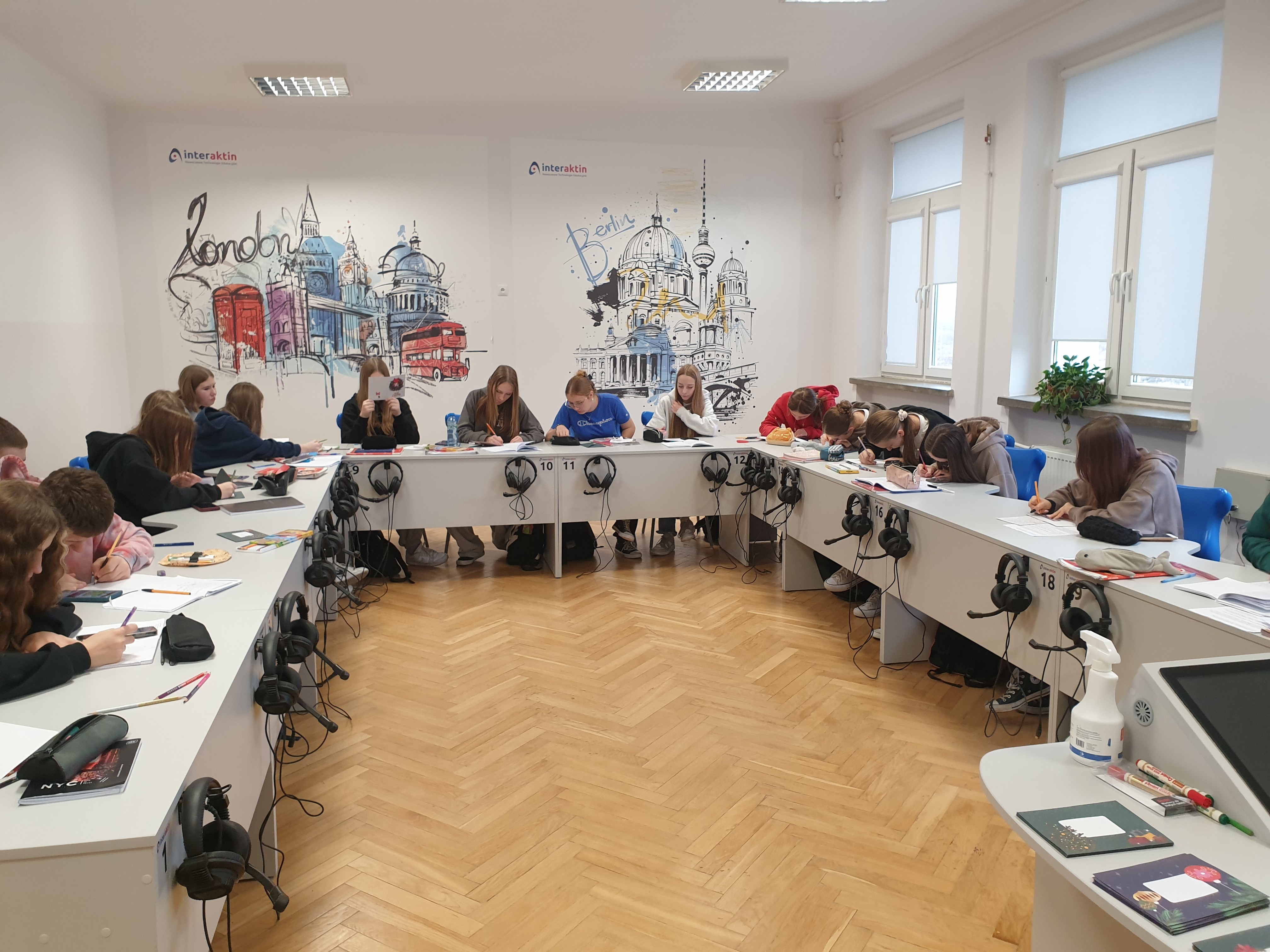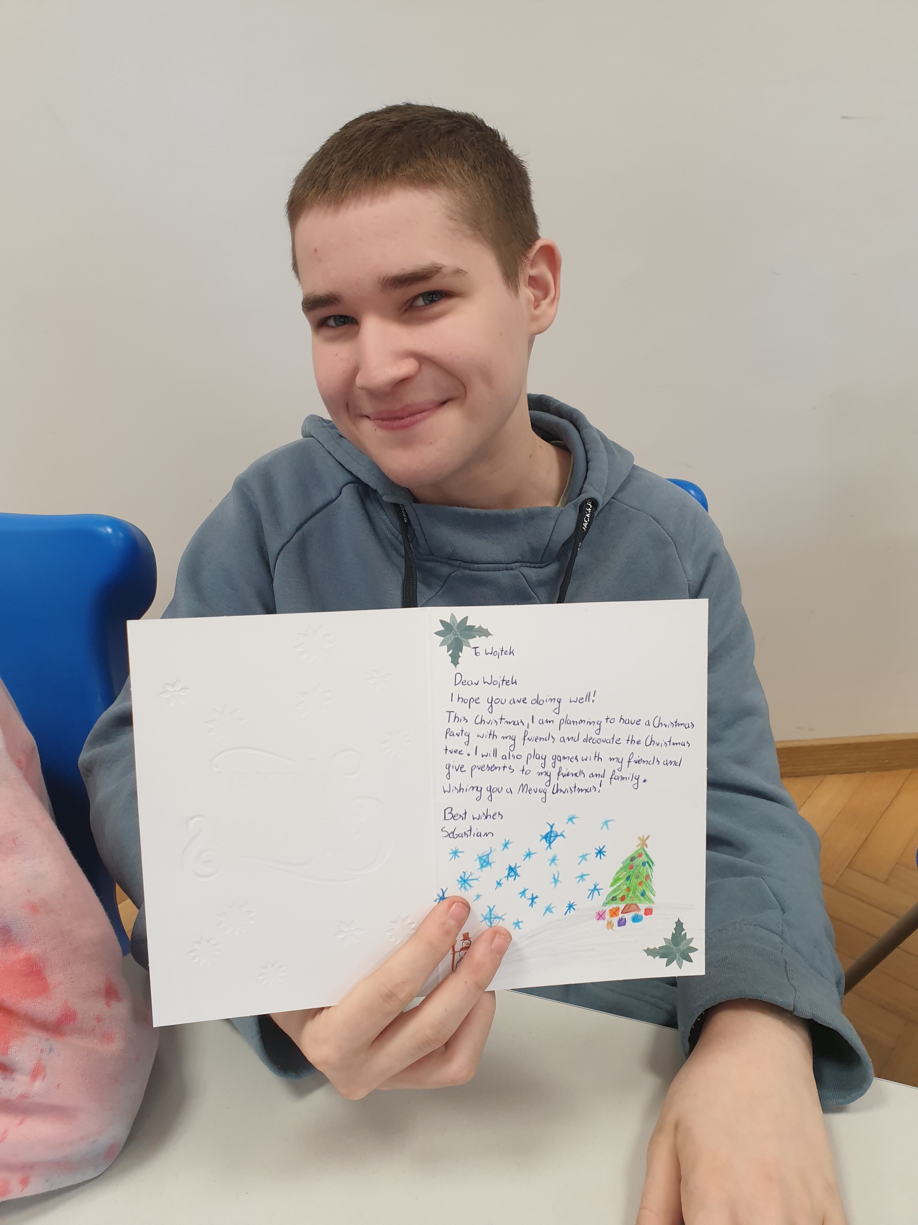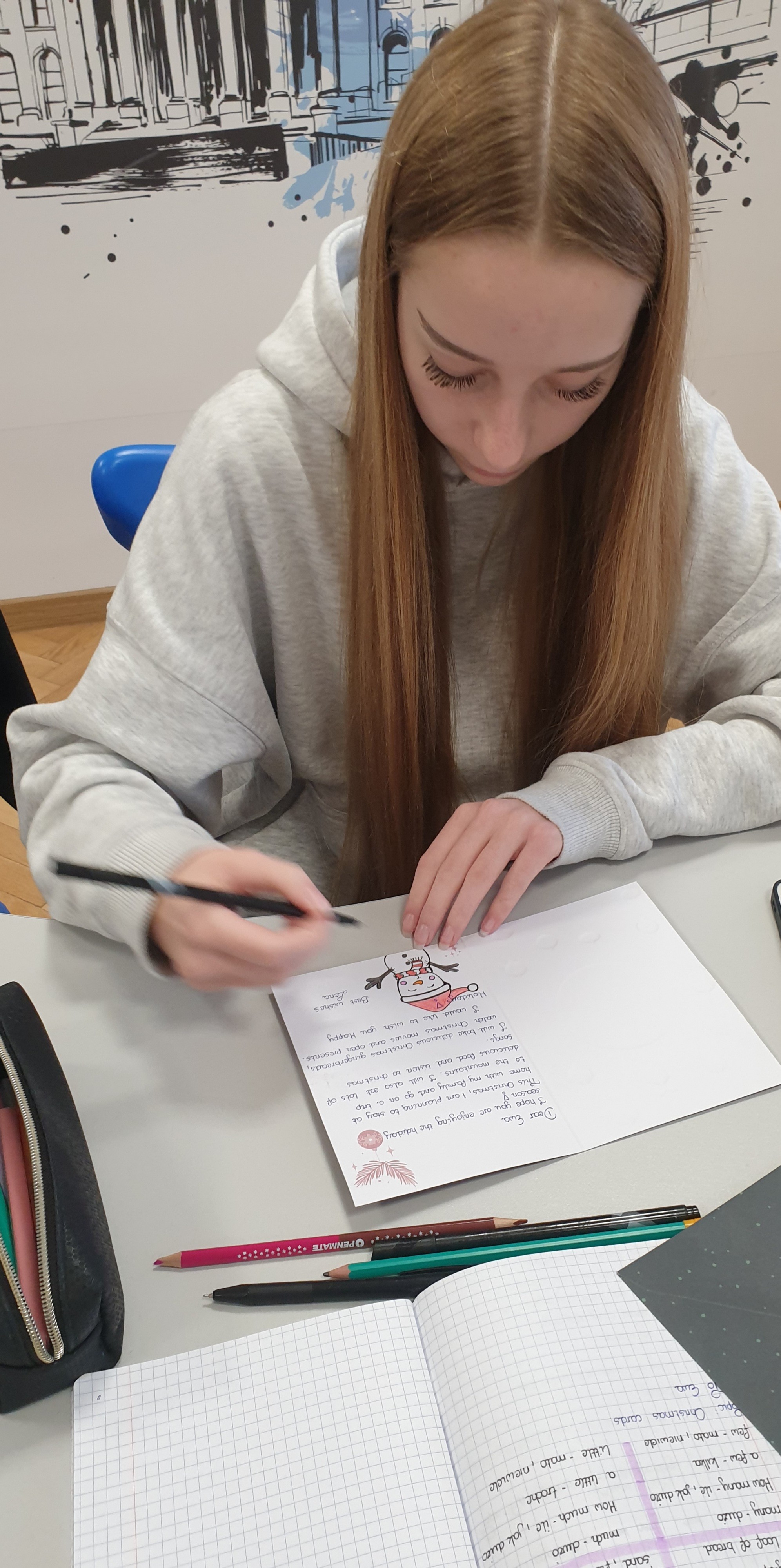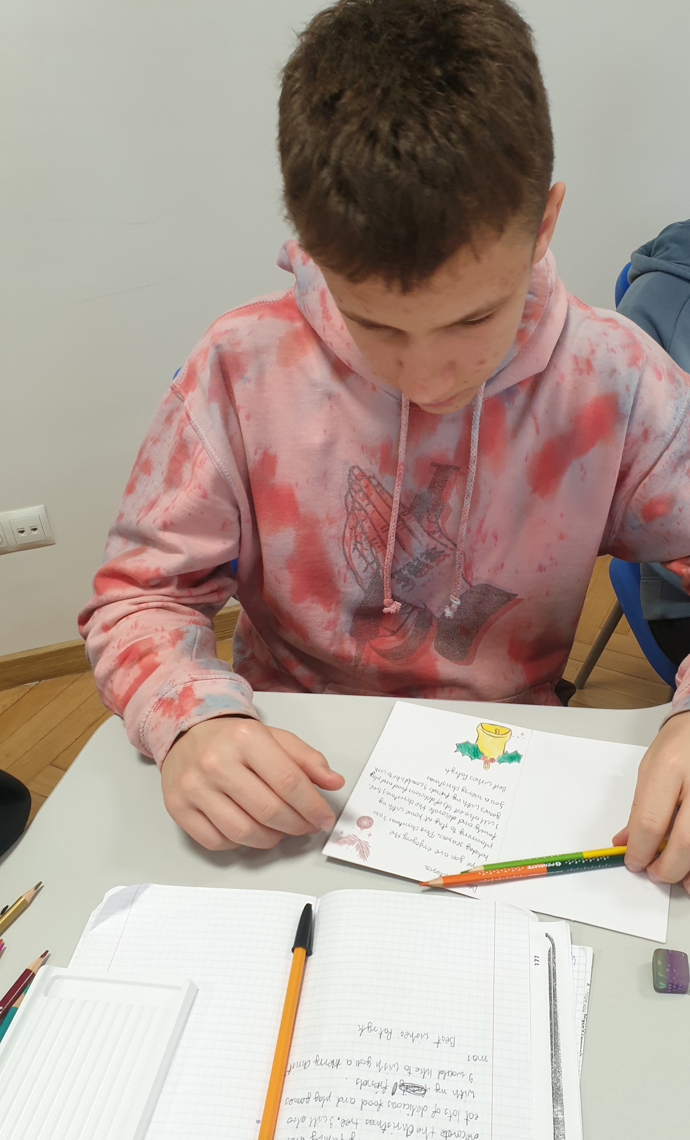Zajęcia rozpoczęły się od przypomnienia najważniejszego słownictwa i zwrotów związanych ze Świętami Bożego Narodzenia. Uczniowie utrwalili popularne życzenia i uczyli się jak poprawnie napisać kilka zdań o ich planach świątecznych. Następnie przyszedł czas na samodzielną pracę twórczą. Zadaniem uczniów było stworzenie kartki świątecznej, wykorzystując własną pomysłowość. Dzięki indywidualnemu podejściu każda kartka była inna i wyjątkowa, a wszystkie łączył świąteczny klimat i serdeczne życzenia.