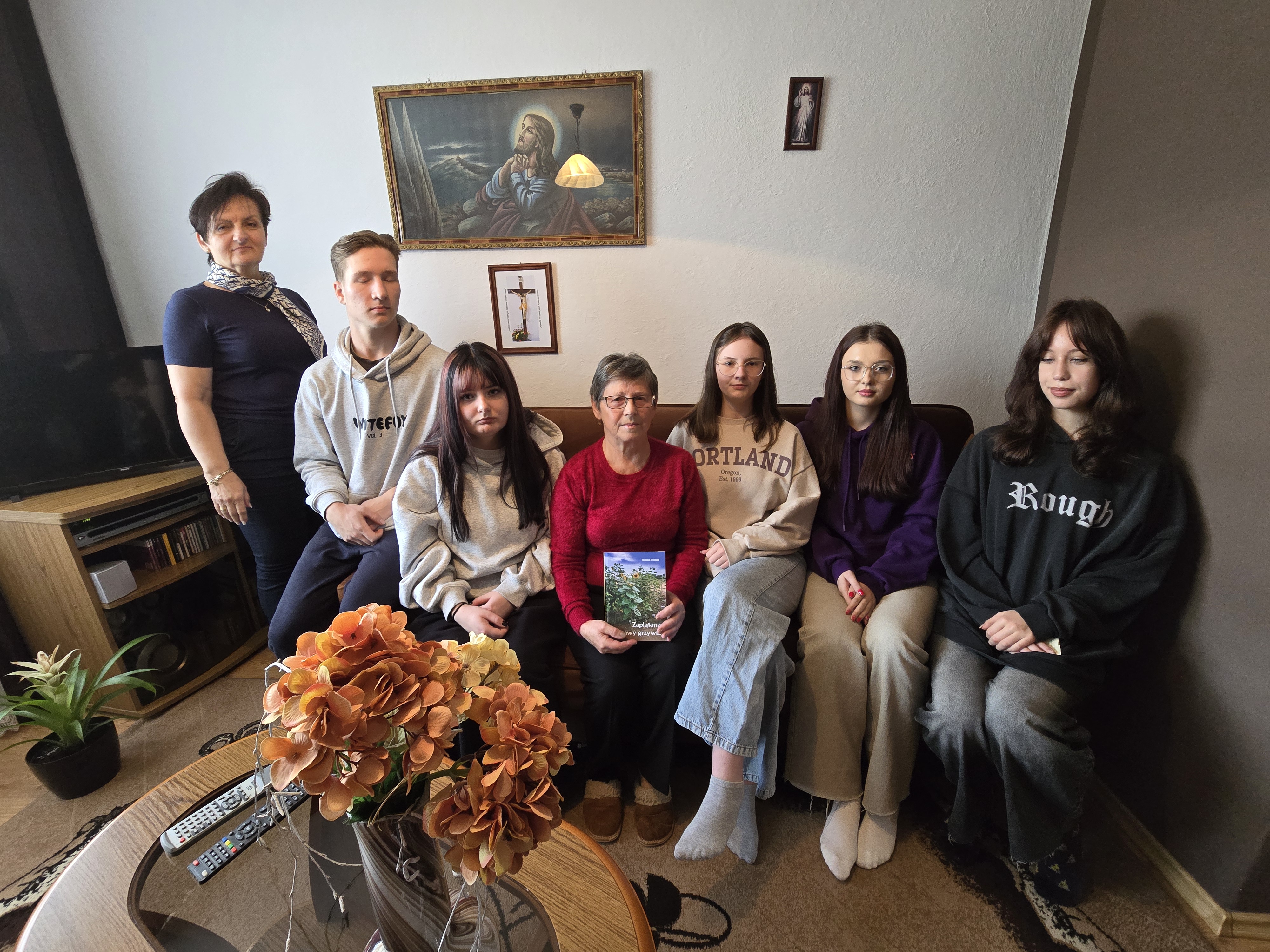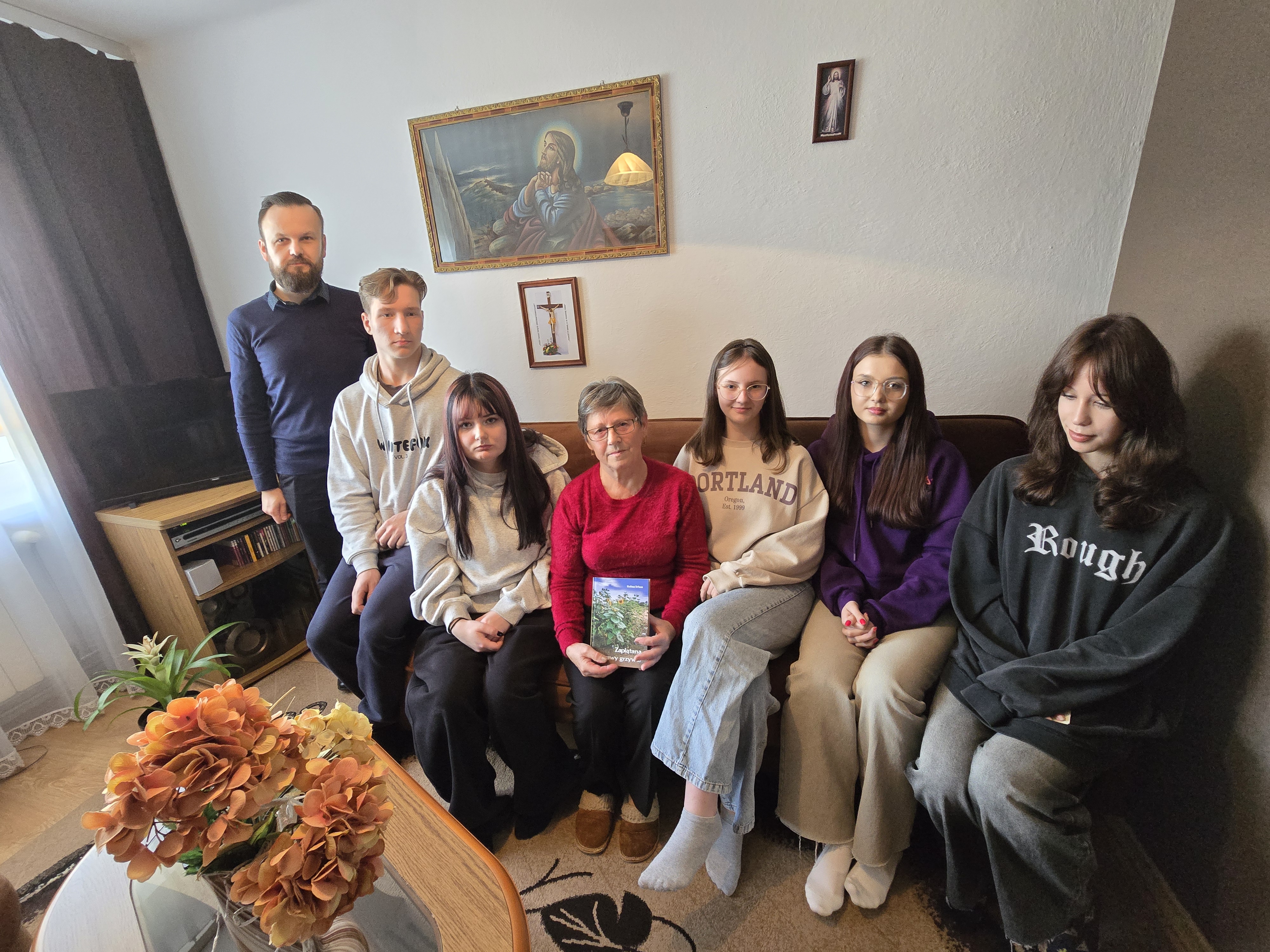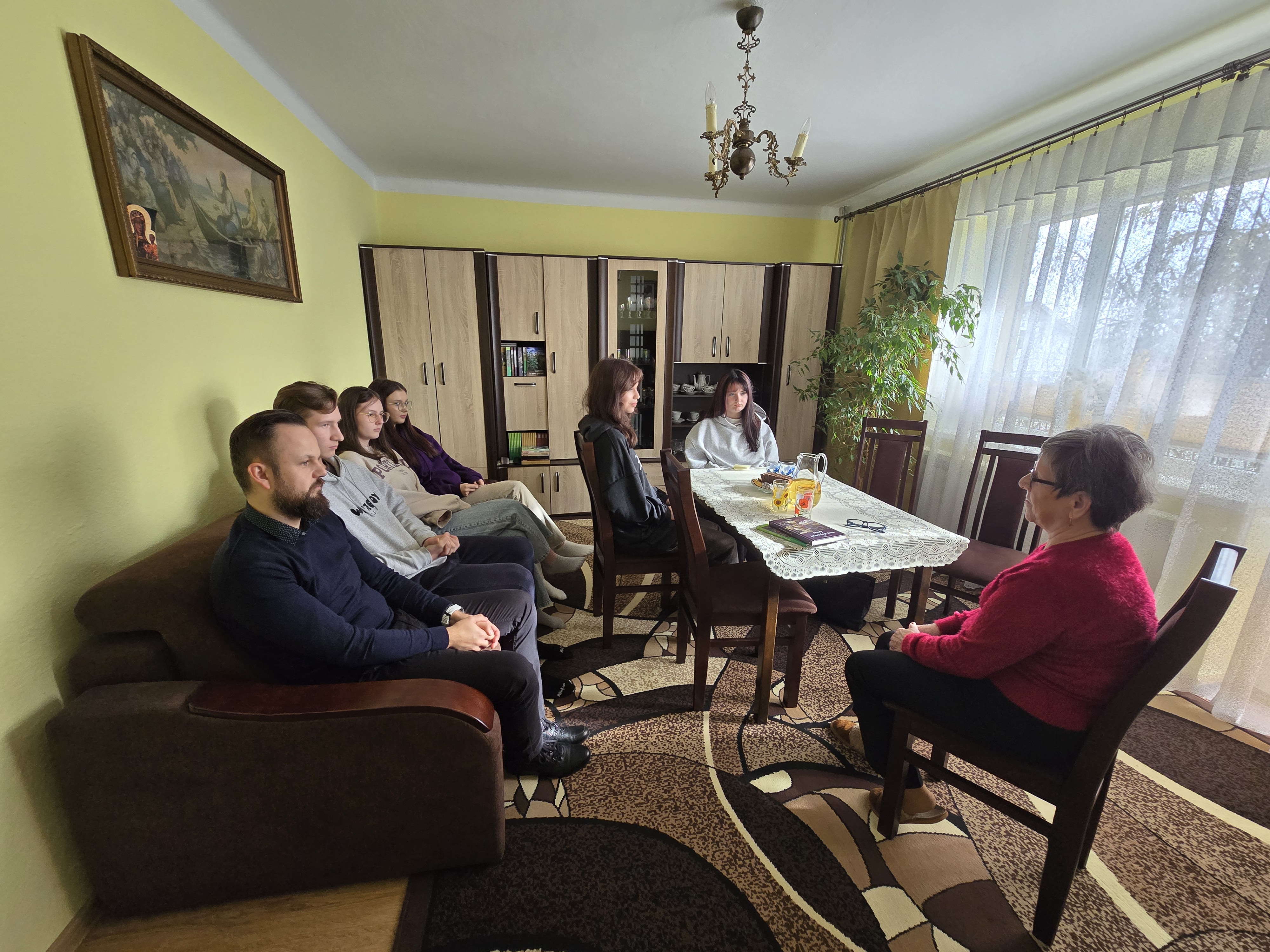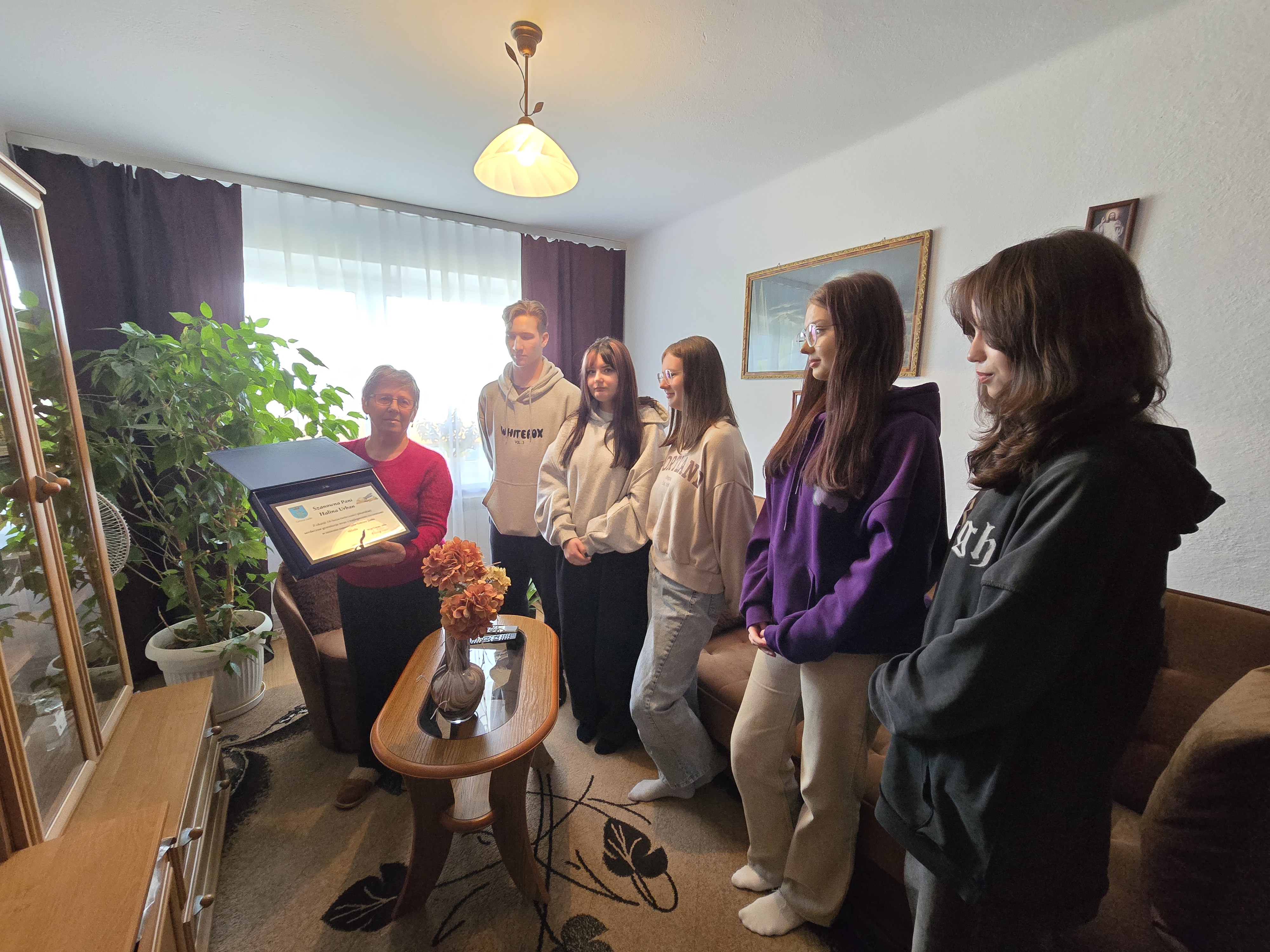 Podczas wizyty w swoim domu pani Halina Urban opowiedziała o swojej drodze twórczej, inspiracjach oraz emocjach towarzyszących pisaniu poezji. Uczniowie z dużym zainteresowaniem słuchali wypowiedzi poetki, a także zadawali wiele pytań. Interesowało ich m.in. jak powstaje pomysł na wiersz, czy pisanie zawsze wiąże się z nastrojem melancholii oraz jakie emocje towarzyszą autorce podczas publikacji nowych utworów. Poetka podkreślała, że każdy wiersz rodzi się z przeżycia - radości, wzruszenia, tęsknoty za bliskimi lub zachwytu nad światem. Z życzliwością odpowiadała na wszystkie pytania, zachęcając młodzież do rozwijania własnej wrażliwości i odwagi w wyrażaniu uczuć poprzez słowo. Uczniowie zgodnie przyznali, ze możliwość rozmowy w tak kameralnej, domowej atmosferze była dla nich wyjątkowym przeżyciem.