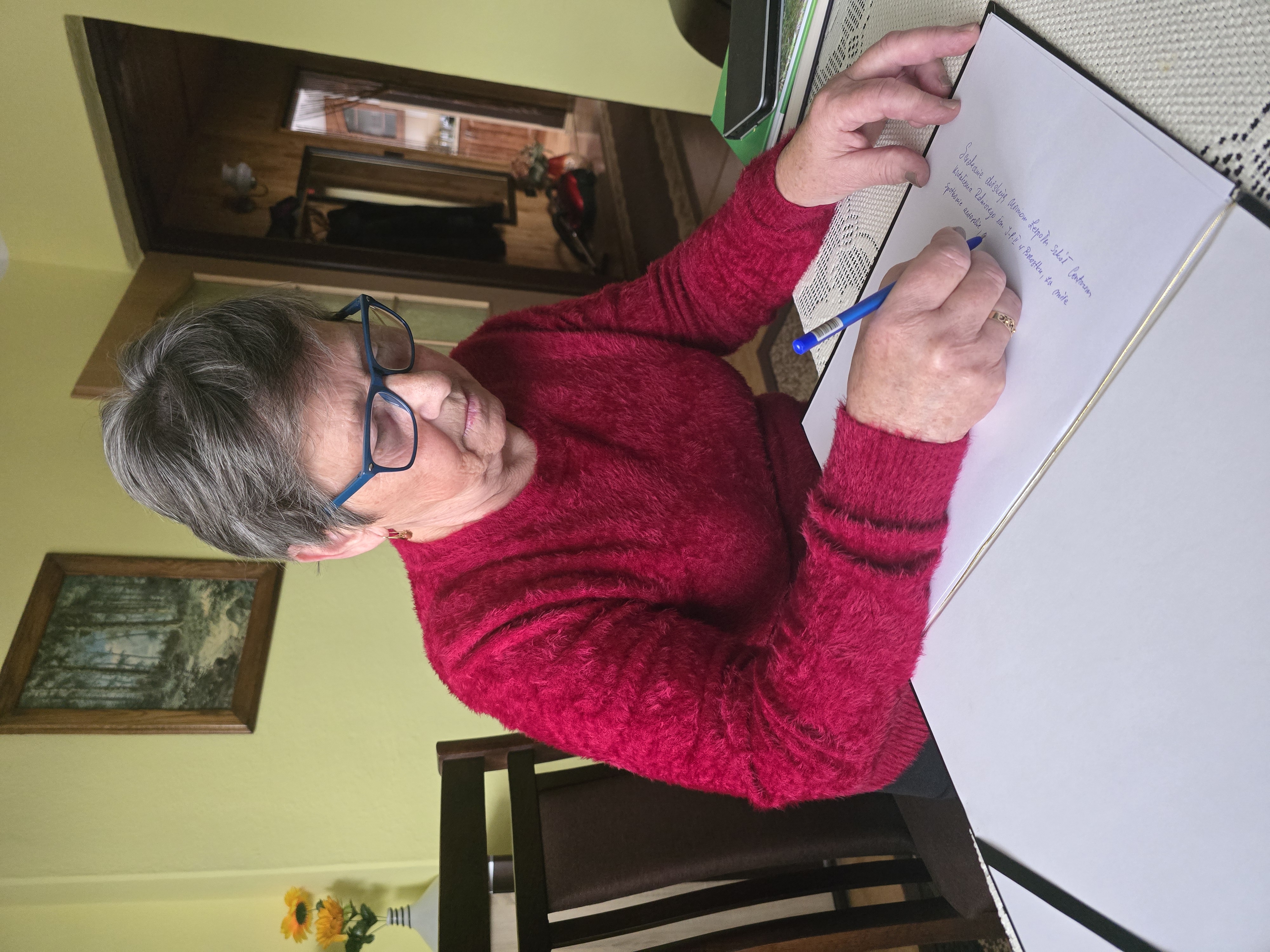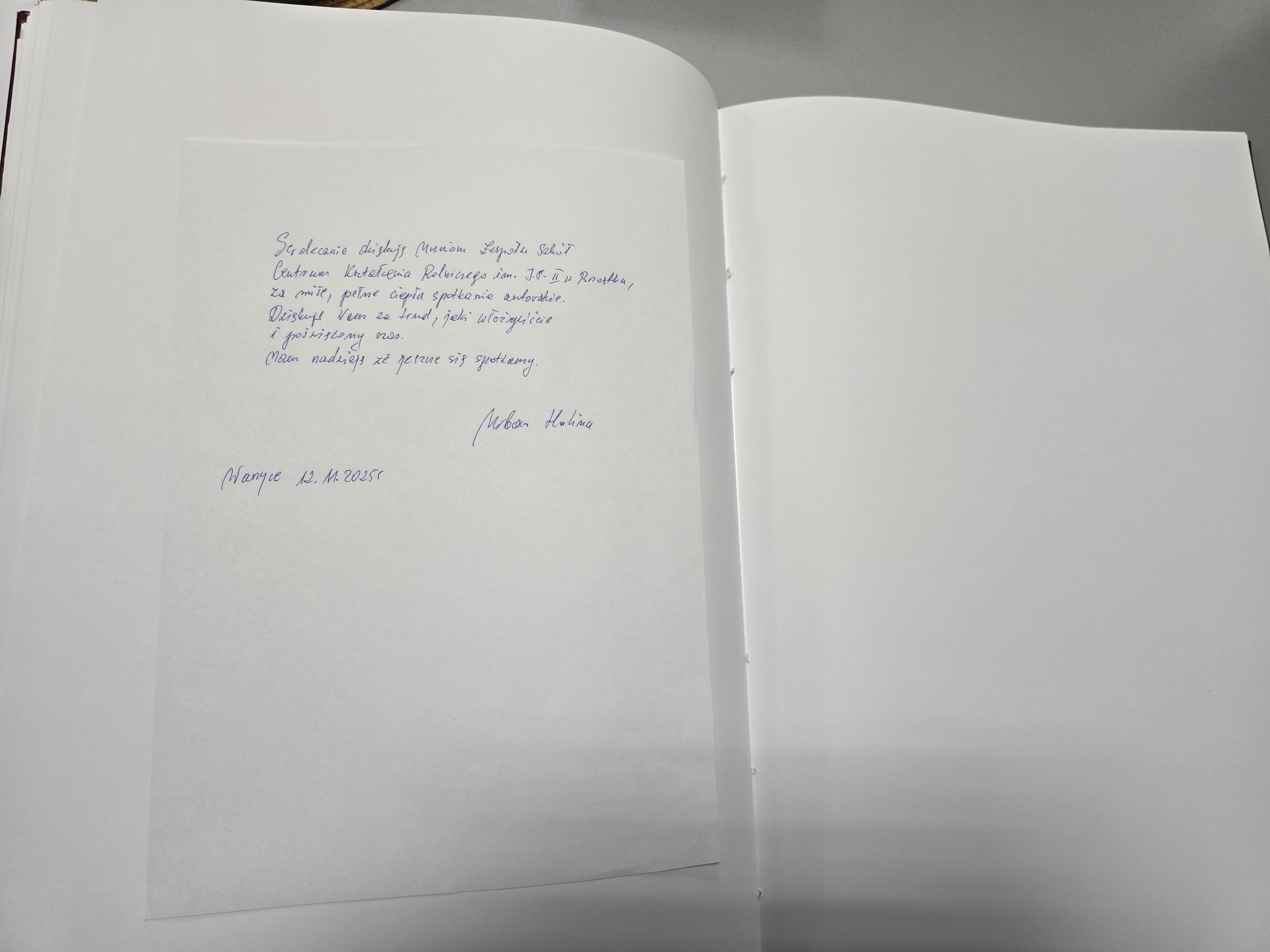 Na zakończenie spotkania Halina Urban dokonała pamiątkowego wpisu do kroniki szkolnej, dziękując za odwiedziny i zainteresowanie jej twórczością. Uczniowie serdecznie podziękowali pani Halinie Urban za gościnność i inspirujące rozmowy oraz możliwość zajrzenia za kulisy Jej twórczości.
