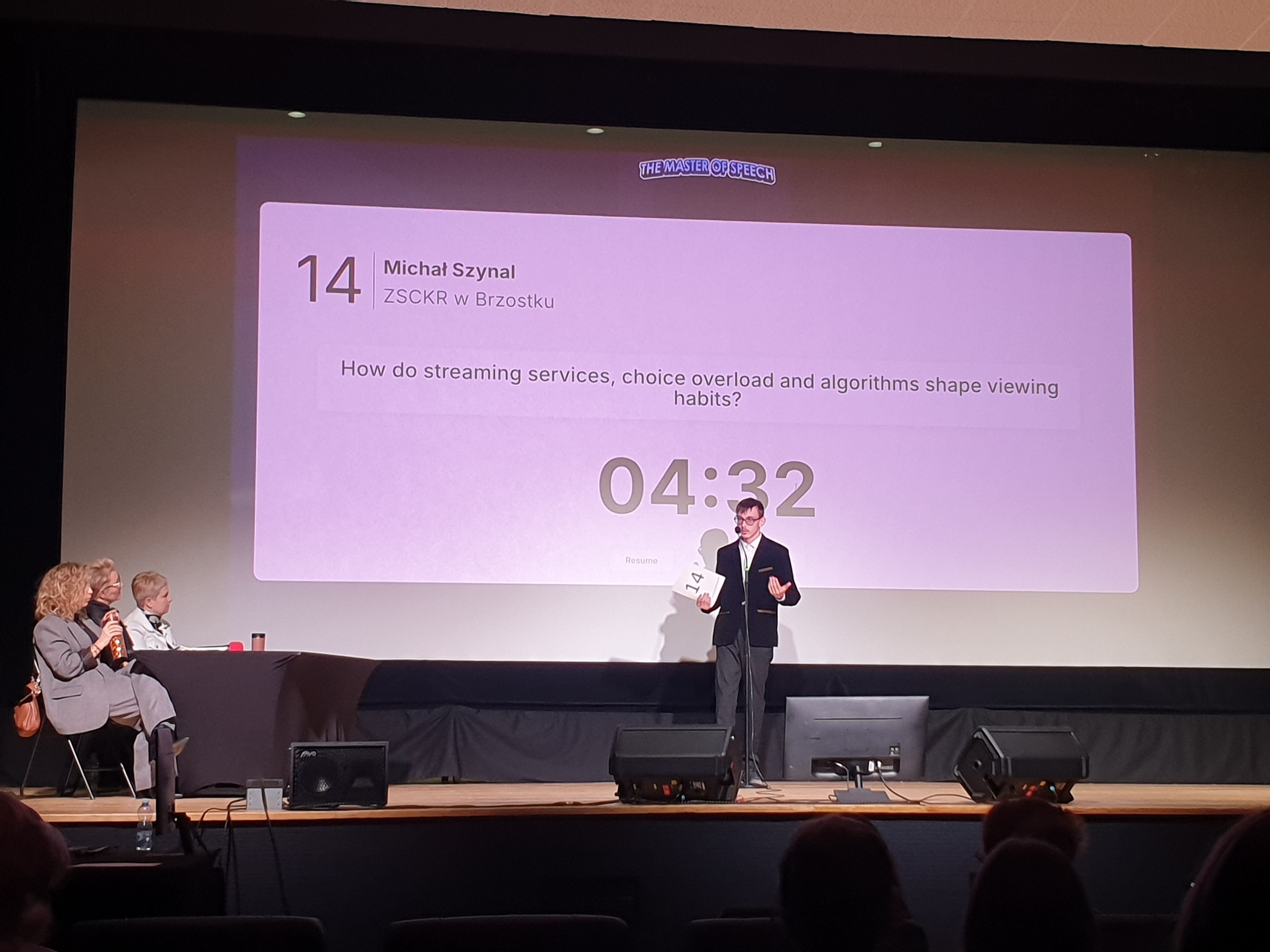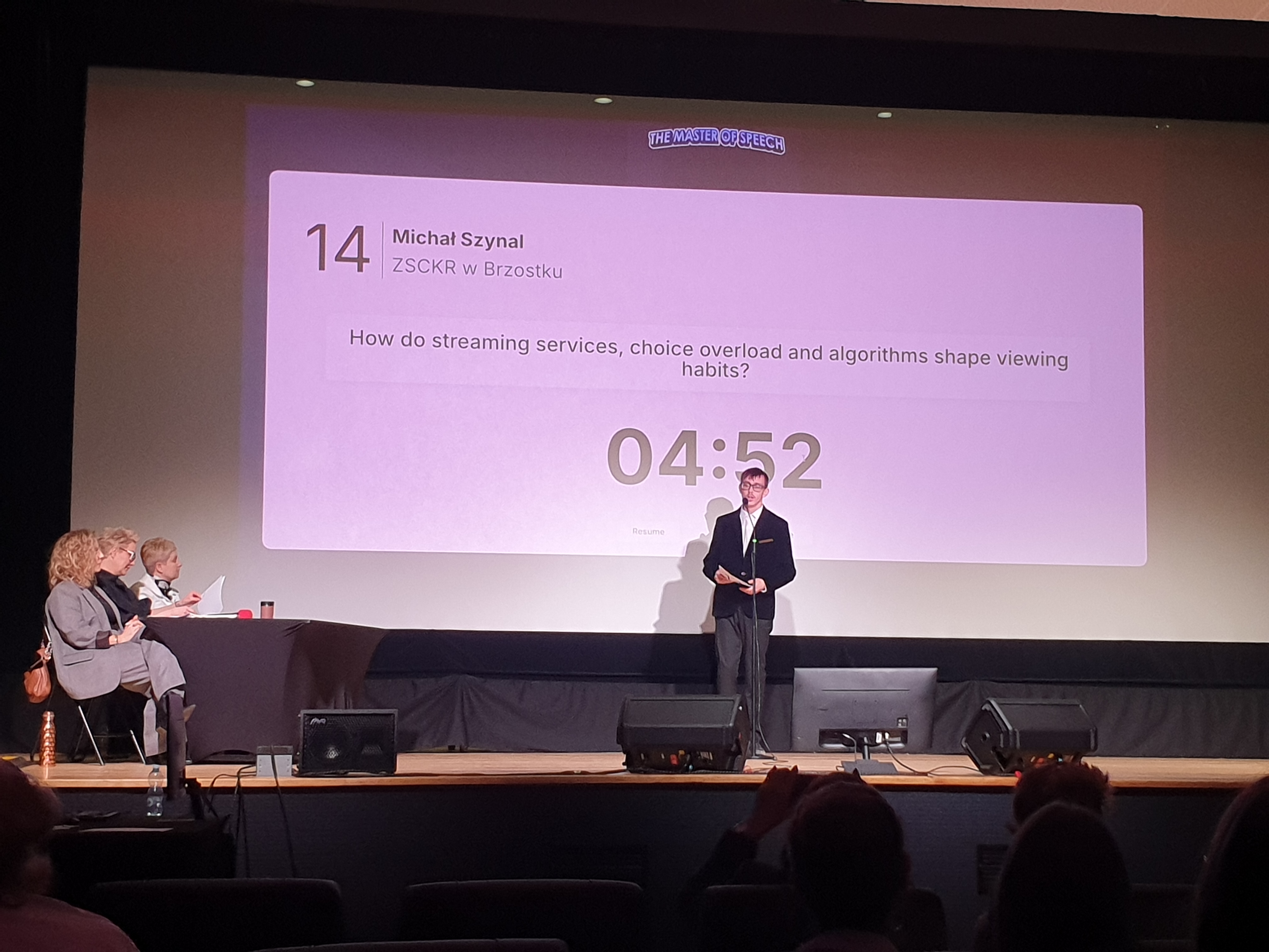 Michał Szynal wystąpił z przemówieniem pt. „How do streaming services, choice overload and algorithms shape viewing habits?”. W swojej prezentacji omówił wpływ platform streamingowych na sposób, w jaki odbiorcy konsumują treści filmowe i serialowe. Poruszył zagadnienia związane z nadmiarem wyboru oraz działaniem algorytmów, które podpowiadają użytkownikom określone produkcje. Michał w interesujący sposób przedstawił zarówno pozytywne aspekty personalizacji treści jak i zagrożenia wynikające z ograniczania różnorodności oglądanych materiałów. Jego wypowiedź była rzeczowa, nowoczesna tematycznie i bardzo dobrze zaprezentowana pod względem językowym.
