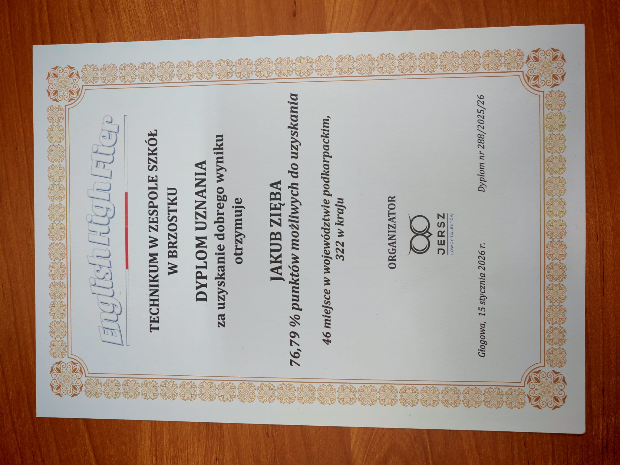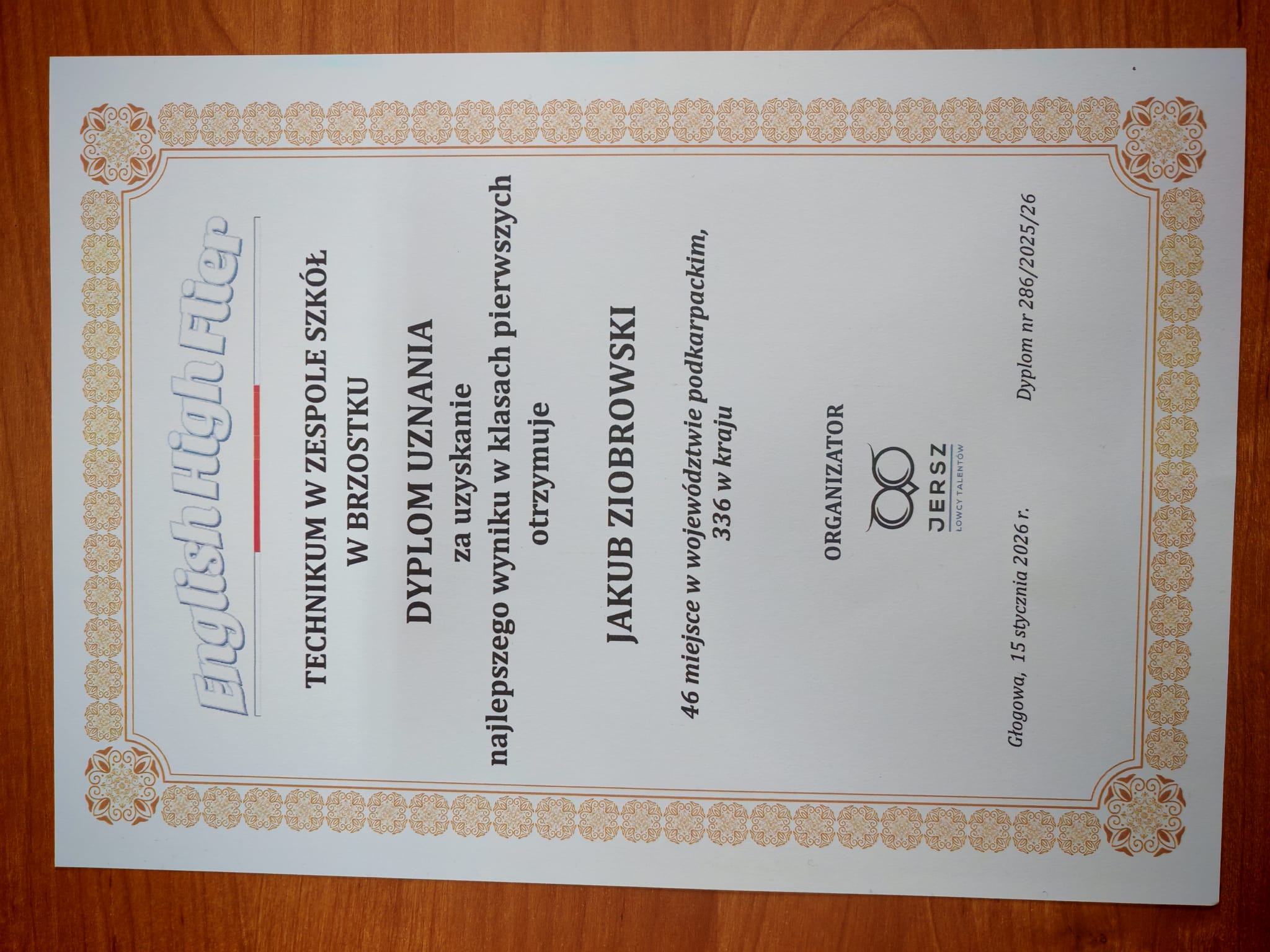 W dniu 3.12.2025 uczniowie naszej szkoły wzięli udział w ogólnopolskim konkursie z języka angielskiego „English High Flier”, organizowanym przez ŁOWCY TALENTÓW JERSZ. Konkurs skierowany jest do uczniów szkół ponadpodstawowych i charakteryzuje się wysokim poziomem trudności, wymagającym od uczestników bardzo dobrej znajomości języka angielskiego oraz umiejętności logicznego myślenia. Ma on formę testu wielokrotnego wyboru, co dodatkowo podnosi stopień trudności zadań.