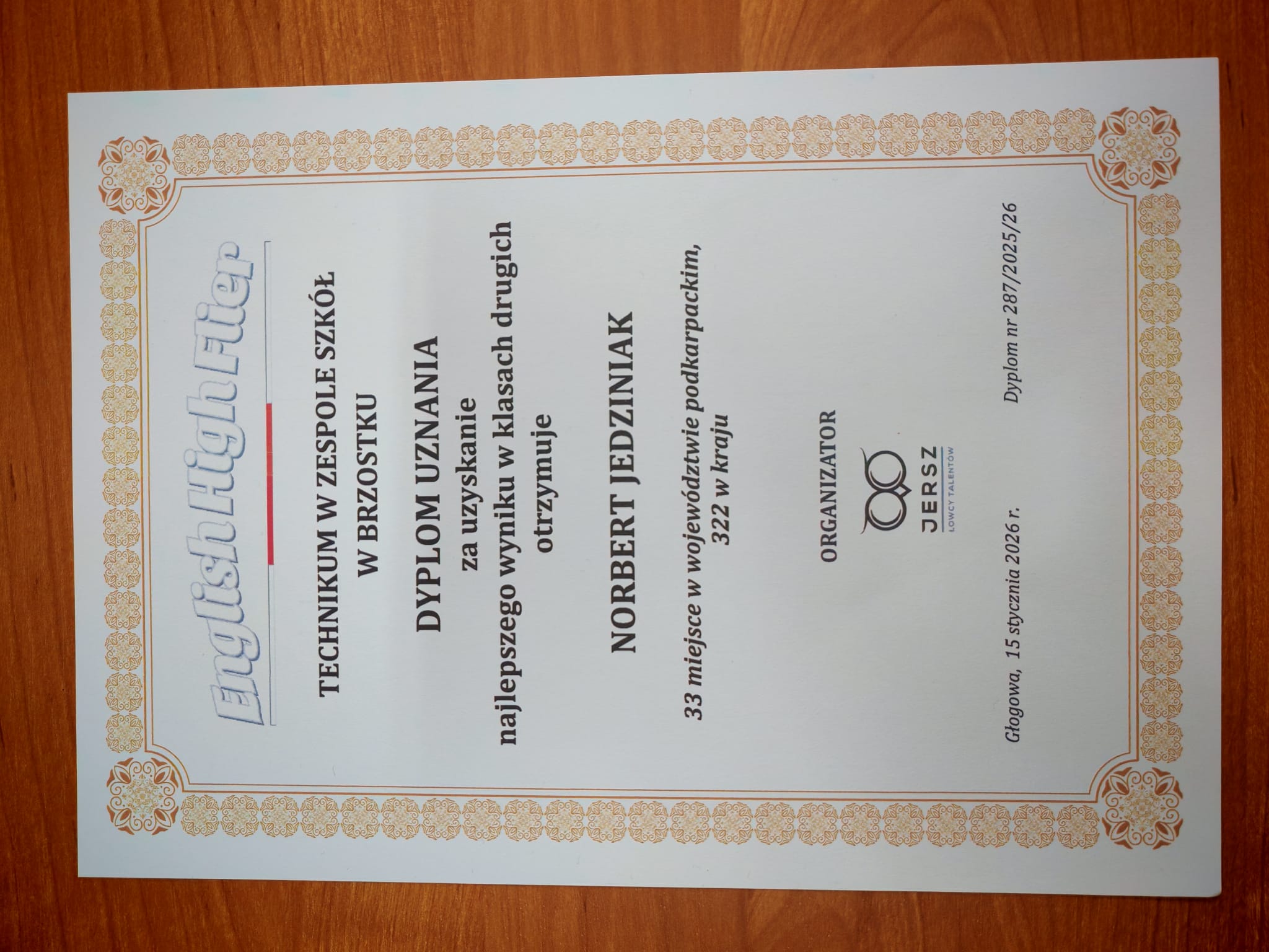 Norbert Jedziniak klasa II TW (klasy 2) – 33 miejsce w województwie i 322 w kraju