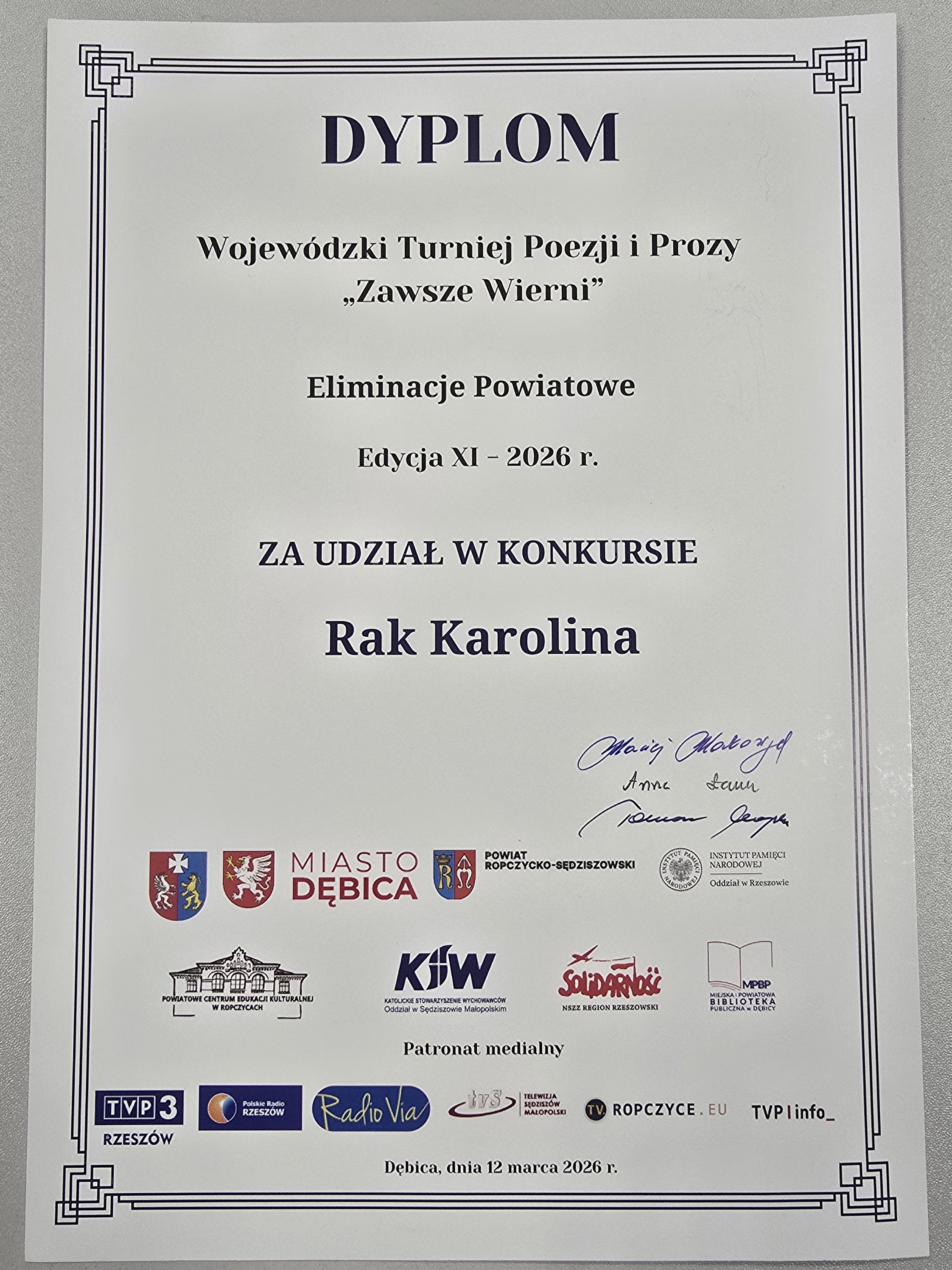 Uczennica klasy III TW Karolina Rak wzięła udział w XI Wojewódzkim Turnieju Poezji i Prozy „Zawsze Wierni” – wydarzeniu, które stanowi wyjątkowy hołd dla osób wiernych ideom wolności, honoru oraz życia zgodnego z najwyższymi wartościami i umiłowaniem Ojczyzny. Konkurs ma na celu upamiętnienie bohaterów najnowszej historii Polski oraz kształtowanie postaw patriotycznych wśród młodego pokolenia.