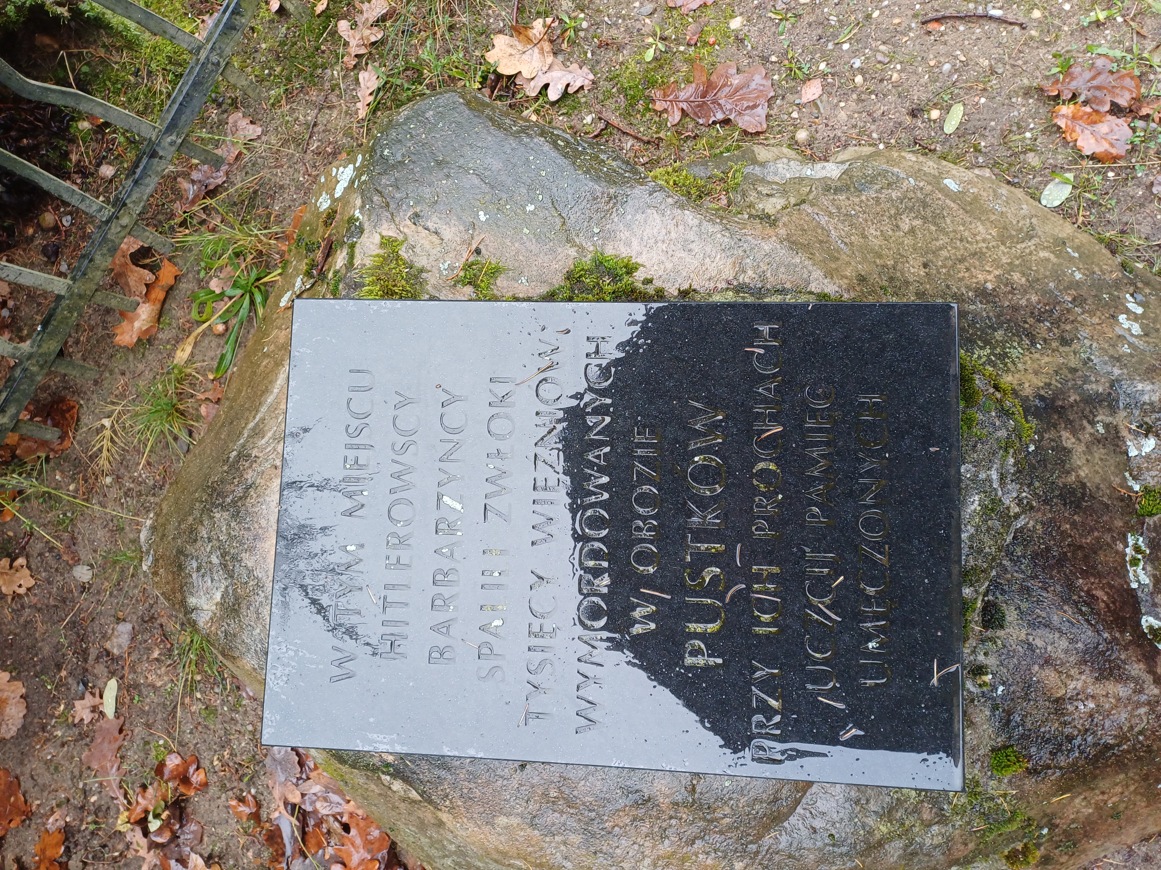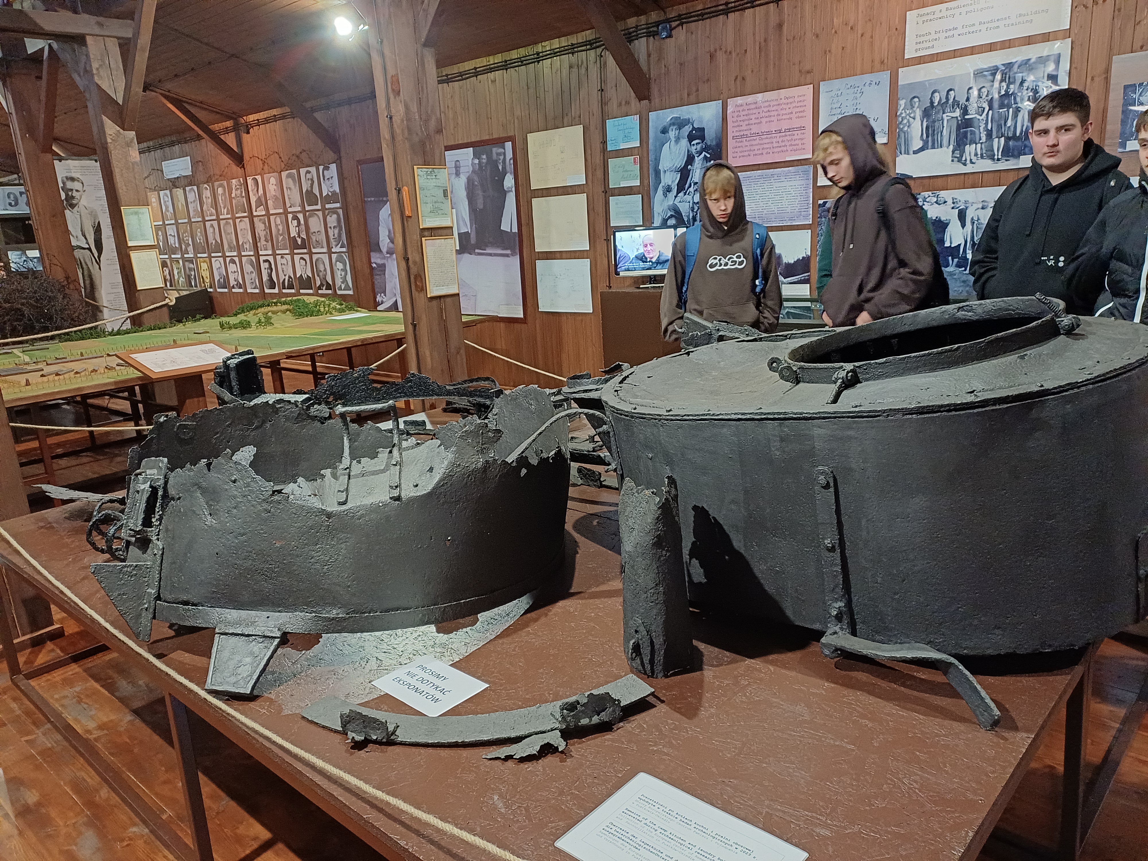 Kolejnym etapem naszej wycieczki była Ekspozycja Historyczno - Dydaktyczna u stóp wzgórza “Góry Śmierci” w Pustkowie Osiedlu. To rekonstrukcja bramy obozu faszystowskiego, baraków i ogrodzenia, które znajdują się na obszarze dawnego hitlerowskiego poligonu wojskowego „SS Truppen-Übungs-Platz Heidelager” i funkcjonujących tam obozów pracy przymusowej, w których zginęło ponad piętnaście tysięcy osób (Polaków, Żydów i Rosjan). Wystawa ukazuje tragedię II wojny światowej w wymiarze indywidualnym i zbiorowym, również codzienność okupacji utrwaloną w zwykłych przedmiotach, fotografiach, gazetach, dokumentach osobistych i urzędowych. Obiekt stanowi integralną część Europejskiego Centrum Pamięci i Pojednania w Pustkowie Osiedlu. Po zwiedzaniu muzeum udaliśmy się na Górę Śmierci (Królową Górę), na której w okresie wojny wybudowano palenisko kremacyjne, służące do palenia zwłok zmarłych oraz okrutnie zamordowanych więźniów. Mogliśmy zobaczyć tam Pomnik Ku Czci Pomordowanych, krzyż przy palenisku, strzelnicę, a także piwnicę do składania ciał zamordowanych.