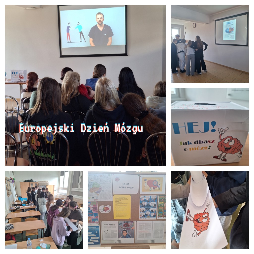 W marcu uczniowie klas I uczestniczyli w warsztatach, prelekcji na temat funkcjonowania mózgu, które przeprowadzone zostały przez szkolnych specjalistów. Zwrócono uwagę na działanie mózgu u osób neuroróżnorodnych. Uczennice klas trzecich: Małgorzata Matczak, Nikola Nowicka, Zuzanna Gawron przeprowadziły wraz z pedagogiem specjalnym zajęcia na godzinie wychowawczej o tematyce poświęconej neuroplastyczności mózgu. Był czas na rozmowę "Jak dbasz o swój mózg?". Zaproponowane ćwiczenia miały na celu uświadomienie młodzieży, jak ważne jest dbanie o mózg. Były to ćwiczenia wspierające działanie mózgu z elementami kinezjologii edukacyjnej. Zwrócono uwagę na relacje interpersonalne , jako ważny element-neurobiologiczny, który wpływa na strukturę i funkcjonowanie mózgu. Uczniowie mieli możliwość aktywnie uczestniczyć w treningu komunikacji grupowej. Młodzież naszej szkoły wzięła udział w konkursie plastycznym "Historia mózgu" oraz w przygotowaniu sałatki klasowej. Wszystkie działania zostały przeprowadzone w ramach Europejskiego Dnia Mózgu.
