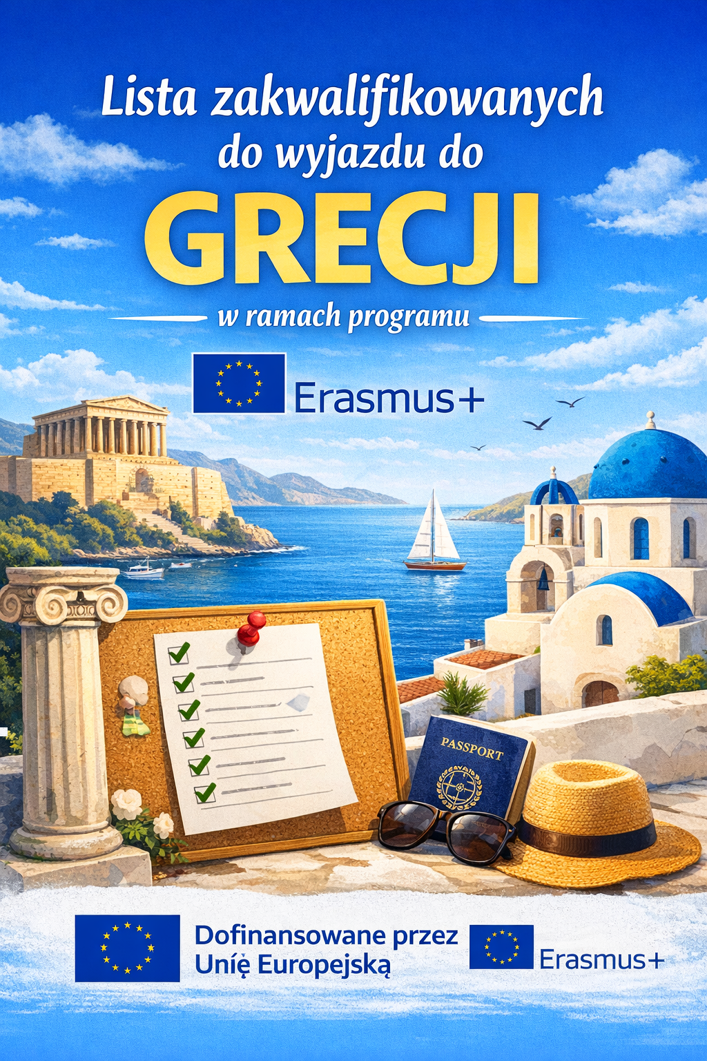 Z przyjemnością informujemy, że w dniu dzisiejszym 27.02.2026 została ogłoszona lista osób zakwalifikowanych do wyjazdu do Grecji w ramach programu Erasmus+. Projekt NR 2025-1-PL-01-KA121-VET000310634
