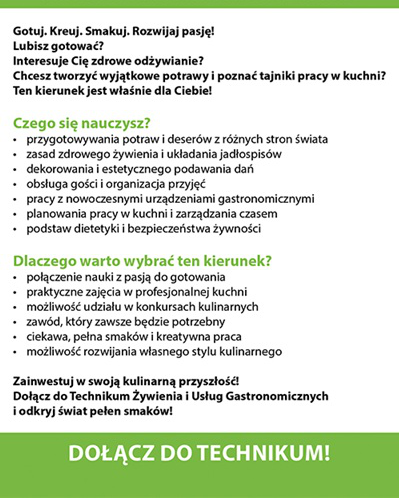 To zawód , który daje wiele możliwości zawodowych i rozwijania zainteresowań kulinarnych. Kształtuje umiejętności związane z planowaniem i organizacją żywienia w zakładach żywienia zbiorowego i żywienia rodziny.