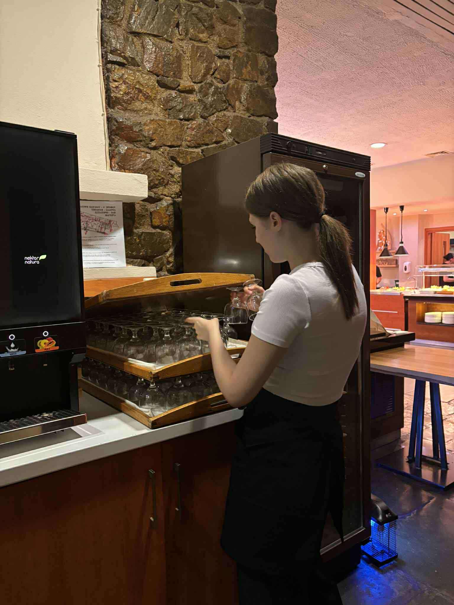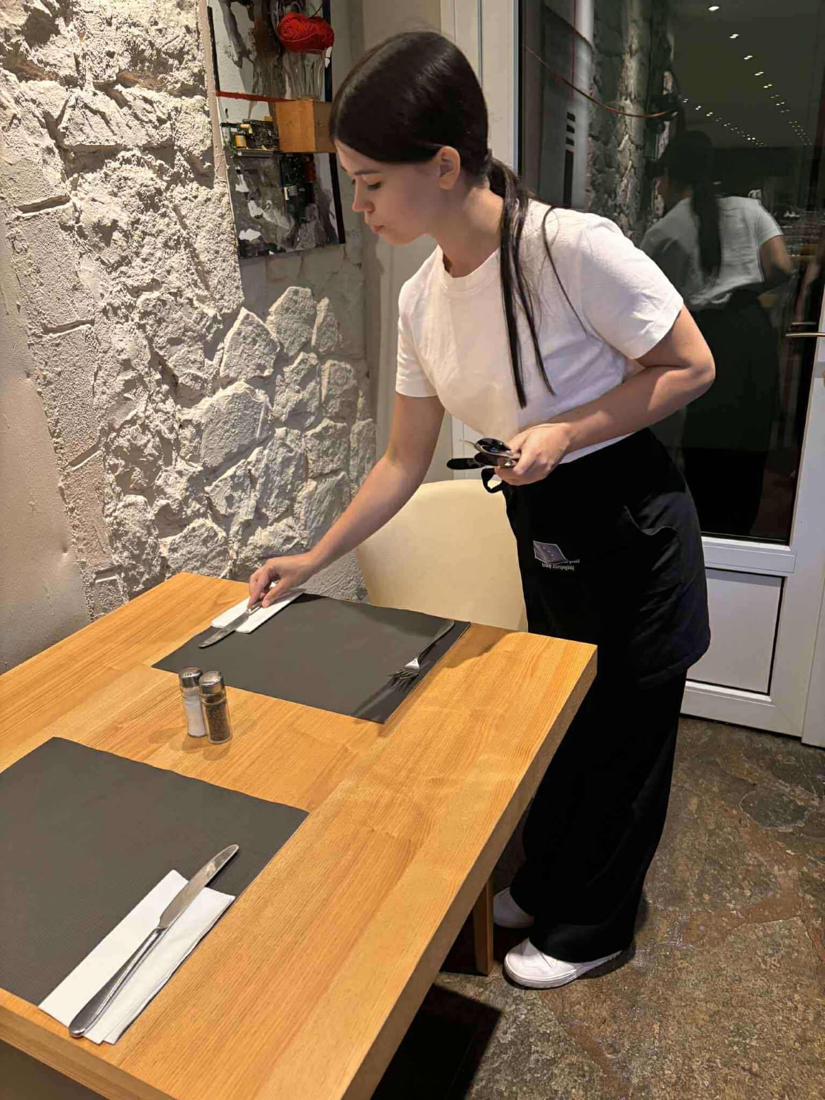 Technik usług gastronomicznych�Gastronomowie dbali o restaurację hotelową przygotowywali stoły, składali serwetki i uzupełniali wodę w dzbankach, dzięki czemu sala była elegancka i gotowa na gości.
