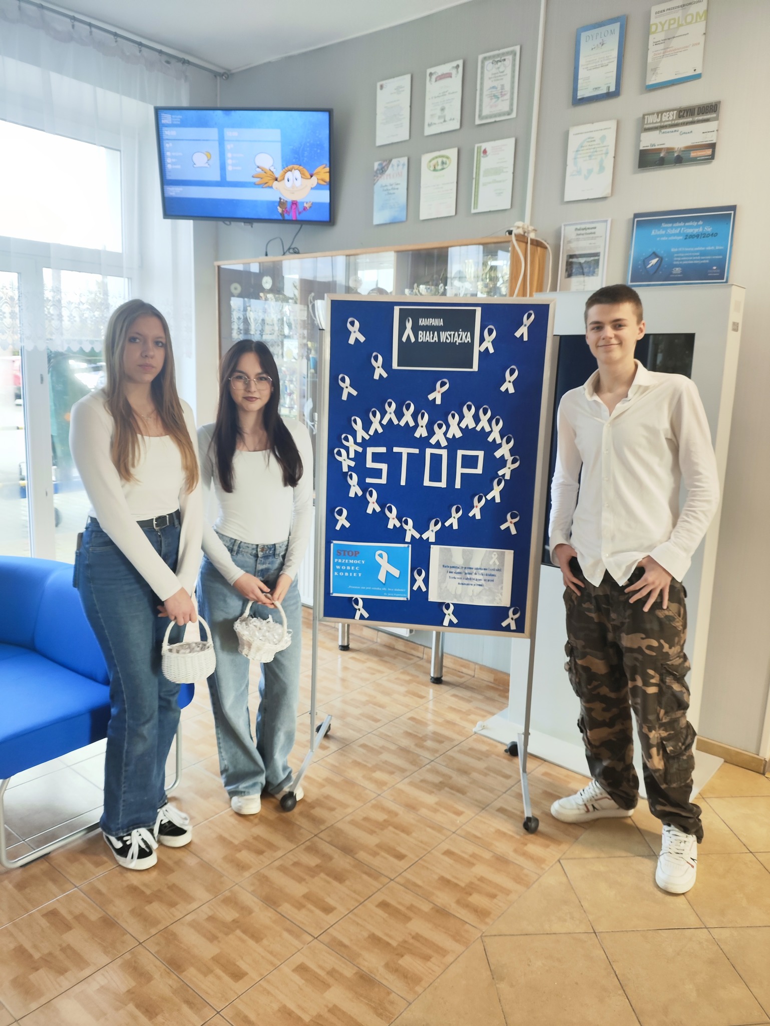 We wtorek 9 grudnia nasza szkoła włączyła się w międzynarodową Kampanię Białej Wstążki, największą na świecie inicjatywę mającą na celu przeciwdziałanie przemocy wobec kobiet i dziewcząt. Symbolem kampanii jest biała wstążka, którą noszą osoby deklarujące sprzeciw wobec wszelkich form przemocy oraz zobowiązujące się do reagowania na jej przejawy. W ramach solidarności, wolontariusze przypinali białe wstążki społeczności szkolnej.