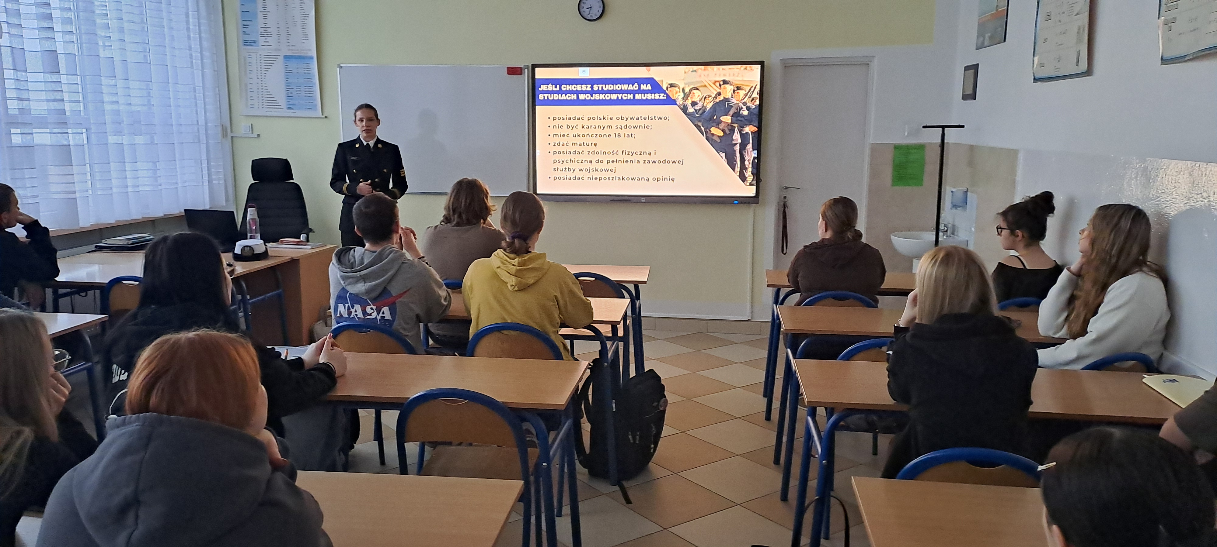 Ciekawa prezentacja multimedialna przedstawiona podczas spotkania pozwoliła uczniom poznać szczegóły pracy żołnierza od marynarza do bosmana. Zostały rozdane również foldery z informacjami związanymi z Akademią Marynarki Wojennej oraz służbą wojskową.