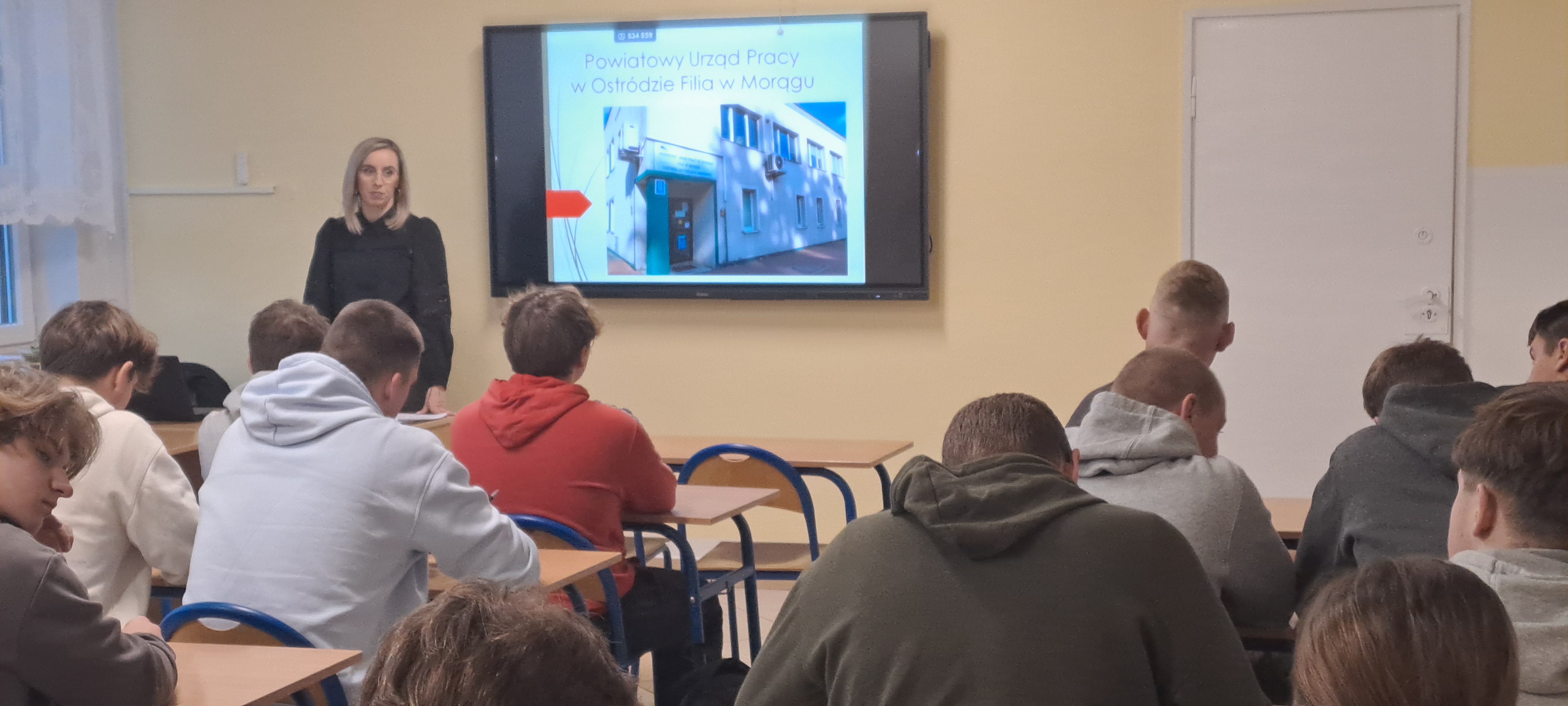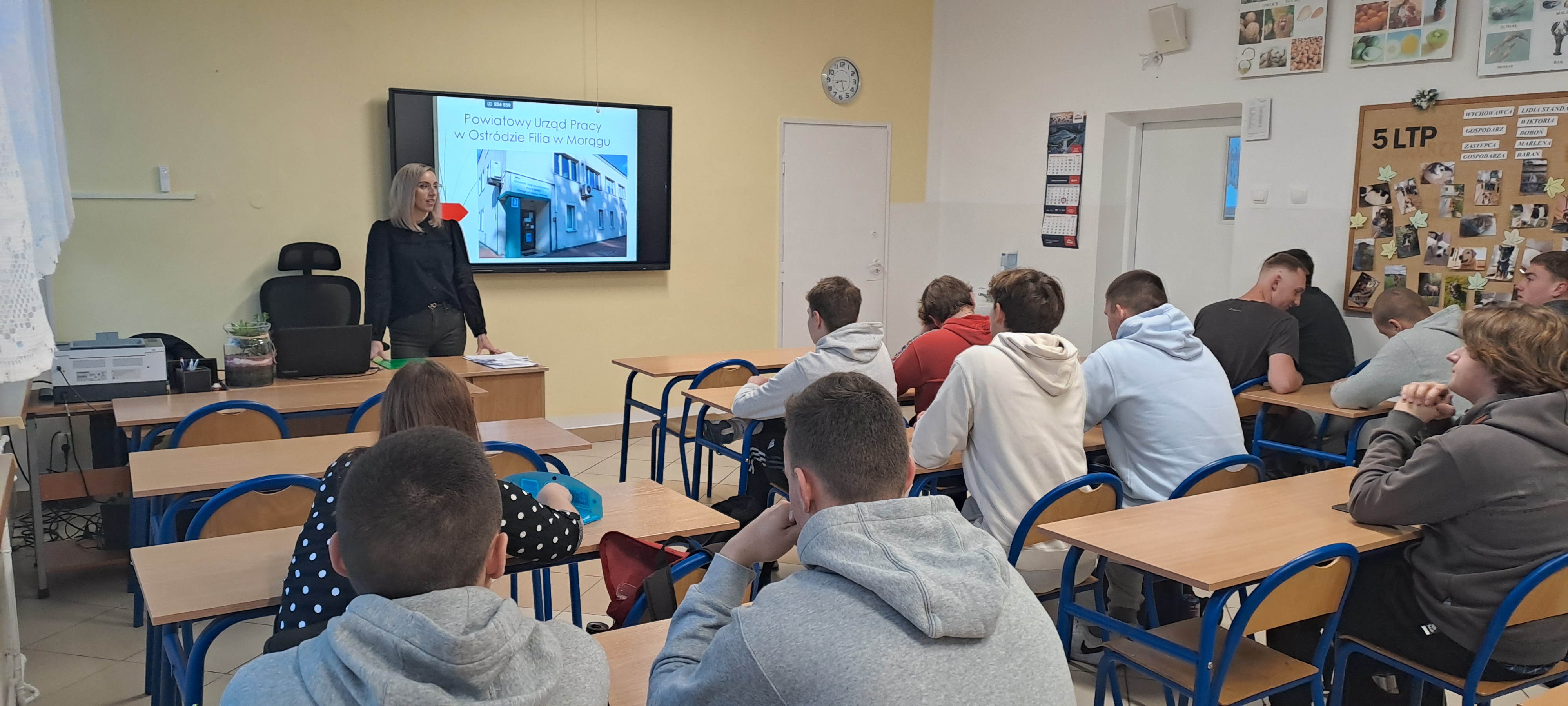 w spotkaniu z przedstawicielem Urzędu Pracy z Morąga Panią Natalią Szulich. Tematem zajęć była rola i zadania Urzędu Pracy – Aktywne formy przeciwdziałania bezrobociu. Przedstawiciel UP przedstawił możliwą ścieżkę edukacyjną uczniów po ukończeniu szkoły oraz przekazał wskazówki pomocne w ułożeniu planu edukacyjnego oraz kariery zawodowej na najbliższe lata. Udzielono informacji o aktualnej sytuacji na rynku pracy oraz wymagań stawianych przez pracodawców. Przeprowadzono pogadankę na temat trafnych wyborów zawodu, przedstawiono instrumenty rynku pracy oraz nowe formy pomocy dla absolwentów wkraczających na rynek pracy.