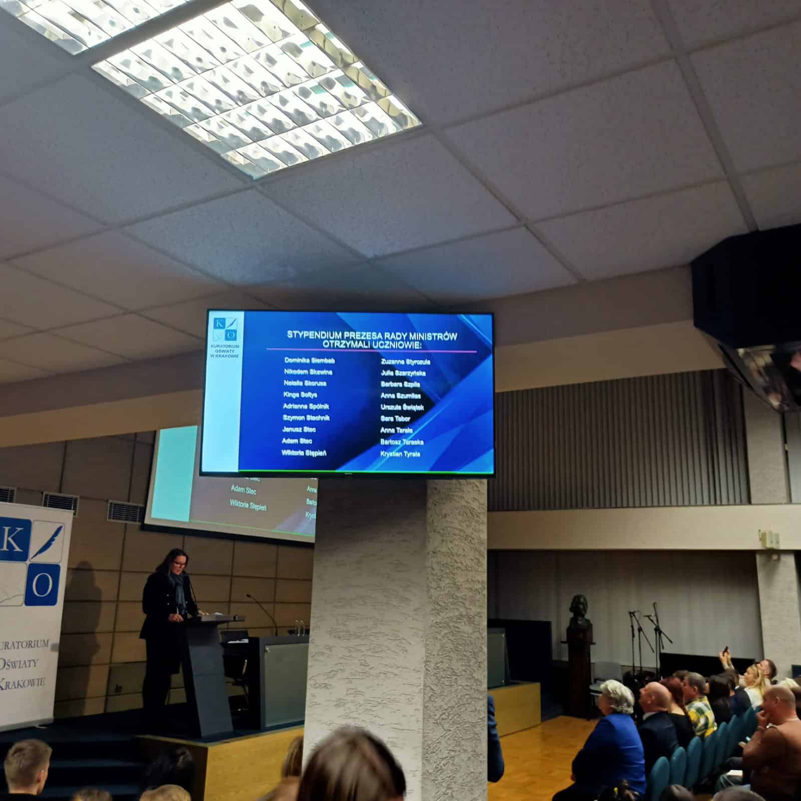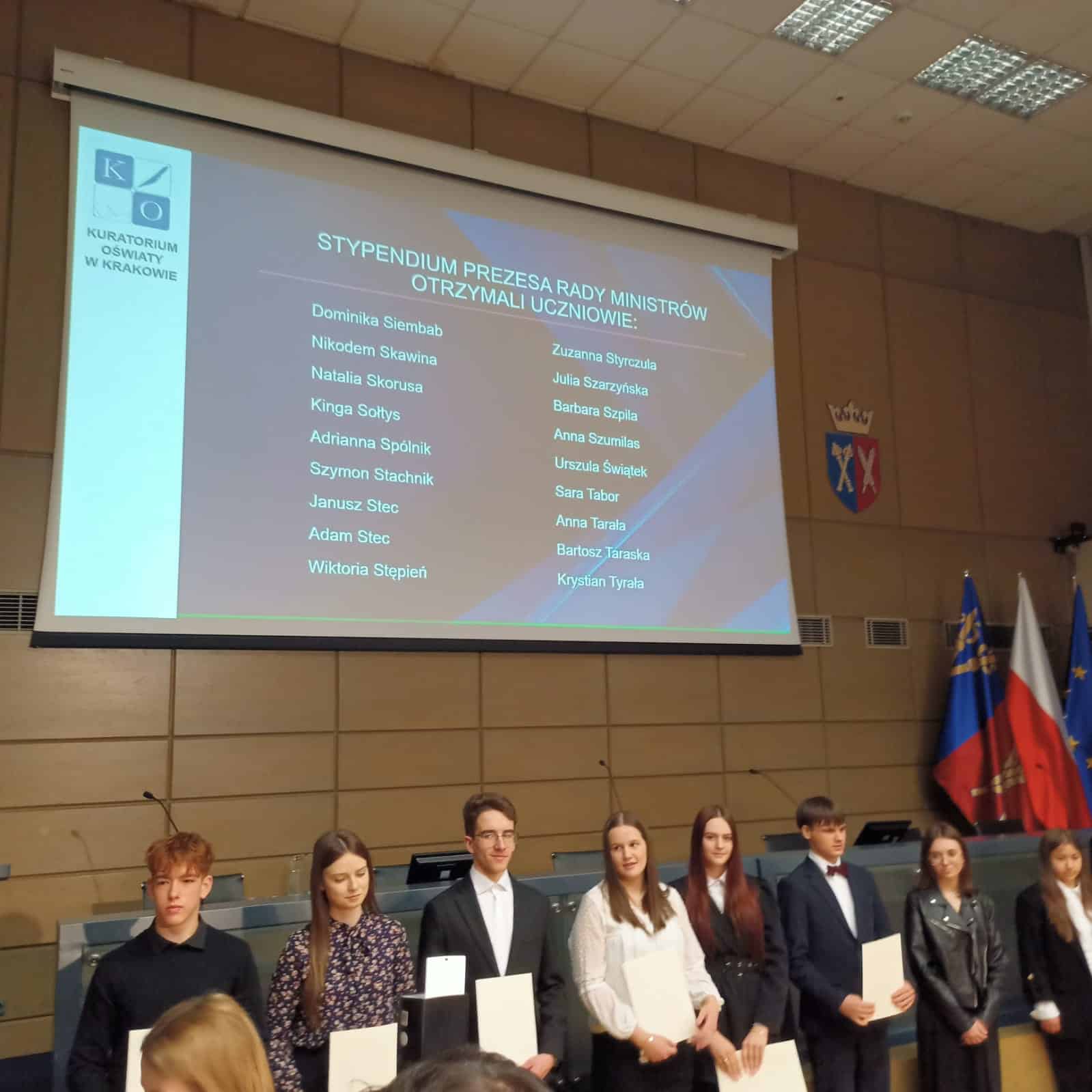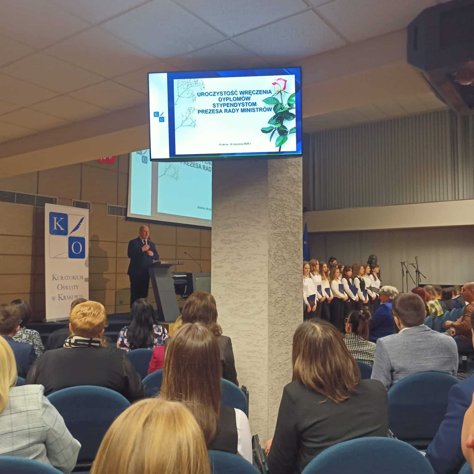 Uroczyste wręczenie stypendiów Prezesa Rady Ministrów odbyło się 14 stycznia na gościnnej Auli Uniwersytetu Rolniczego w Krakowie. To wyjątkowe wydarzenie, podkreślające osiągnięcia najlepszych uczniów w Małopolsce, pośród których znalazła się nasza uczennica Adrianna Spólnik. Ada odebrała stypendium Prezesa Rady Ministrów za najwyższą średnią ocen w roku szkolnym 2023/2024 (5,31). Dyplomy stypendialne najlepszym z najlepszych w Małopolsce wręczali: Wojewoda Małopolski Krzysztof Jan Klęczar oraz Kurator Małopolska Gabriela Olszowska. Serdeczne gratulacje dla uczennicy i jej Rodziców! Zachęcamy wszystkich naszych uczniów do współzawodnictwa