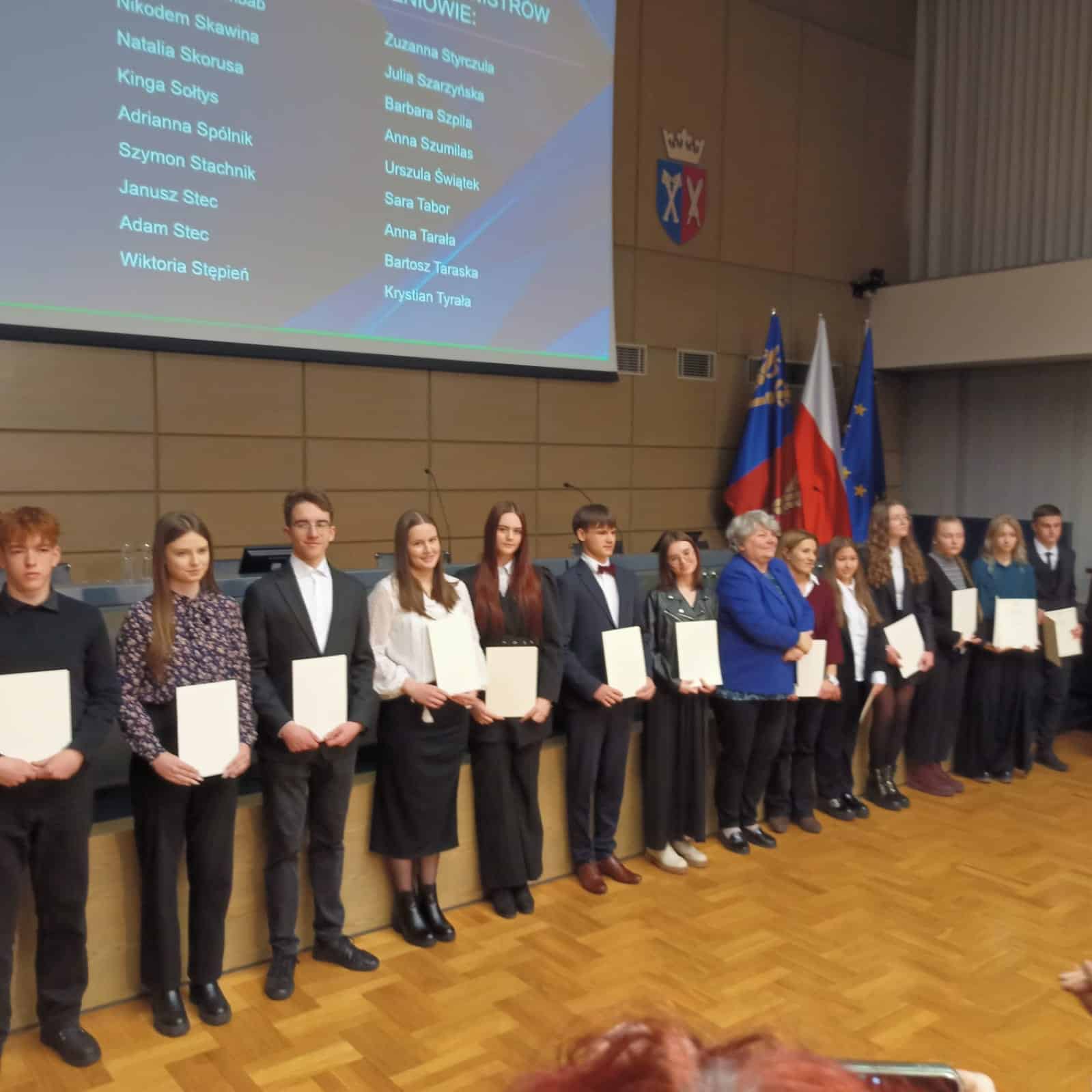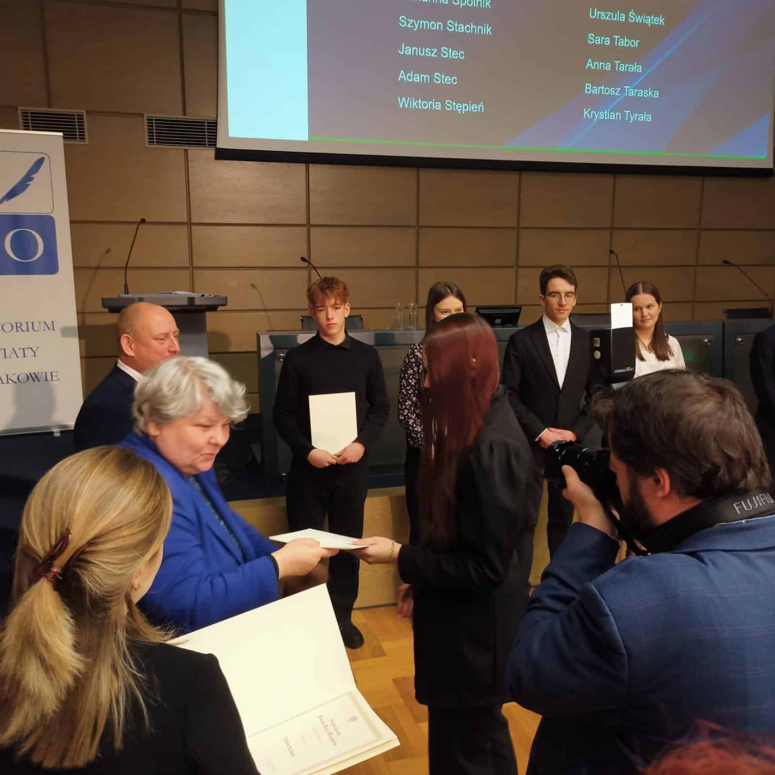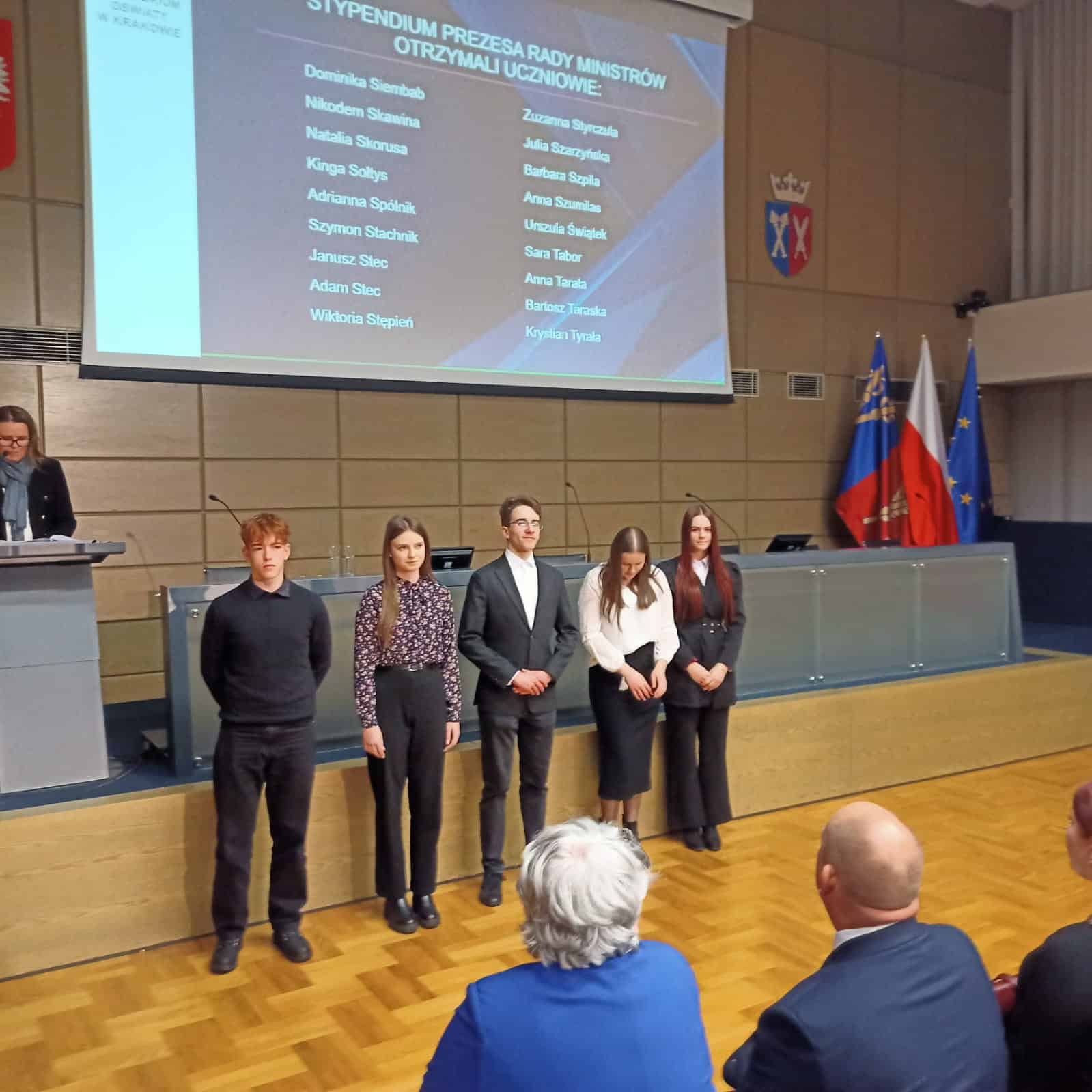 Uroczyste wręczenie stypendiów Prezesa Rady Ministrów odbyło się 14 stycznia na gościnnej Auli Uniwersytetu Rolniczego w Krakowie. To wyjątkowe wydarzenie, podkreślające osiągnięcia najlepszych uczniów w Małopolsce, pośród których znalazła się nasza uczennica Adrianna Spólnik. Ada odebrała stypendium Prezesa Rady Ministrów za najwyższą średnią ocen w roku szkolnym 2023/2024 (5,31). Dyplomy stypendialne najlepszym z najlepszych w Małopolsce wręczali: Wojewoda Małopolski Krzysztof Jan Klęczar oraz Kurator Małopolska Gabriela Olszowska. Serdeczne gratulacje dla uczennicy i jej Rodziców! Zachęcamy wszystkich naszych uczniów do współzawodnictwa