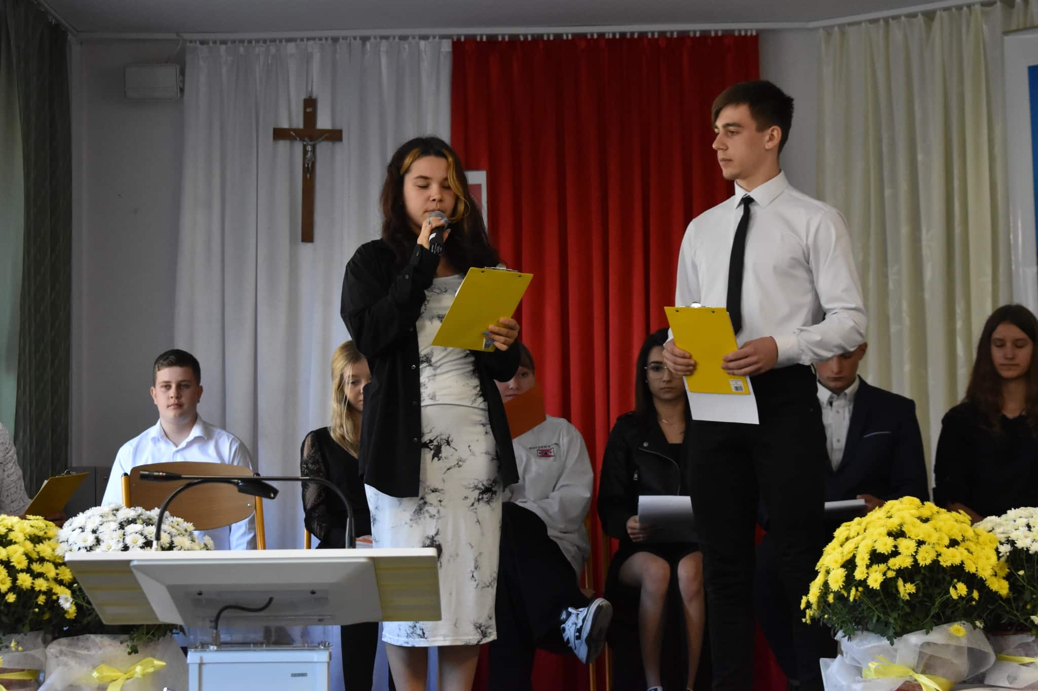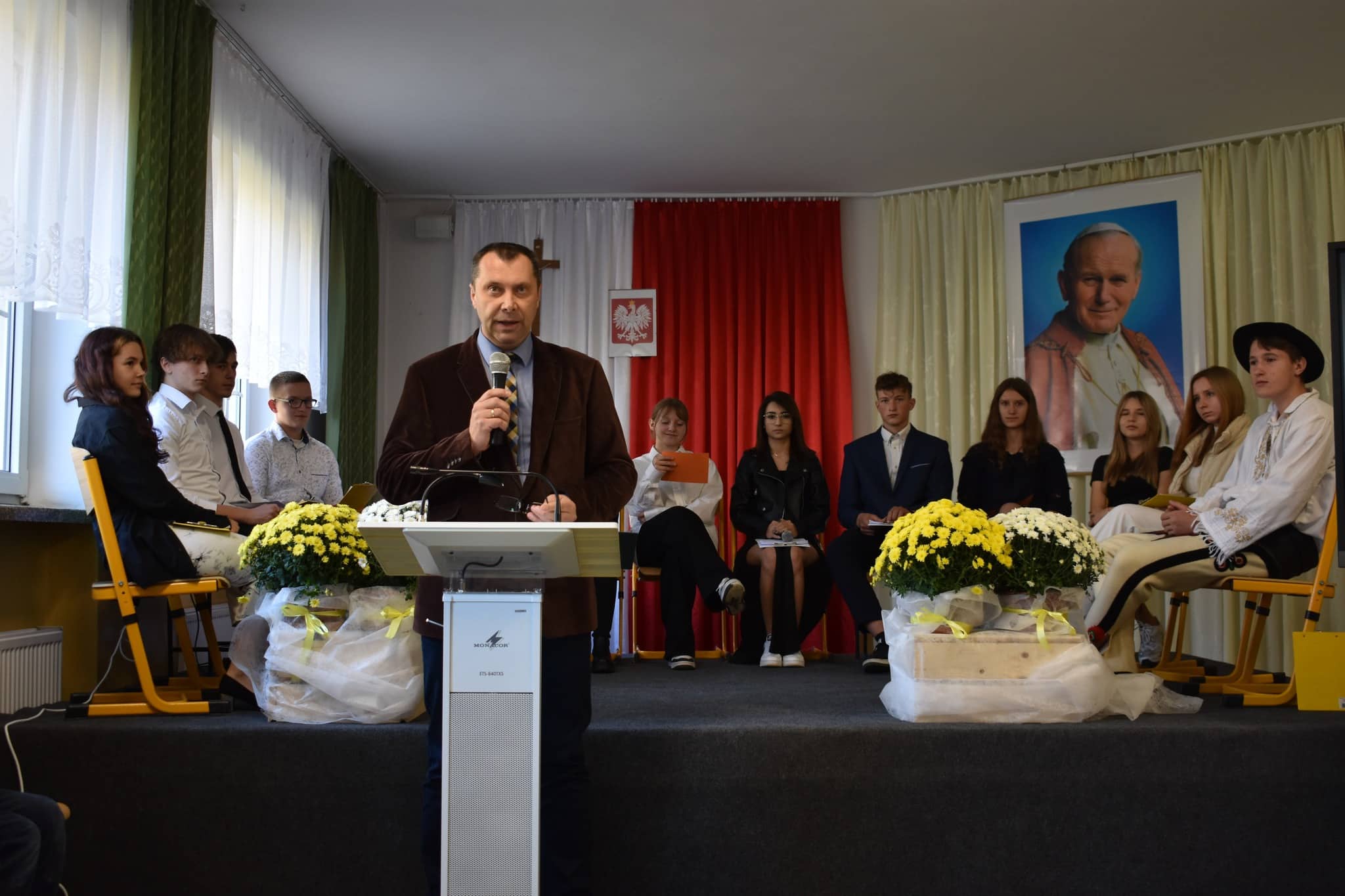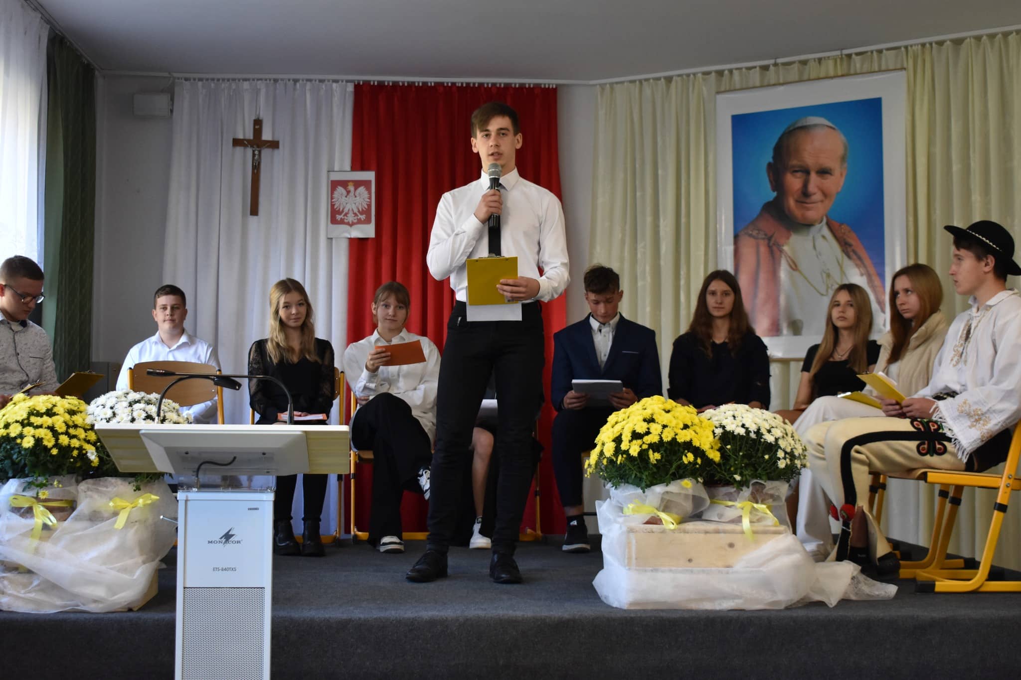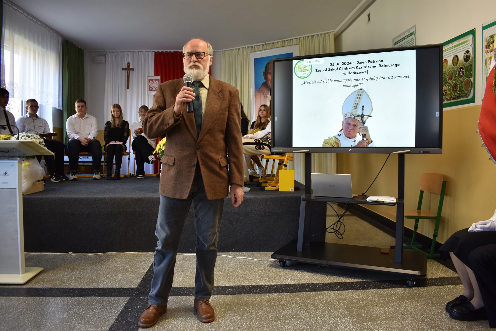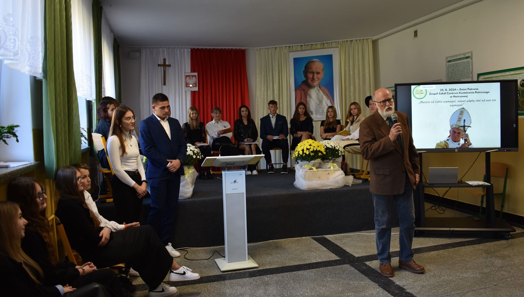 25 października 2024 r. obchodziliśmy w naszej szkole Dzień Patrona. Uroczystości rozpoczęły się od Mszy Świętej w Kaplicy Dobrego Pasterza w Hańczowej. Następnie Dyrektor, Grono Pedagogiczne, młodzież oraz zaproszeni goście udali się do szkoły, aby wziąć udział w montażu słowno-muzycznym przybliżającym postać Świętego Jana Pawła II. Podczas spotkania, wysłuchaliśmy ciekawego wykładu Pana mgr inż. Jerzego Dardzińskiego na temat życiorysu Karola Wojtyły i jego wizyty w Hańczowej.