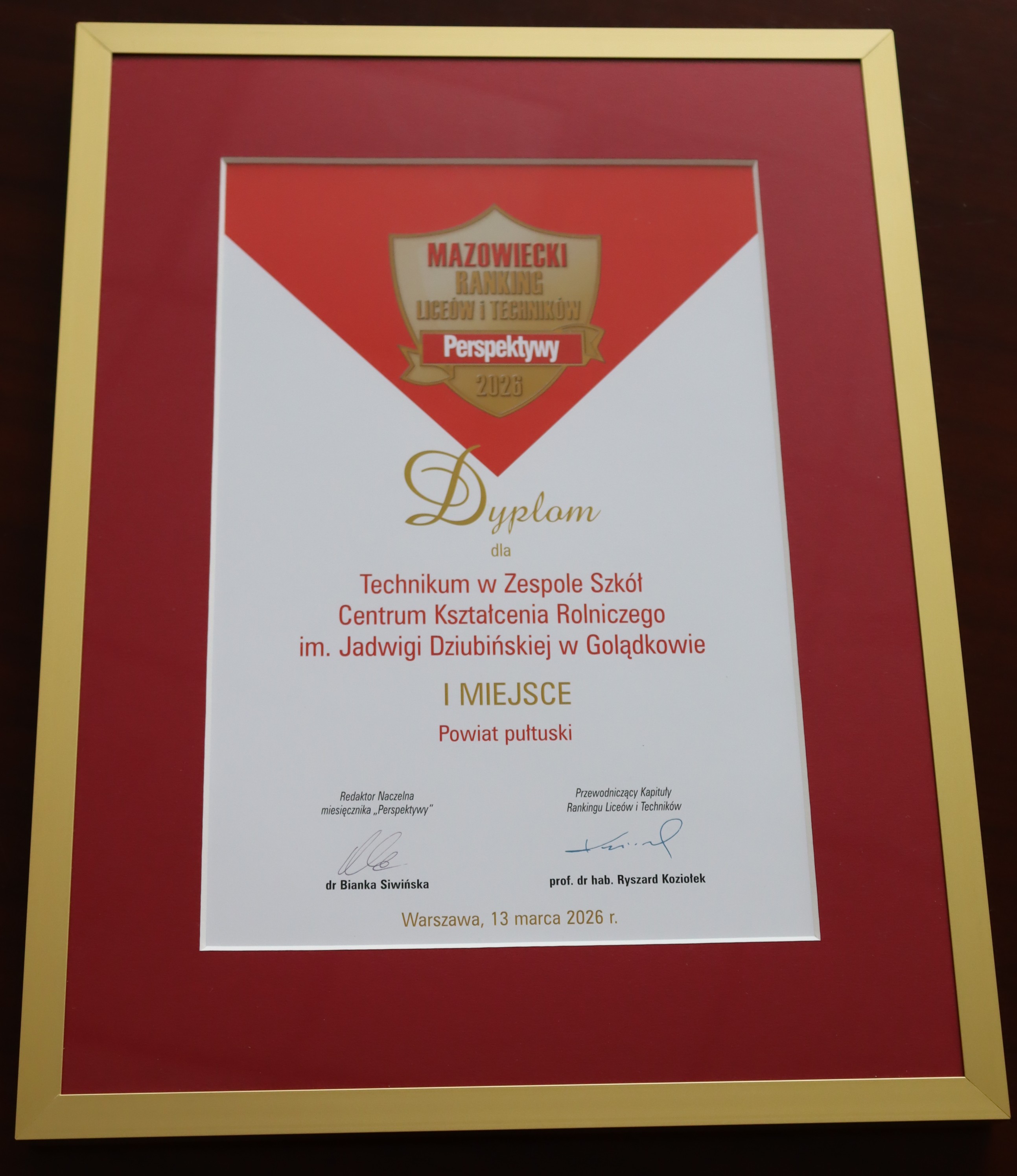Zespół Szkół Centrum Kształcenia Rolniczego w Golądkowie po raz drugi z rzędu został wyróżniony Brązową Tarczą w Rankingu Liceów i Techników Perspektywy. To prestiżowe wyróżnienie potwierdza wysoką jakość kształcenia oraz silną pozycję szkoły.