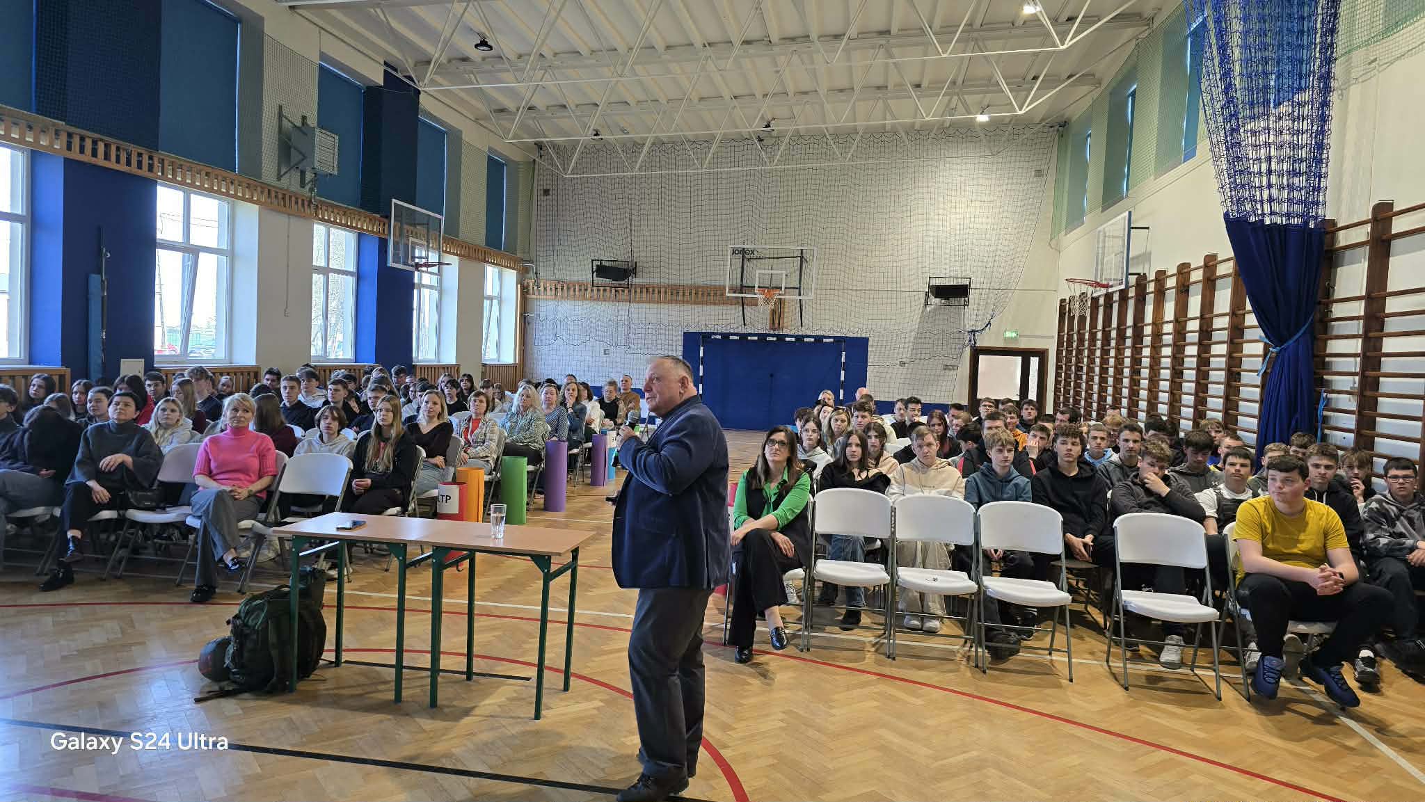 W ramach pierwszej części programu uczniowie zapoznani zostali z zagadnieniami dotyczącymi ochrony ludności cywilnej w sytuacjach kryzysowych, takich jak działania wojenne, klęski żywiołowe, dezinformacje czy inne zagrożenia. Tematyka ta została przedstawiona przez panów dr Roberta Dynaka dyrektora Wydziału Zarządzania Kryzysowego Starostwa Powiatowego w Pułtusku i pana Marcina Siatkowskiego inspektora ds. obrony cywilnej.