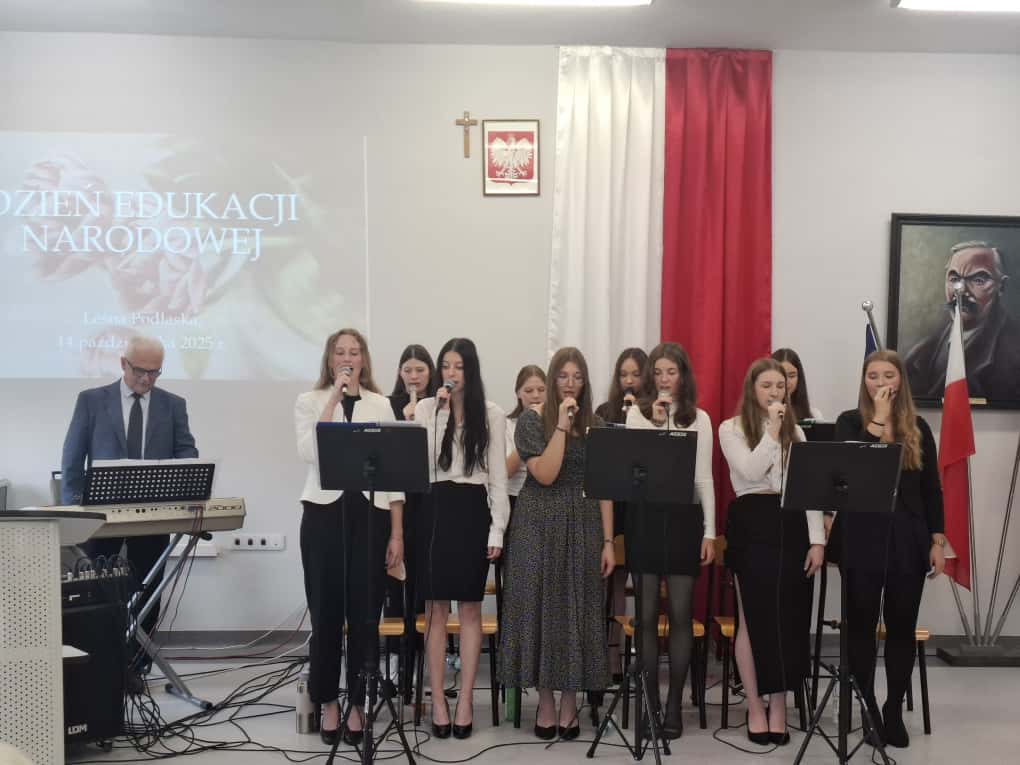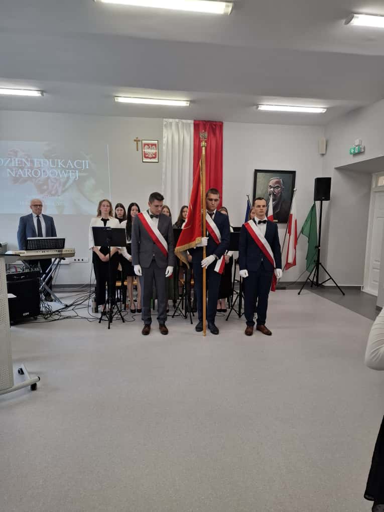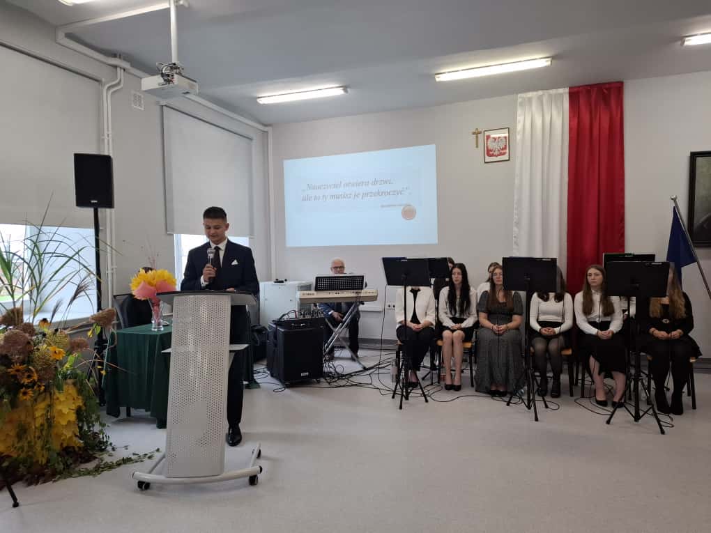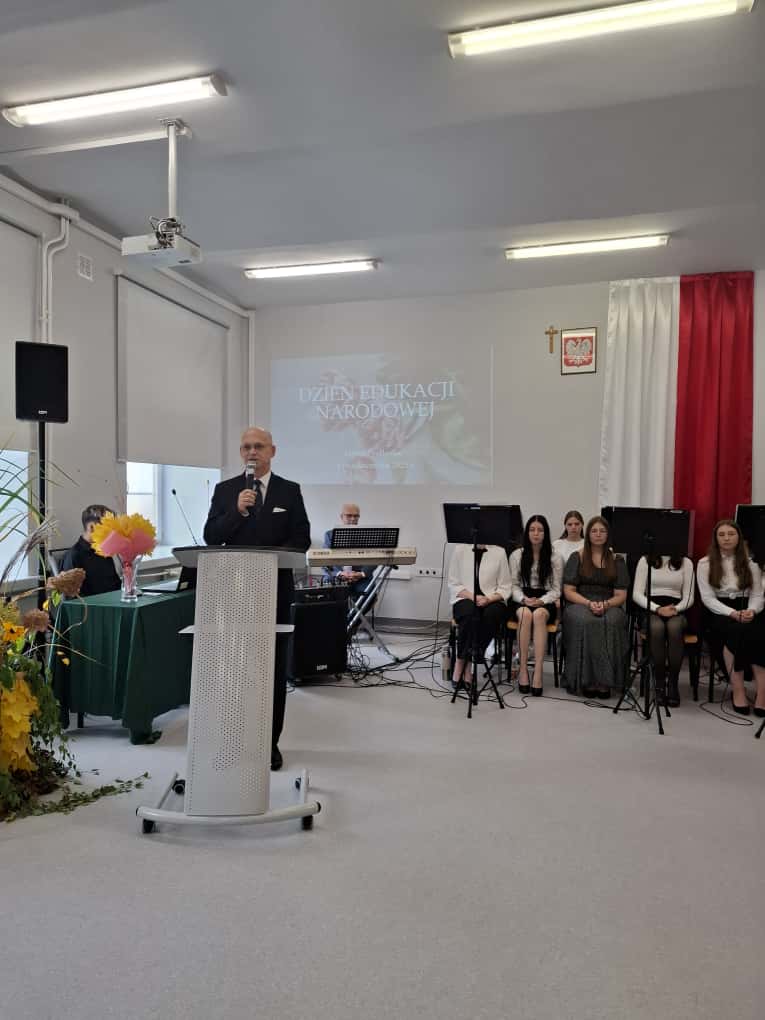 Uroczyste obchody Dnia Edukacji Narodowej połączone ze ślubowaniem uczniów klas pierwszych odbyły się 17 października 2025 r. Pan Dyrektor Radosław Klekot powitał serdecznie przybyłych gości, rodziców, nauczycieli, pracowników szkoły i uczniów. Następnie przypomniał rolę i zadania Komisji Edukacji Narodowej oraz złożył życzenia wszystkim nauczycielom i pracownikom szkoły. Skierował także szczególne słowa i życzenia do uczniów klas pierwszych, aby z zaangażowaniem zdobywali wiedzę oraz rozwijali swoje zainteresowania w naszej szkole.
