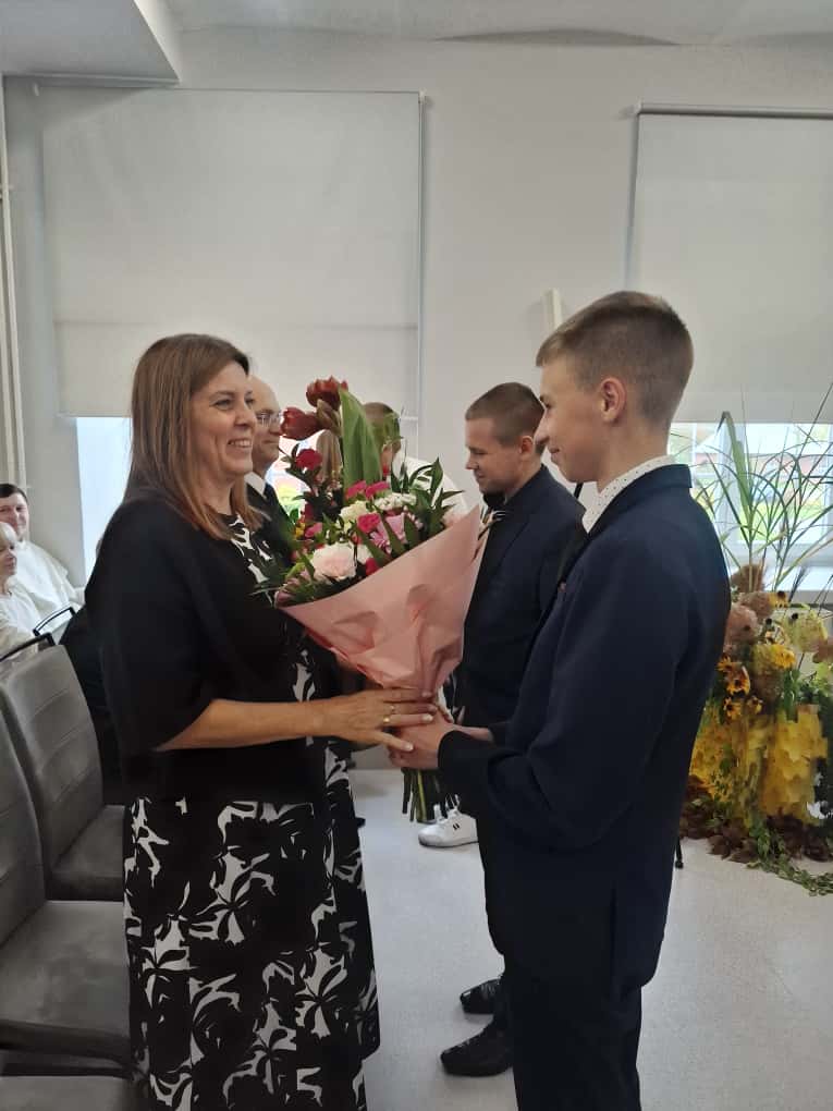 Uczniowie wręczyli pedagogom kwiaty jako wyraz swojej wdzięczności. Uroczystość uświetnił występ artystyczny przygotowany przez zespół wokalno – instrumentalny „Takt” pod kierunkiem Pana Sławomira Bartniczuka.