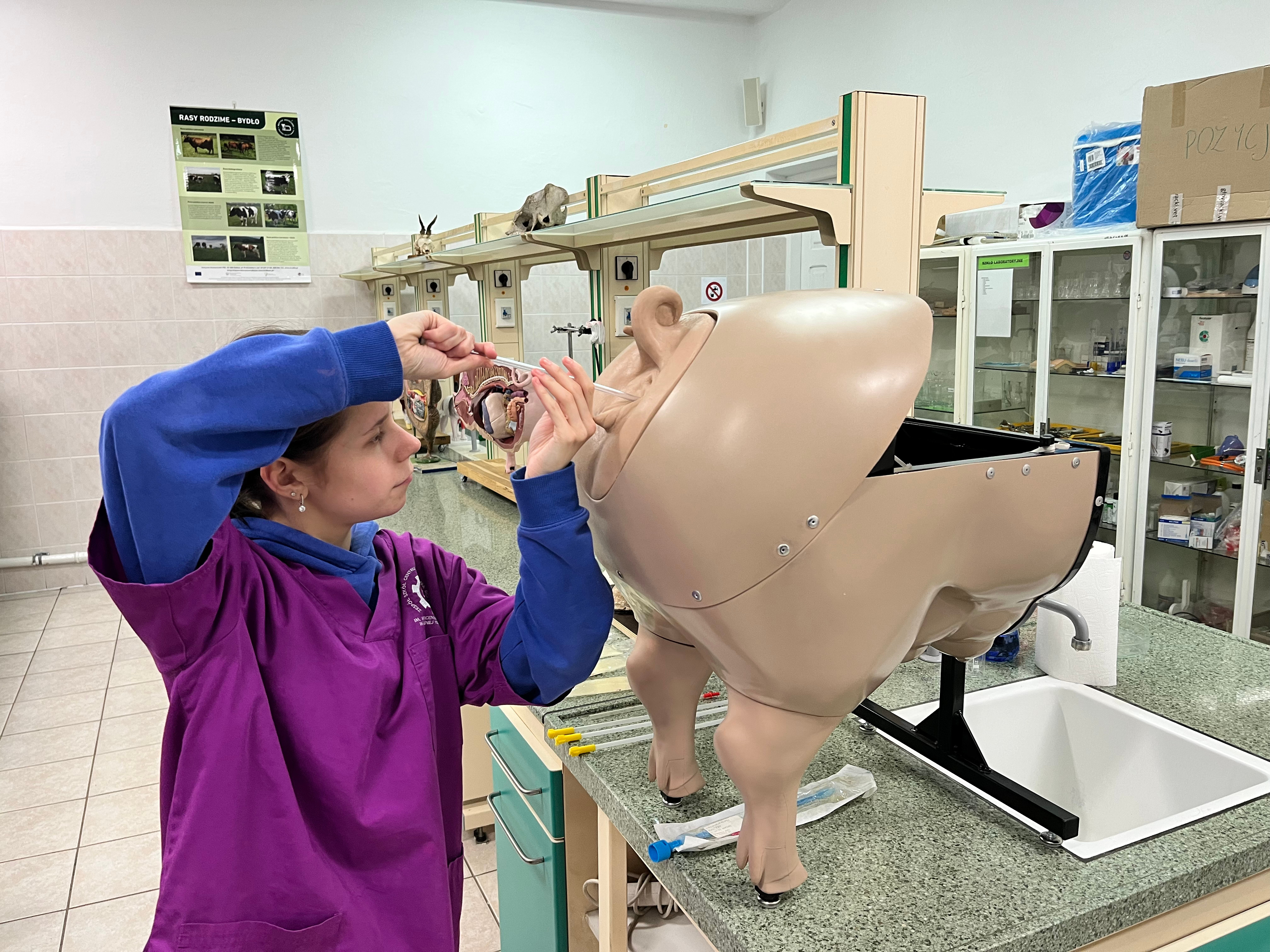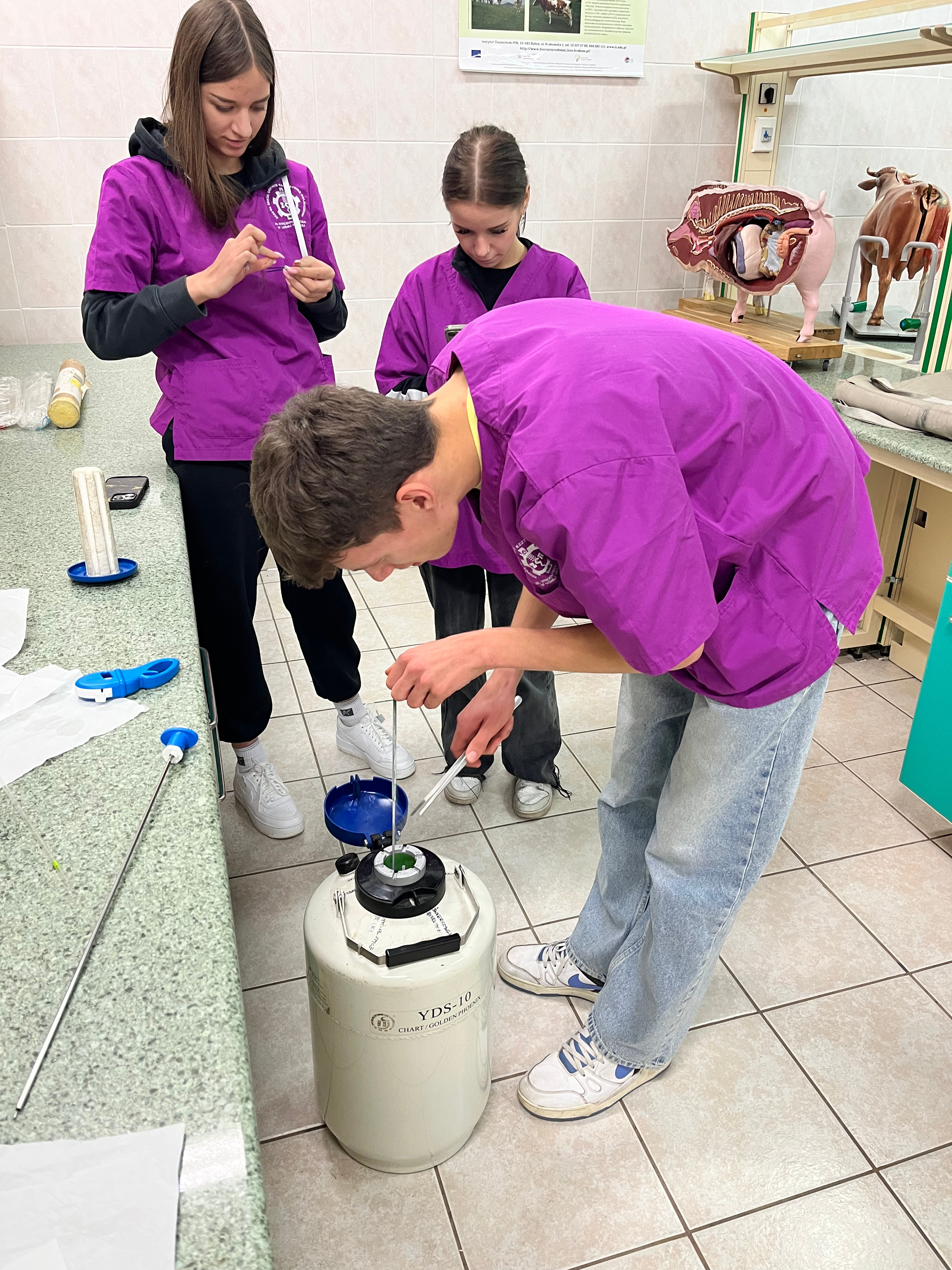 Kurs inseminacji bydła to specjalistyczne szkolenie teoretyczno-praktyczne, które przygotowuje przyszłych techników weterynarii do wykonywania sztucznej inseminacji. Uczestnicy kursu przypomnieli podstawy anatomii i fizjologii układu rozrodczego krowy i lochy, poznali technologię produkcji, przechowywania i transportu nasienia oraz wszystkie zagadnienia związane z przeprowadzaniem zabiegu unasieniania u bydła i trzody chlewnej. Podczas zajęć wykorzystywane były specjalistyczne fantomy zwierzęce.