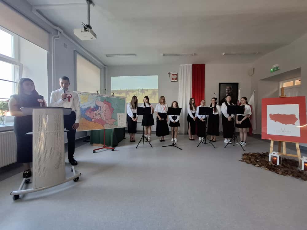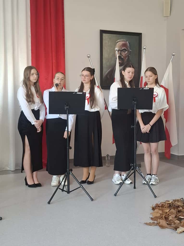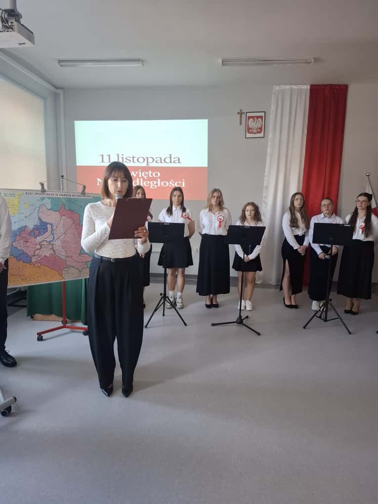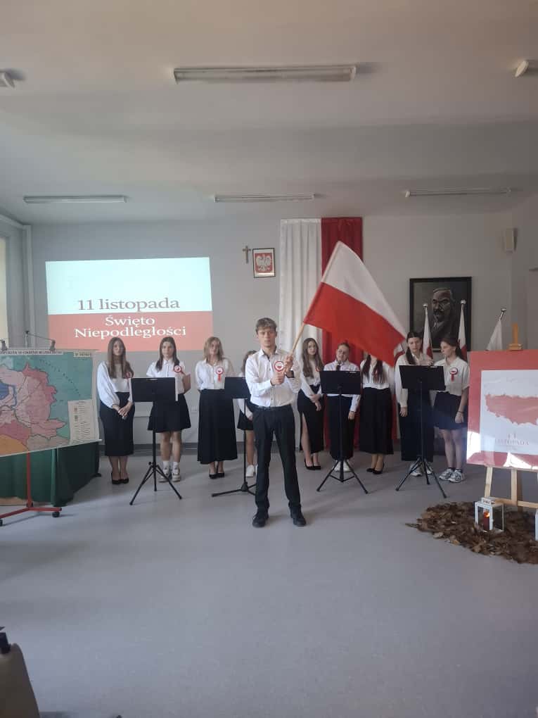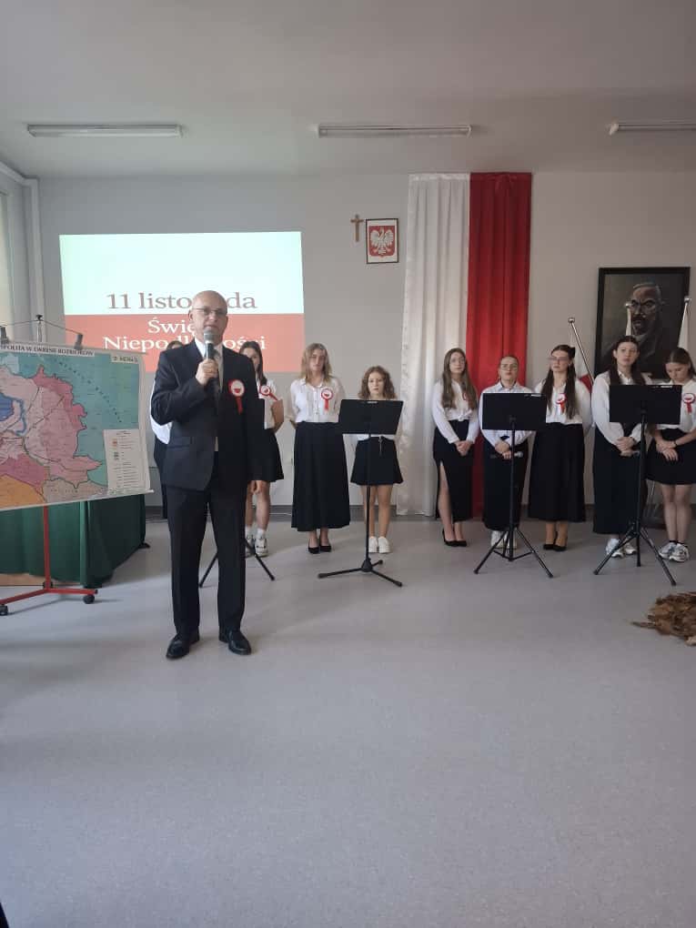 Następnie Dyrektor Szkoły Pan Radosław Klekot wygłosił okolicznościowe przemówienie, w którym przypomniał zebranym, że Święto Niepodległości ma nie tylko wymiar historyczny, ale także społeczny, duchowy i kulturalny. Pan Dyrektor zwrócił też uwagę na fakt, że niepodległość to nie tylko przywilej, ale również obowiązek – to nasza wspólna odpowiedzialność za dobro Polski i Polaków. Kolejnym punktem wspólnego świętowania był montaż słowno – muzyczny pt. „Droga do niepodległości”, zaprezentowany przez uczniów, pracujących pod opieką pani Danuty Kacik i pani Moniki Kalinki. Młodzież przedstawiła niezwykłą lekcję historii Polski, wzbogaconą polskimi pieśniami patriotycznymi.