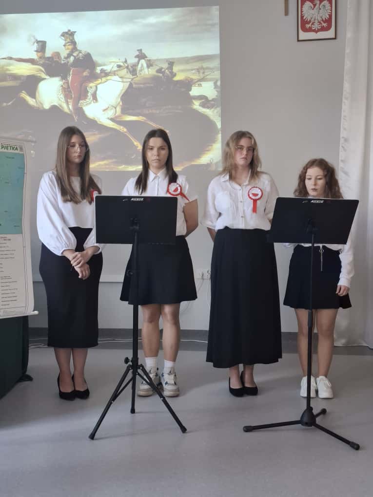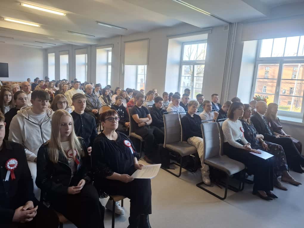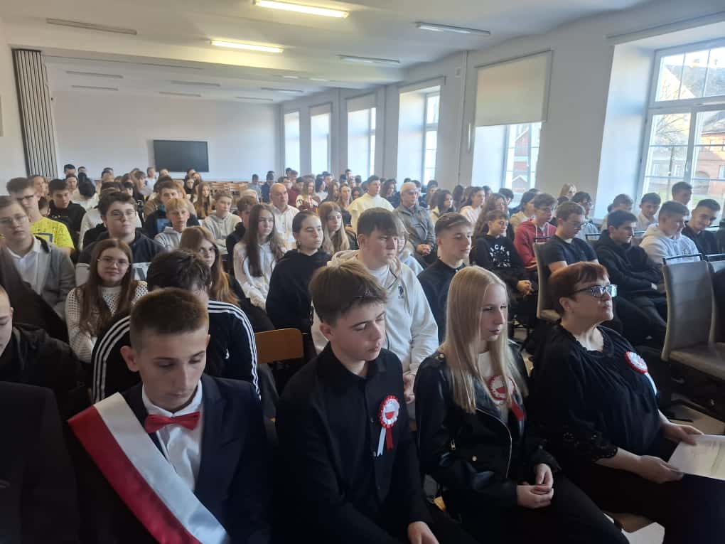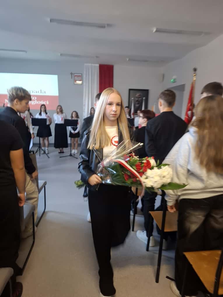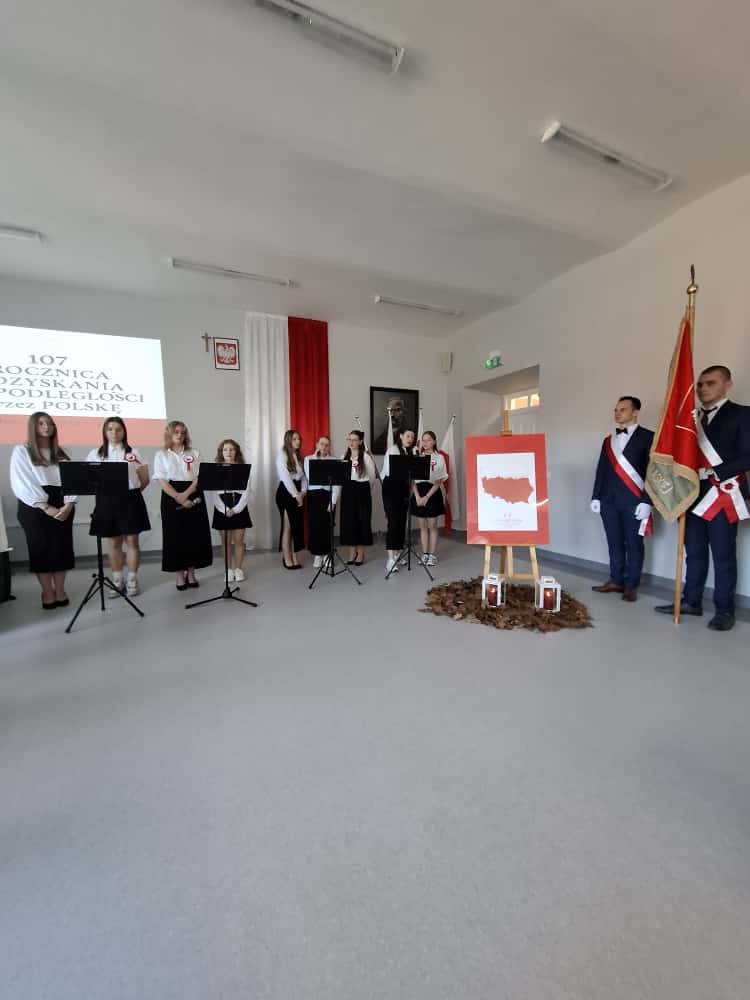 Następnie Dyrektor Szkoły Pan Radosław Klekot wygłosił okolicznościowe przemówienie, w którym przypomniał zebranym, że Święto Niepodległości ma nie tylko wymiar historyczny, ale także społeczny, duchowy i kulturalny. Pan Dyrektor zwrócił też uwagę na fakt, że niepodległość to nie tylko przywilej, ale również obowiązek – to nasza wspólna odpowiedzialność za dobro Polski i Polaków. Kolejnym punktem wspólnego świętowania był montaż słowno – muzyczny pt. „Droga do niepodległości”, zaprezentowany przez uczniów, pracujących pod opieką pani Danuty Kacik i pani Moniki Kalinki. Młodzież przedstawiła niezwykłą lekcję historii Polski, wzbogaconą polskimi pieśniami patriotycznymi.