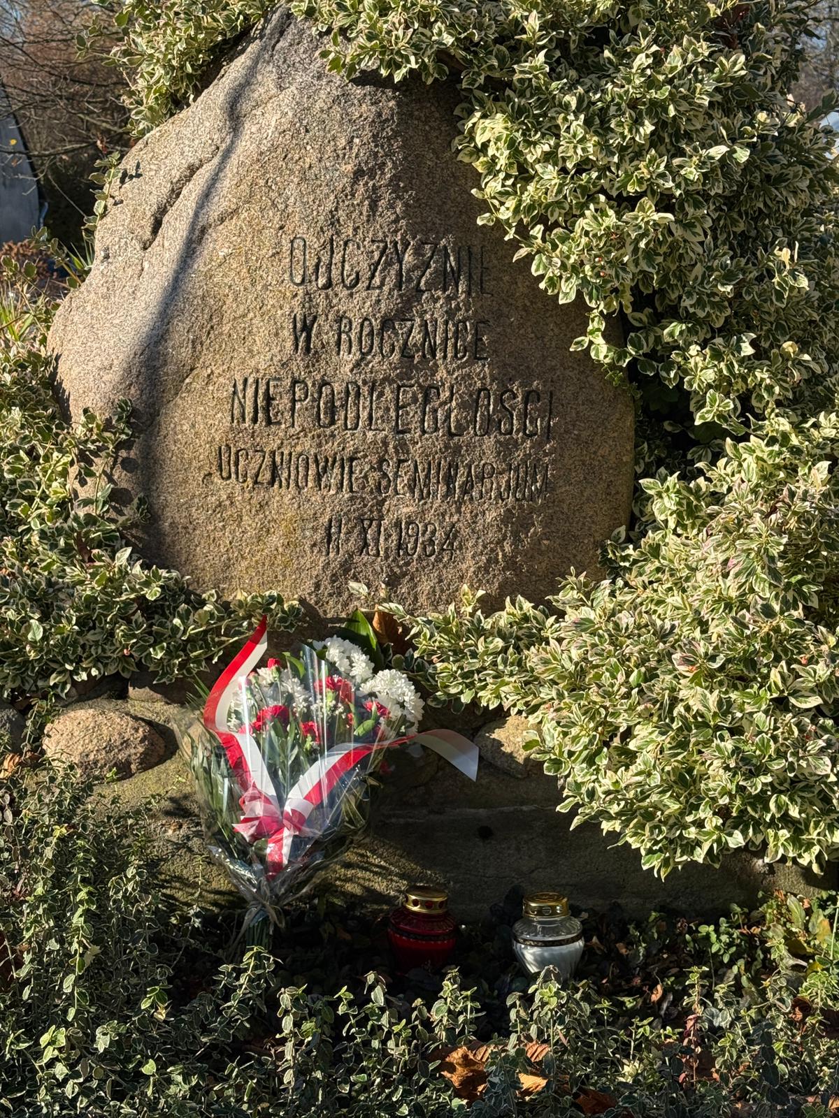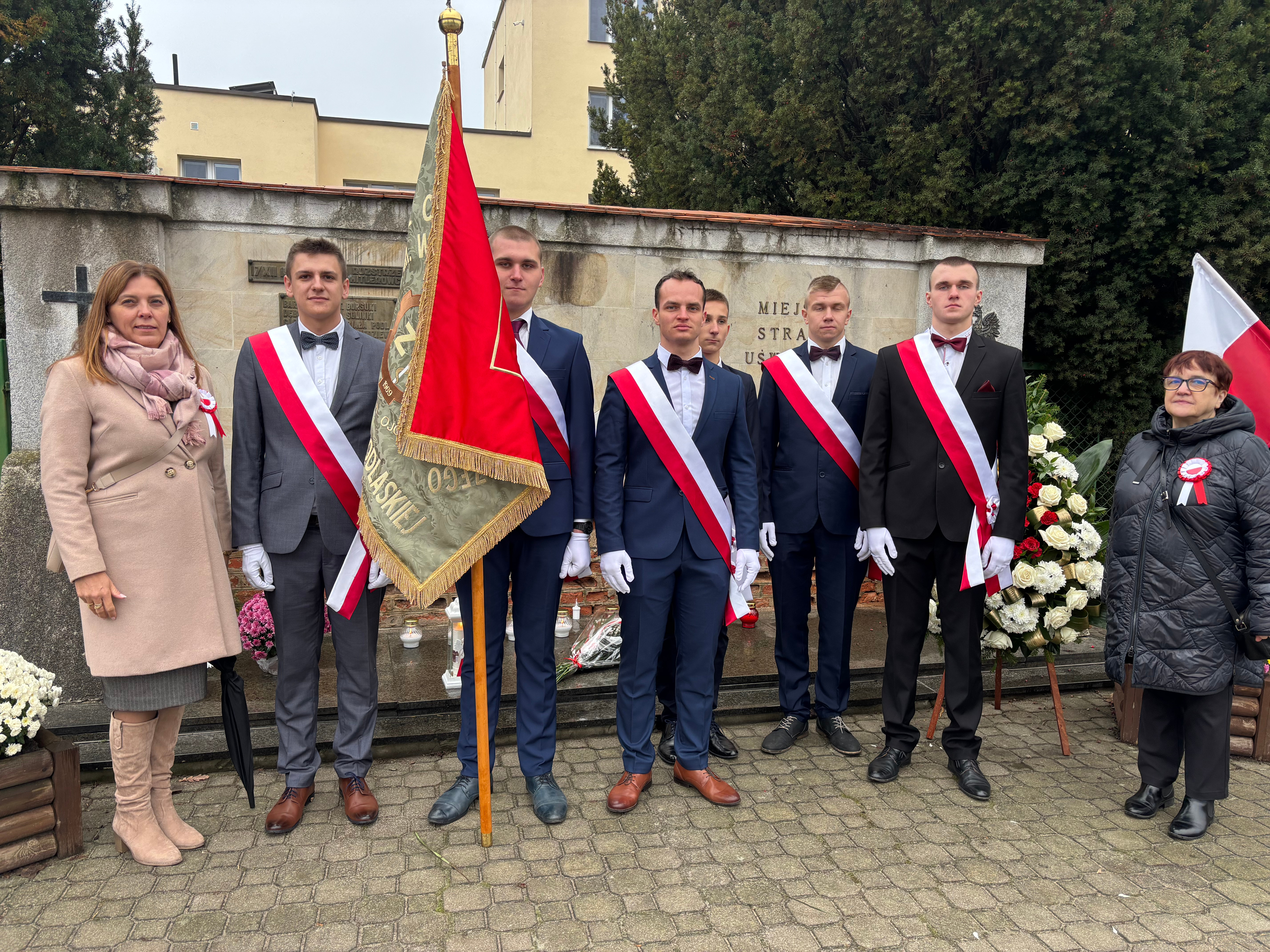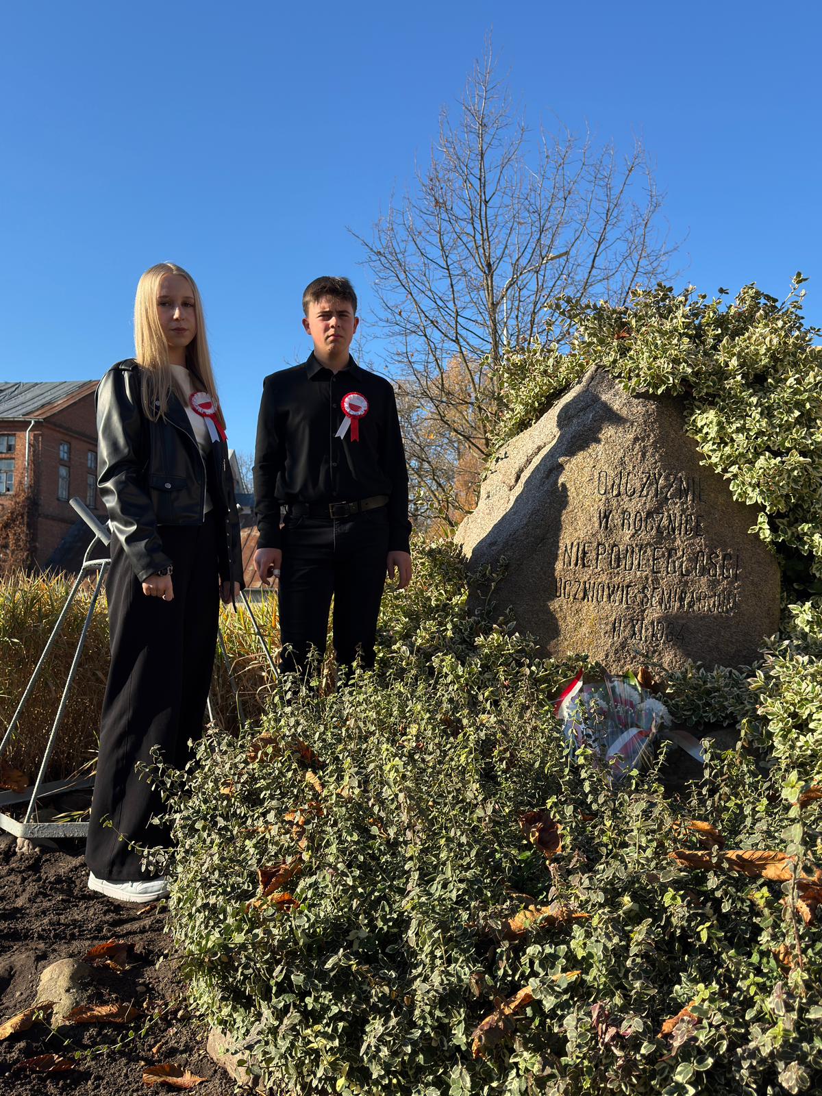 Obchody Narodowego Święta Niepodległości w naszej szkole rozpoczęliśmy 07.11.2025r. W uroczystości udział wzięła dyrekcja szkoły oraz młodzież klas I – III pod opieką nauczycieli. Odśpiewaliśmy „Mazurka Dąbrowskiego”, po czym uczniowie złożyli kwiaty i zapalili znicze przy Kamieniu Niepodległości.