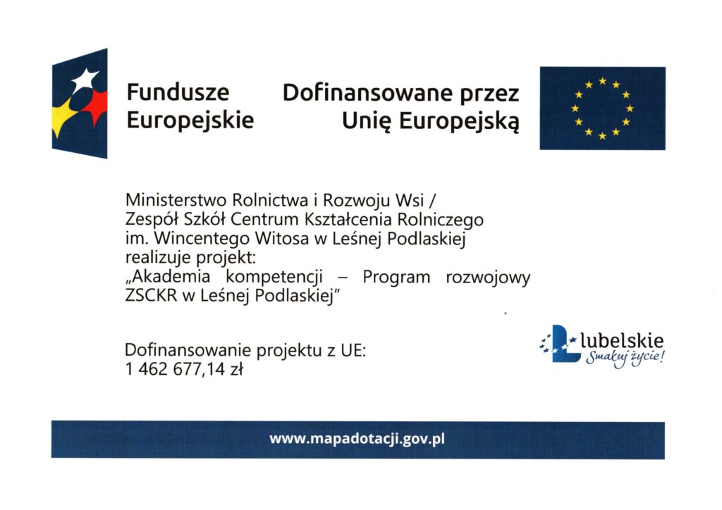 Ministerstwo Rolnictwa i Rozwoju Wsi/Zespół Szkół Centrum Kształcenia Rolniczego im. Wincentego Witosa w Leśnej Podlaskiej informuje, iż w dniu 1 października 2024 roku rozpoczęto realizację projektu pn. „Akademia kompetencji – Program rozwojowy ZSCKR w Leśnej Podlaskiej” realizowanego w ramach Programu Fundusze Europejskie dla Lubelskiego 2021-2027 współfinansowanego ze środków Europejskiego Funduszu Społecznego Plus