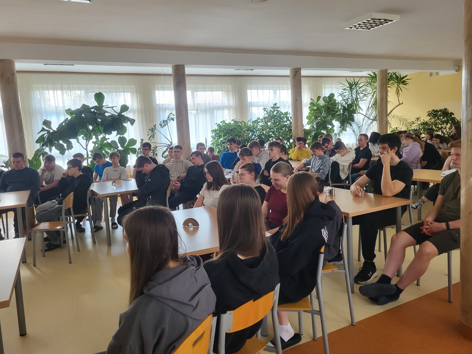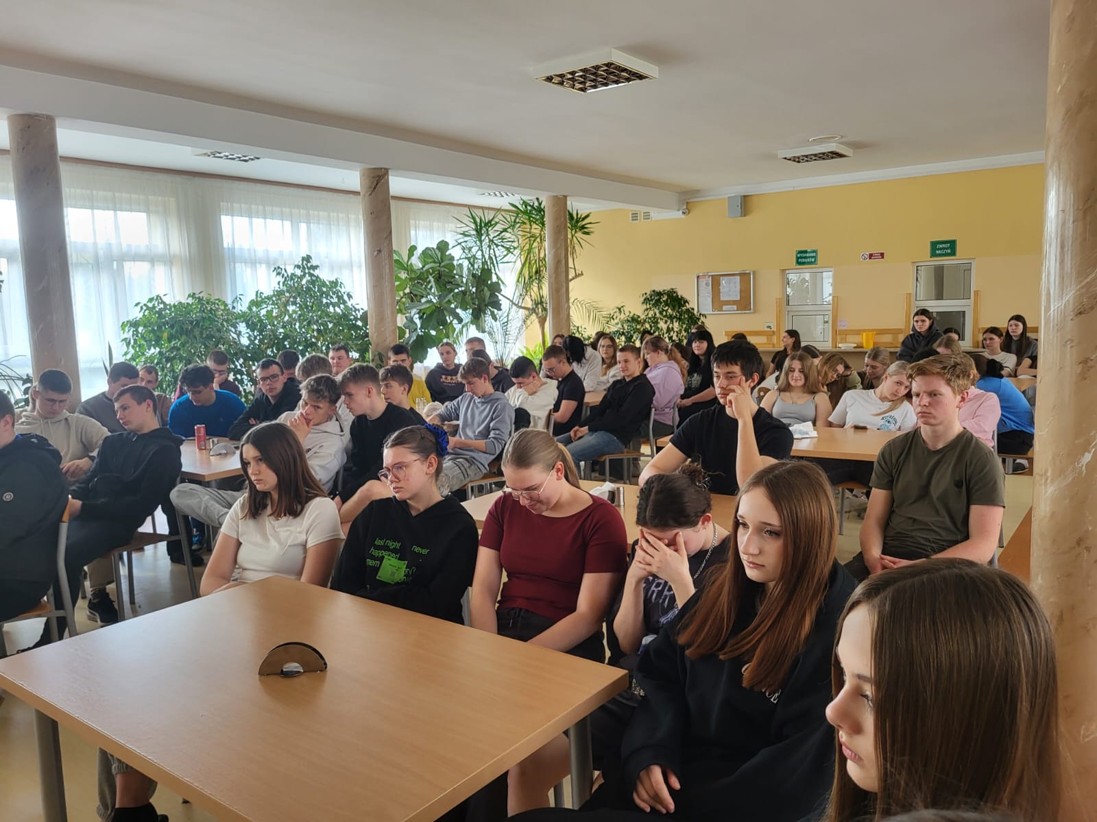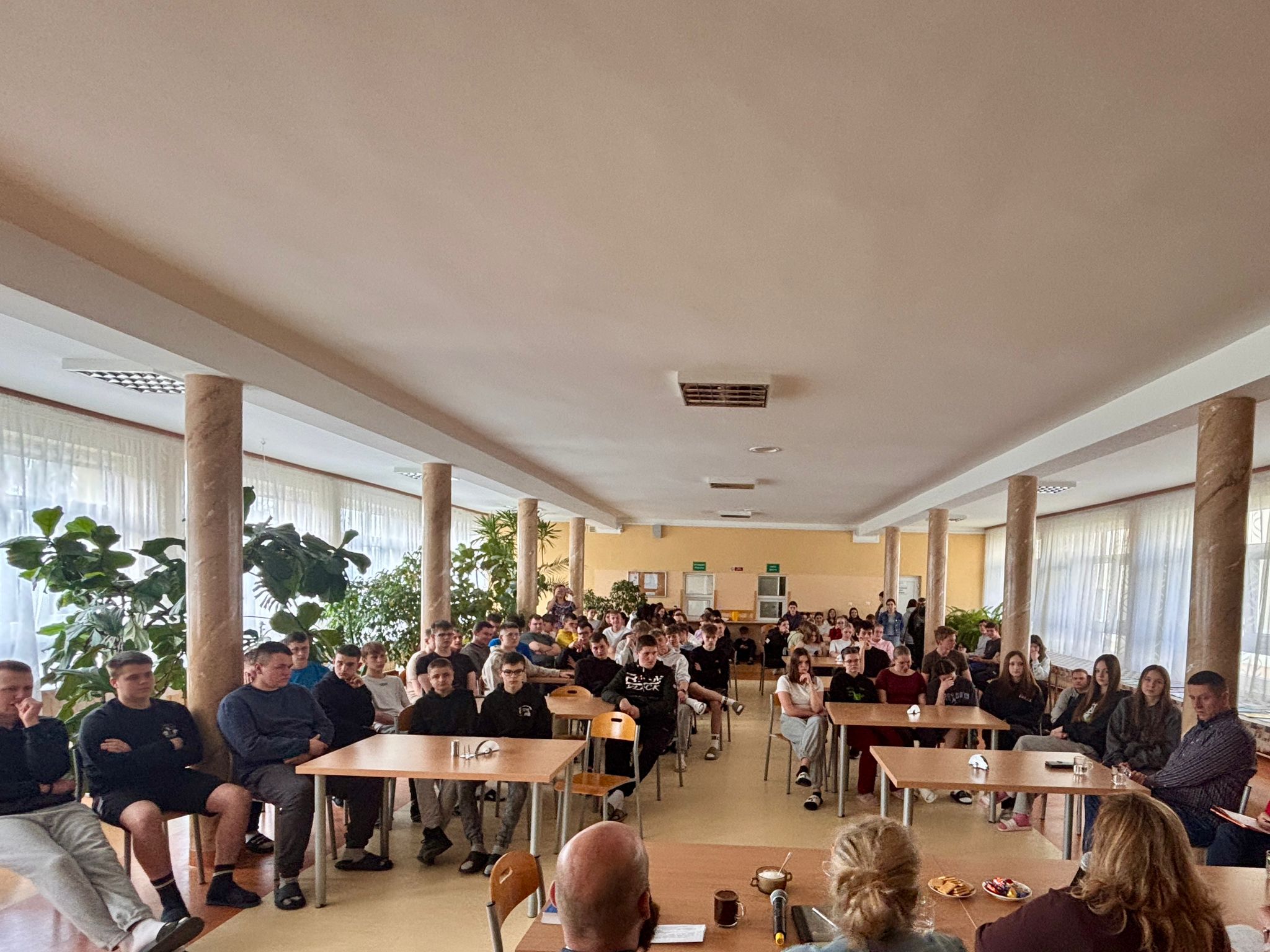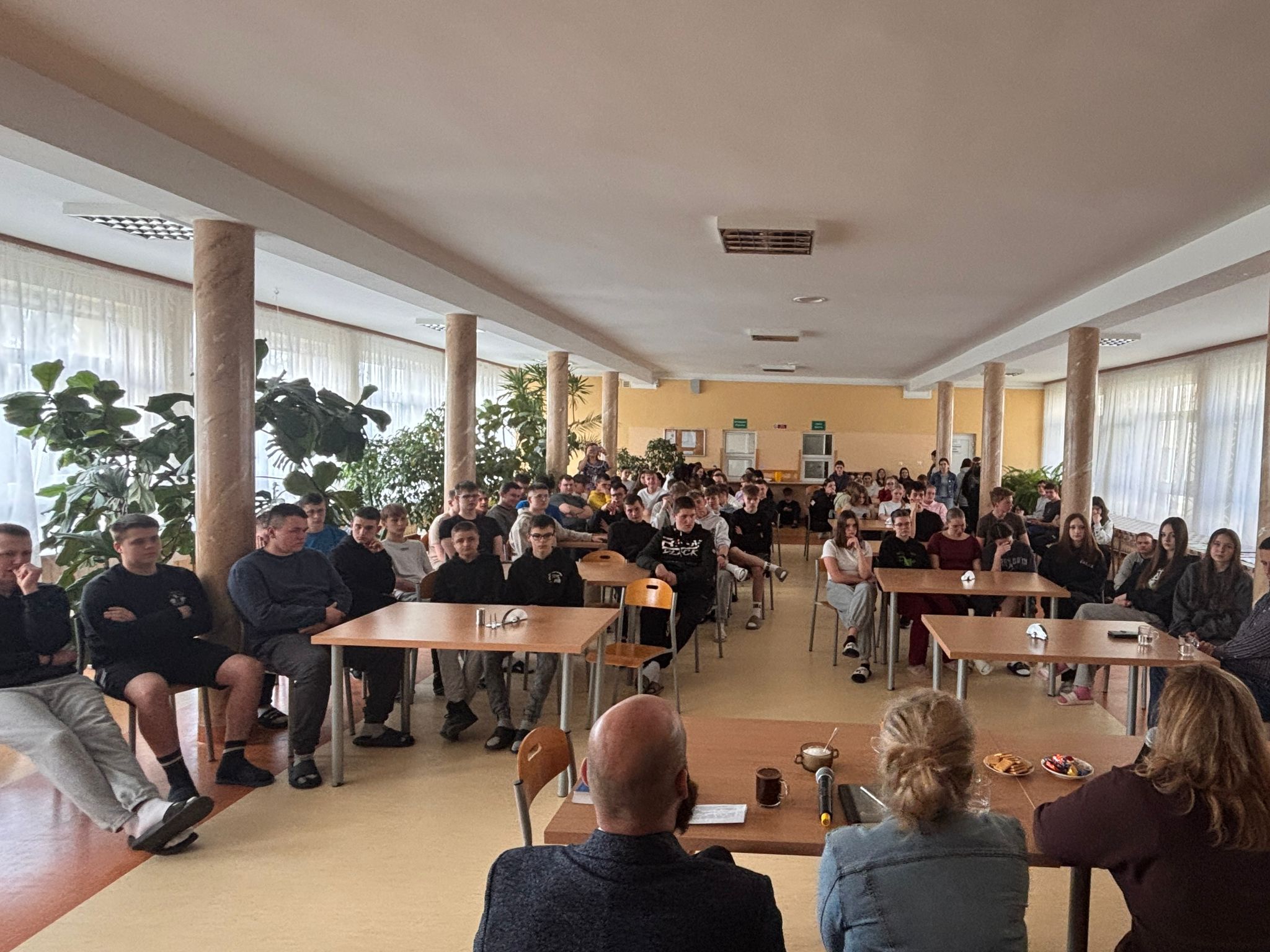 Zgromadzona w stołówce internatu liczna grupa młodzieży wysłuchała opowieści osób doświadczonych przez alkoholizm. Mogliśmy się dowiedzieć, jak stali się alkoholikami i jak wyglądała ich droga do trzeźwości. Poznaliśmy też historię życia kilku pań, które dzieliły życie z alkoholikiem. Opowiedziały one jak ta choroba wpływała na ich rodziny, jak wielkie wsparcie otrzymały od grup Al-Anon i jak to zmieniło ich sytuację.