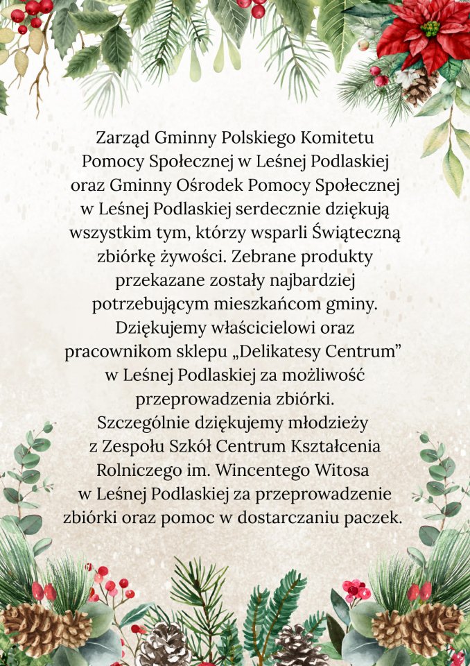 Po raz kolejny nasza szkoła wsparła szczytny cel. W dniach od 4 do 5 grudnia 2025 r., wolontariusze wzięli udział w Świątecznej Zbiórce Żywności zorganizowanej przez Zarząd Gminnego Komitetu Pomocy Społecznej w Leśnej Podlaskiej.
