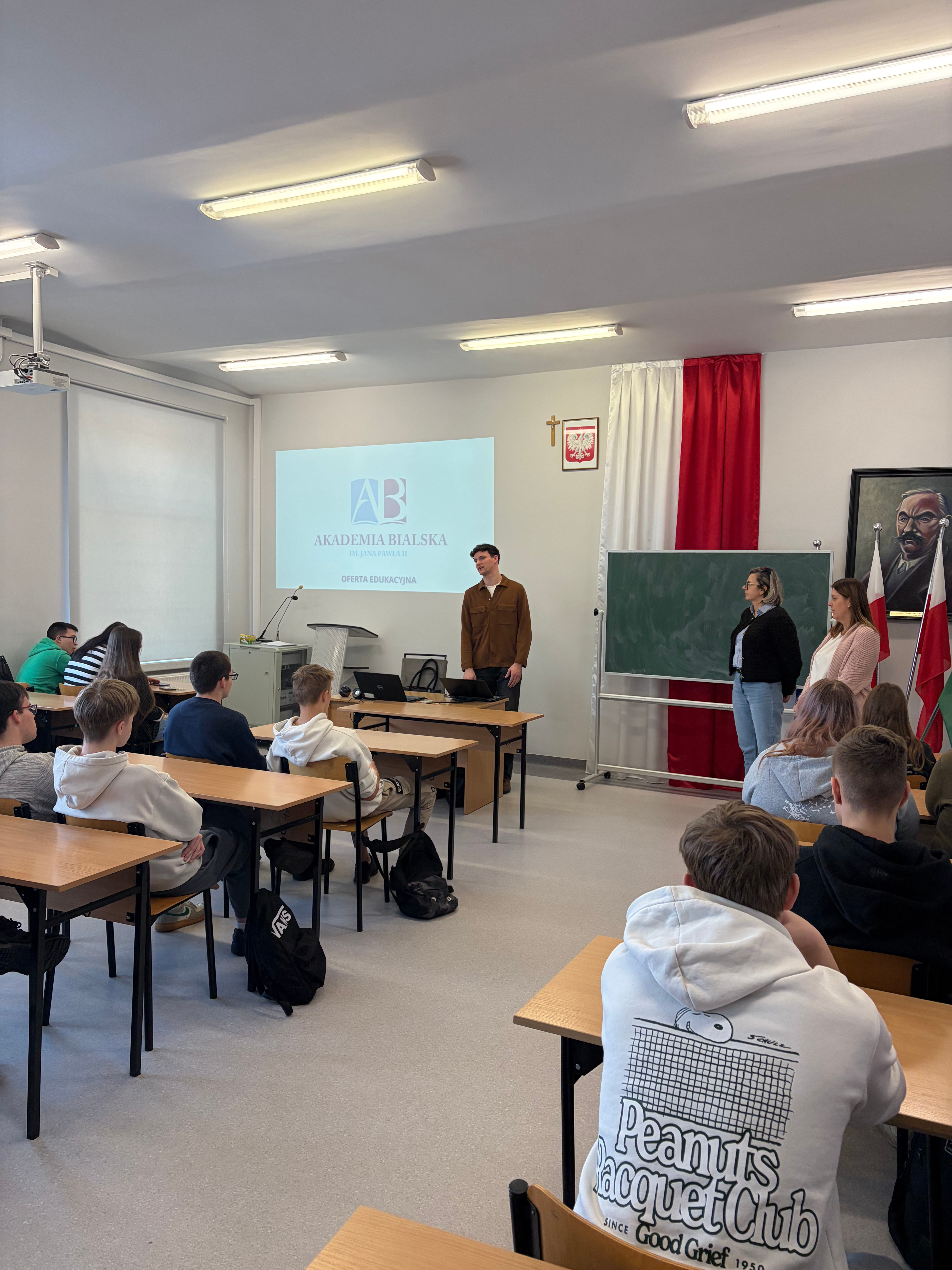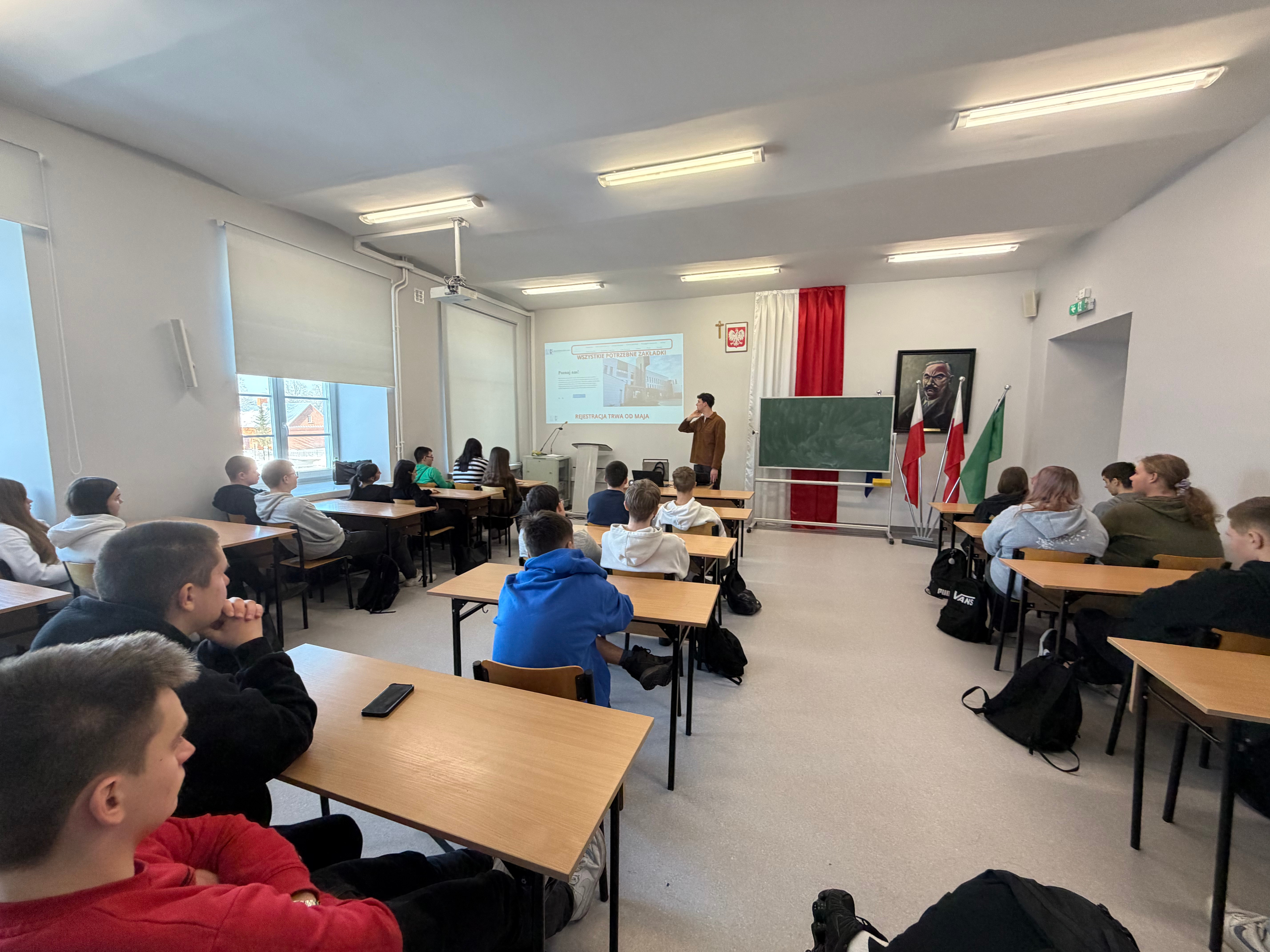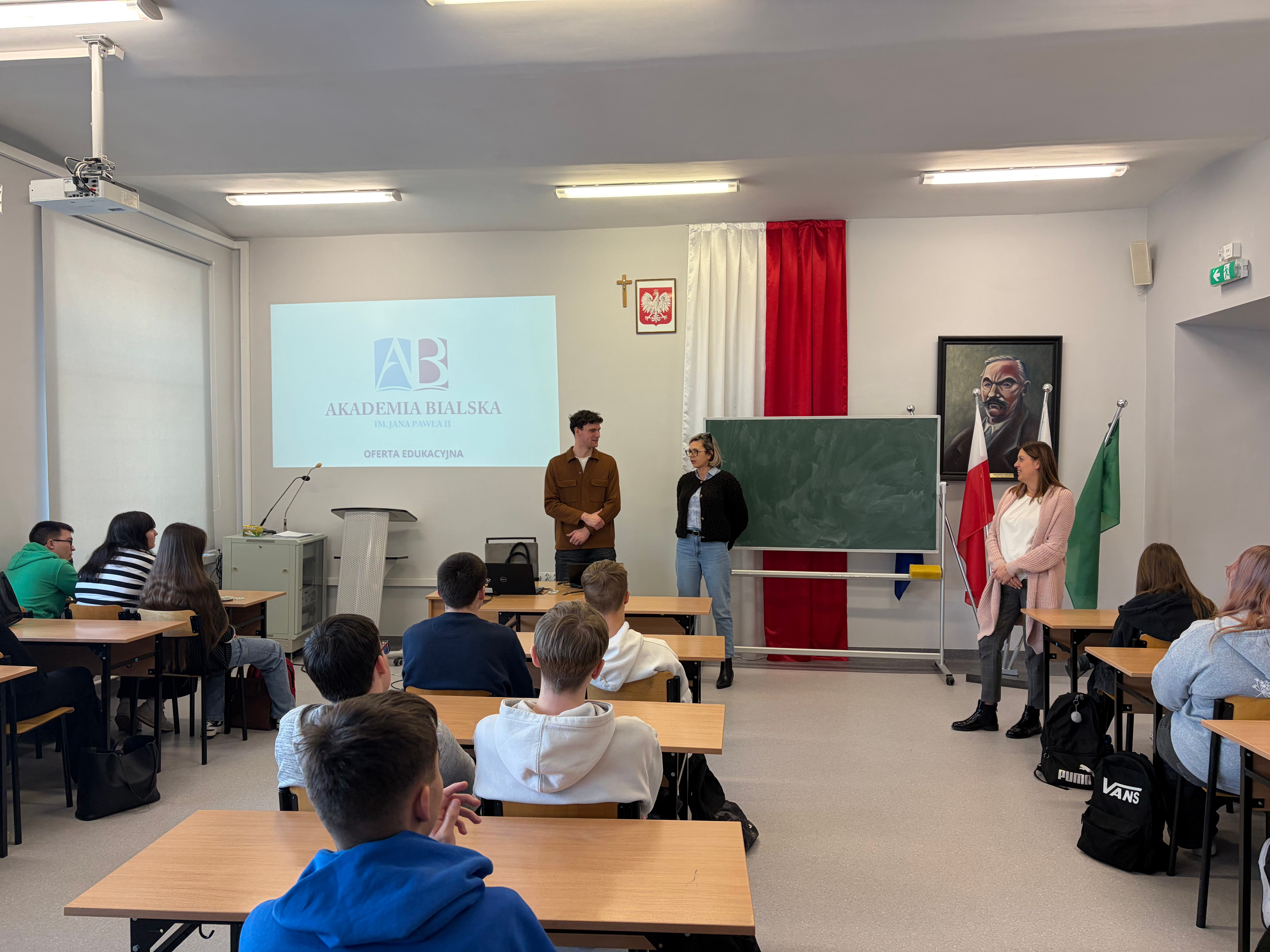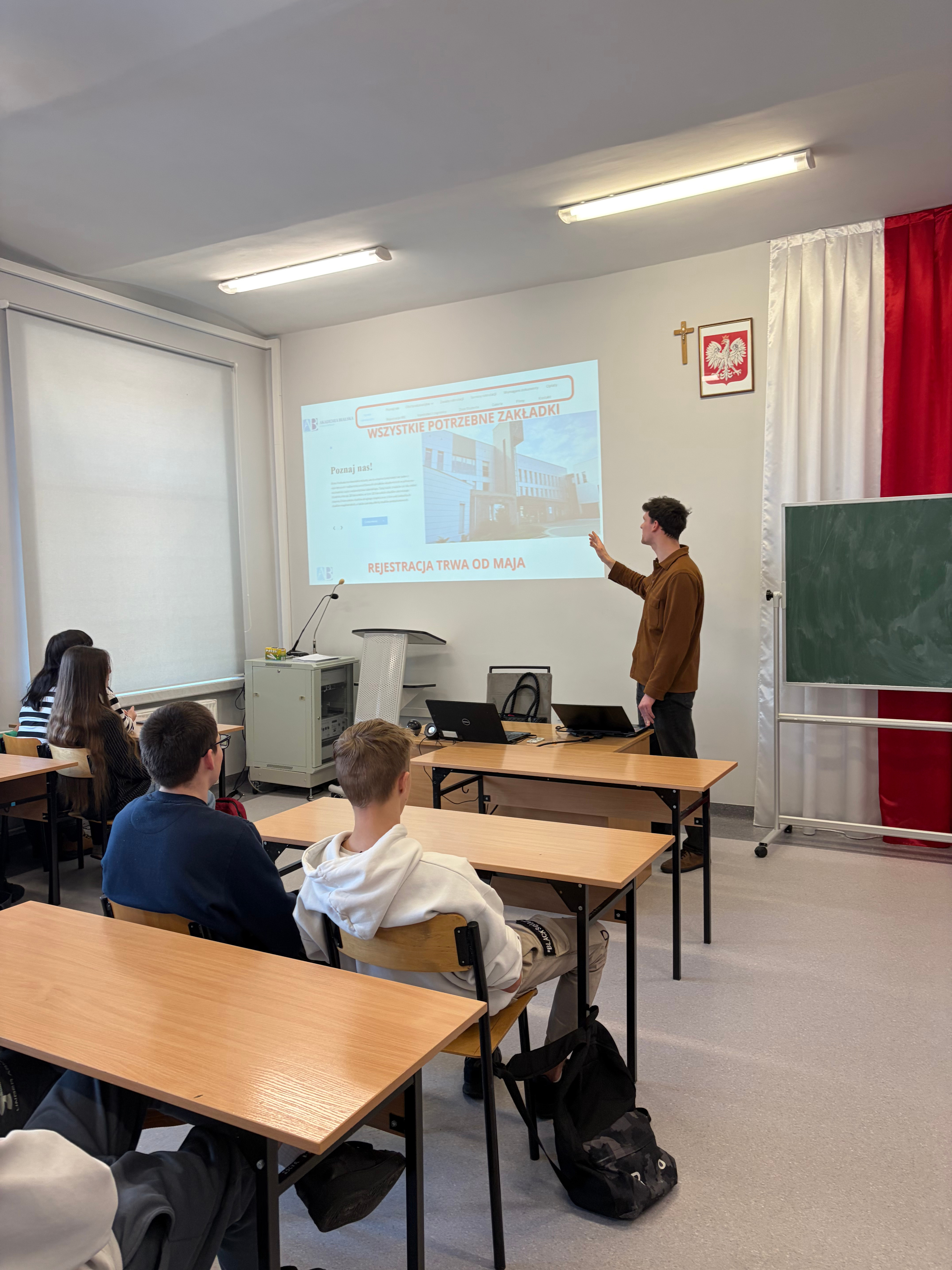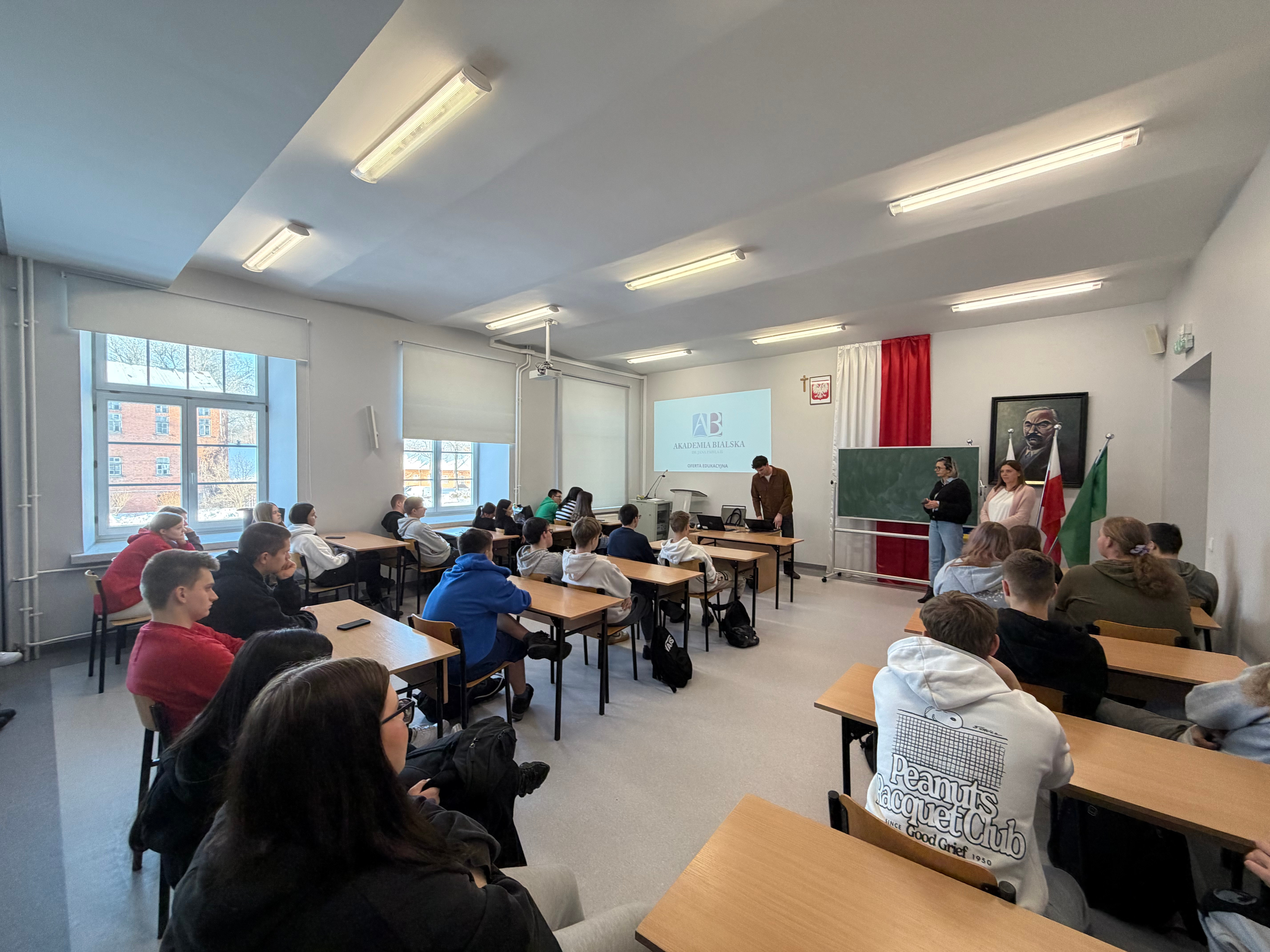 W środę 21 stycznia 2026 r. mieliśmy przyjemność gościć przedstawicieli działu promocji z Akademii Bialskiej im. Jana Pawła II w Białej Podlaskiej. Uczniowie klas czwartych mieli okazję dowiedzieć się na jakich kierunkach kształci uczelnia, jakie są wydziały oraz szczegółowo poznali ofertę edukacyjną uczelni. Ponadto, zaprezentowano bazę dydaktyczną Akademii Bialskiej, sprzęt do zajęć praktycznych i bibliotekę. Na spotkaniu omówiono stypendia jakie studenci mogą pozyskać, wspomniano też o projektach Erasmus + oraz Juwenaliach studenckich. Na koniec przedstawiciele uczelni zaprosili naszą młodzież do Akademii Bialskiej.