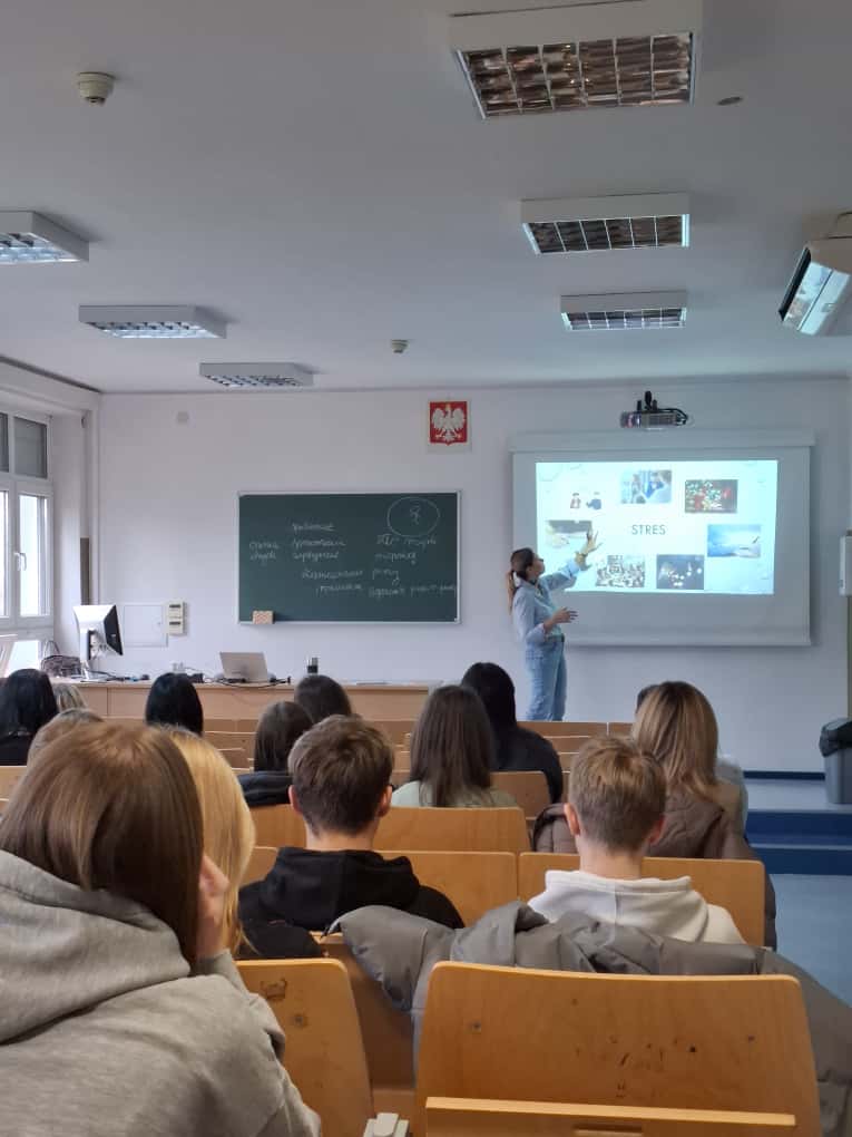 ze stresem i pokonać trudności? poprowadzonym przez panią mgr Joannę Budzicką-Wołowik. Prowadząca wyjaśniła młodzieży podstawowe pojęcia związane ze stresem oraz przedstawiła praktyczne rozwiązania jak dystres zamienić w eustres.