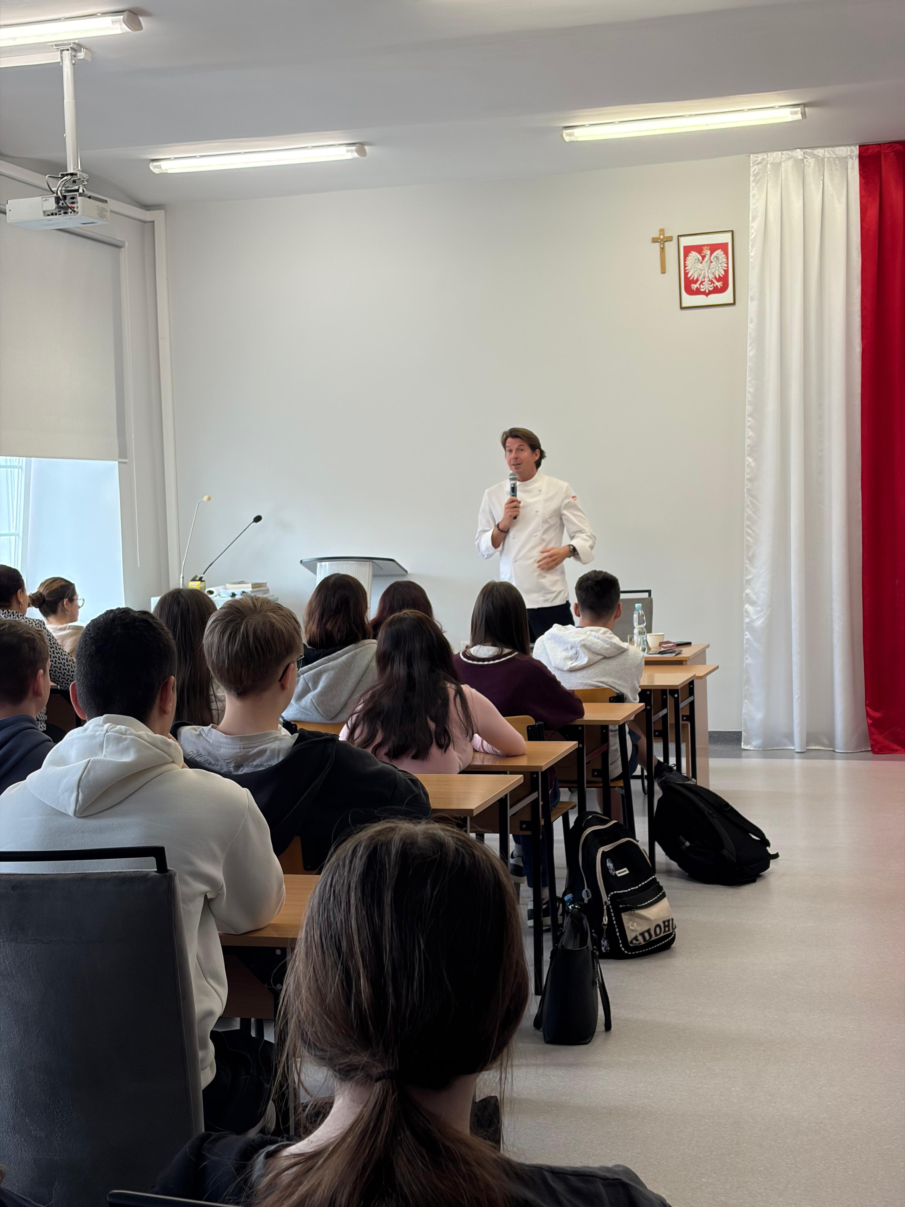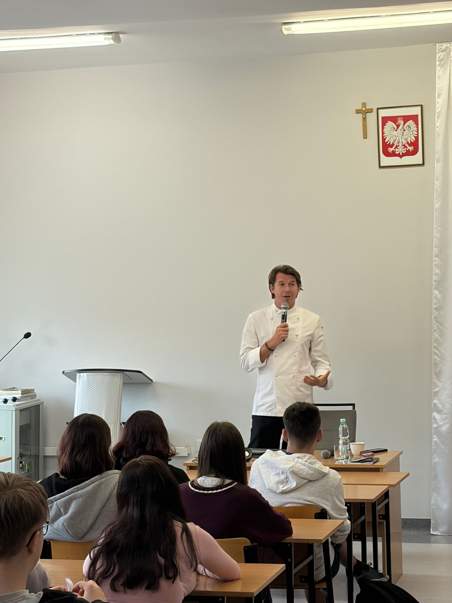 Wizyta pana Karola Okrasy miała charakter inspiracyjno-edukacyjny i cieszyła się ogromnym zainteresowaniem uczniów wszystkich klas zwłaszcza o profilu gastronomicznym.