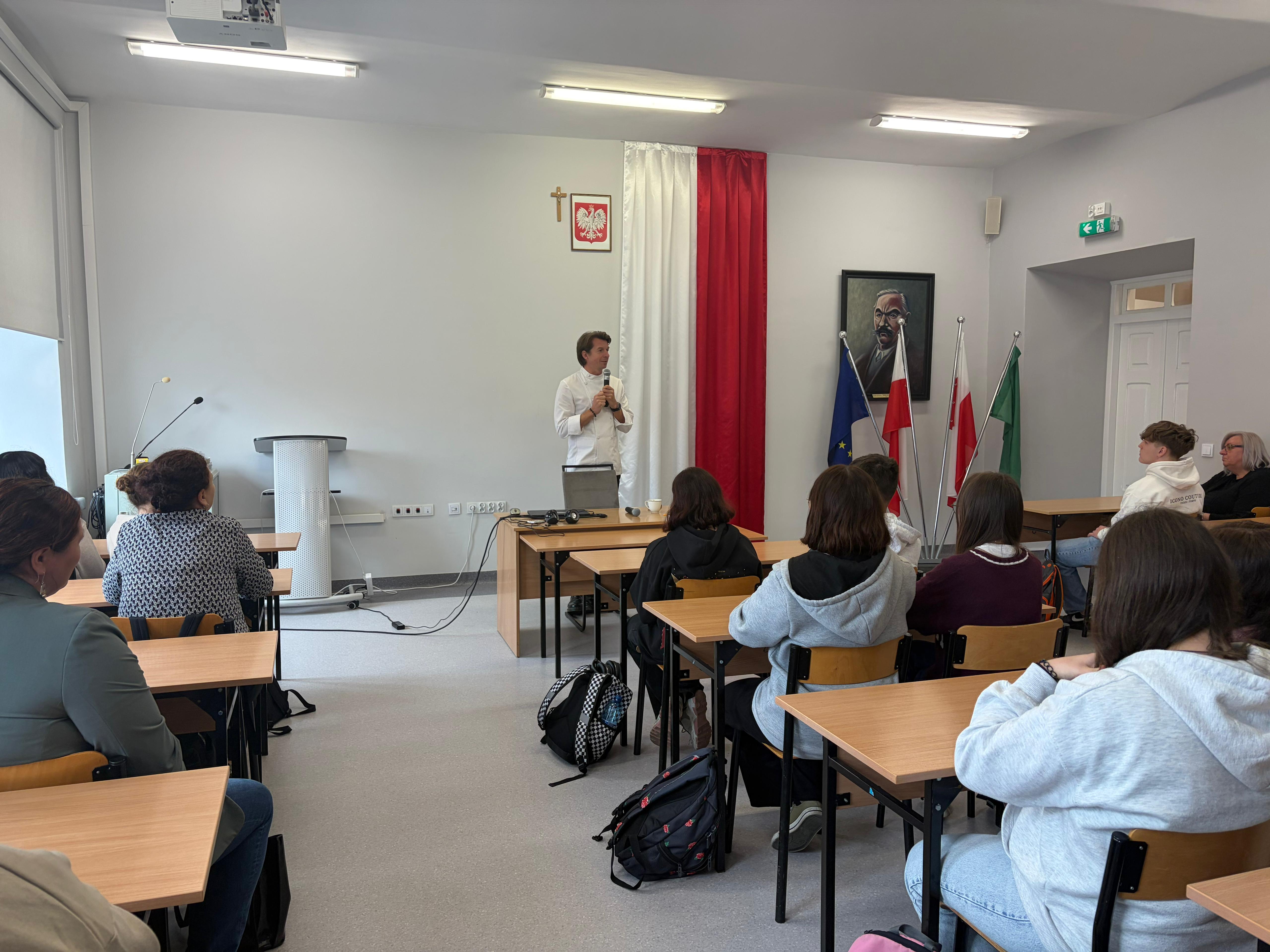 Pan Okrasa rozpoczął spotkanie od otwartego wykładu. Podzielił się z młodzieżą swoją życiową drogą – od chłopięcych marzeń o kuchni, przez ciężką pracę, aż po osiągnięcie pozycji jednego z najbardziej rozpoznawalnych szefów kuchni w Polsce. Głównymi tematami wystąpienia były: pasja jako najważniejszy motor działania w życiu, szczęście rozumiane nie jako stan, lecz jako efekt codziennego dążenia do celu, determinacja i nieustępliwość w pokonywaniu trudności, wewnętrzna motywacja – to, co sprawia, że wstajemy rano i idziemy do pracy z uśmiechem. Po wykładzie odbyła się sesja pytań i odpowiedzi oraz pamiątkowe zdjęcia.