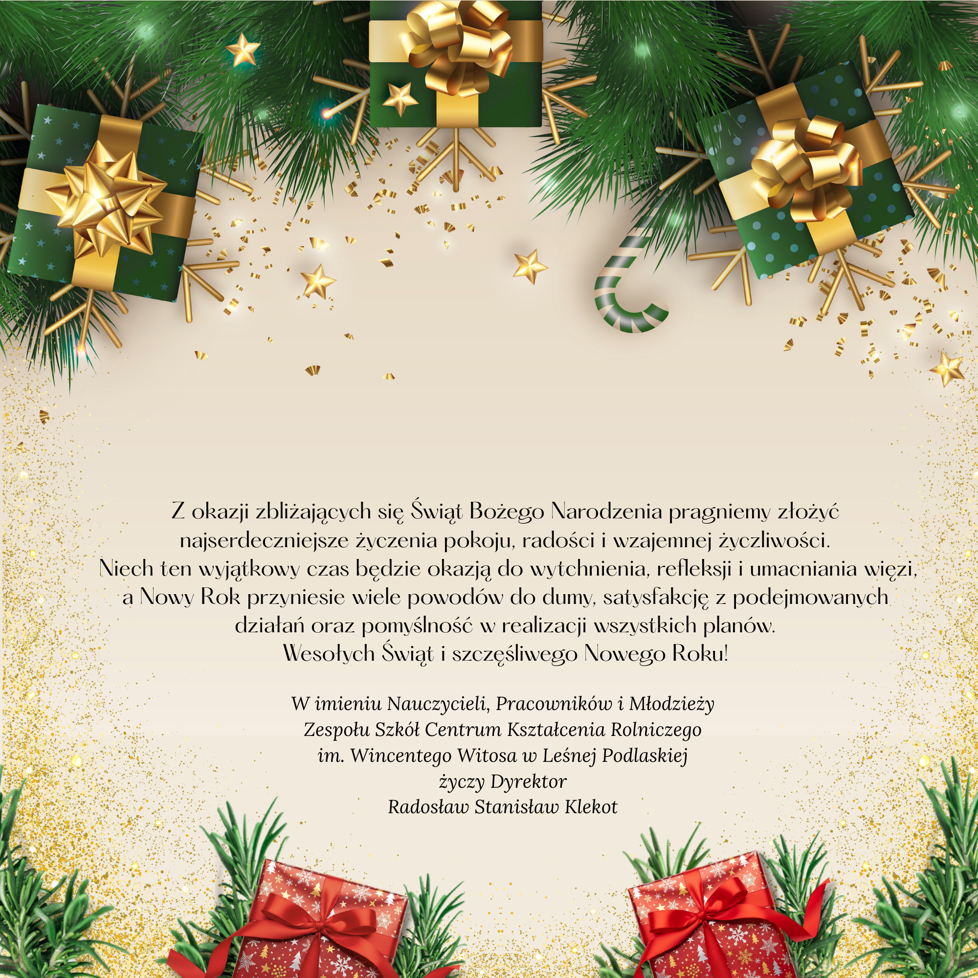 Niech ten wyjątkowy czas będzie okazją do wytchnienia, refleksji i umacniania więzi, a Nowy Rok przyniesie wiele powodów do dumy, satysfakcję z podejmowanych działań oraz pomyślność w realizacji wszystkich planów.