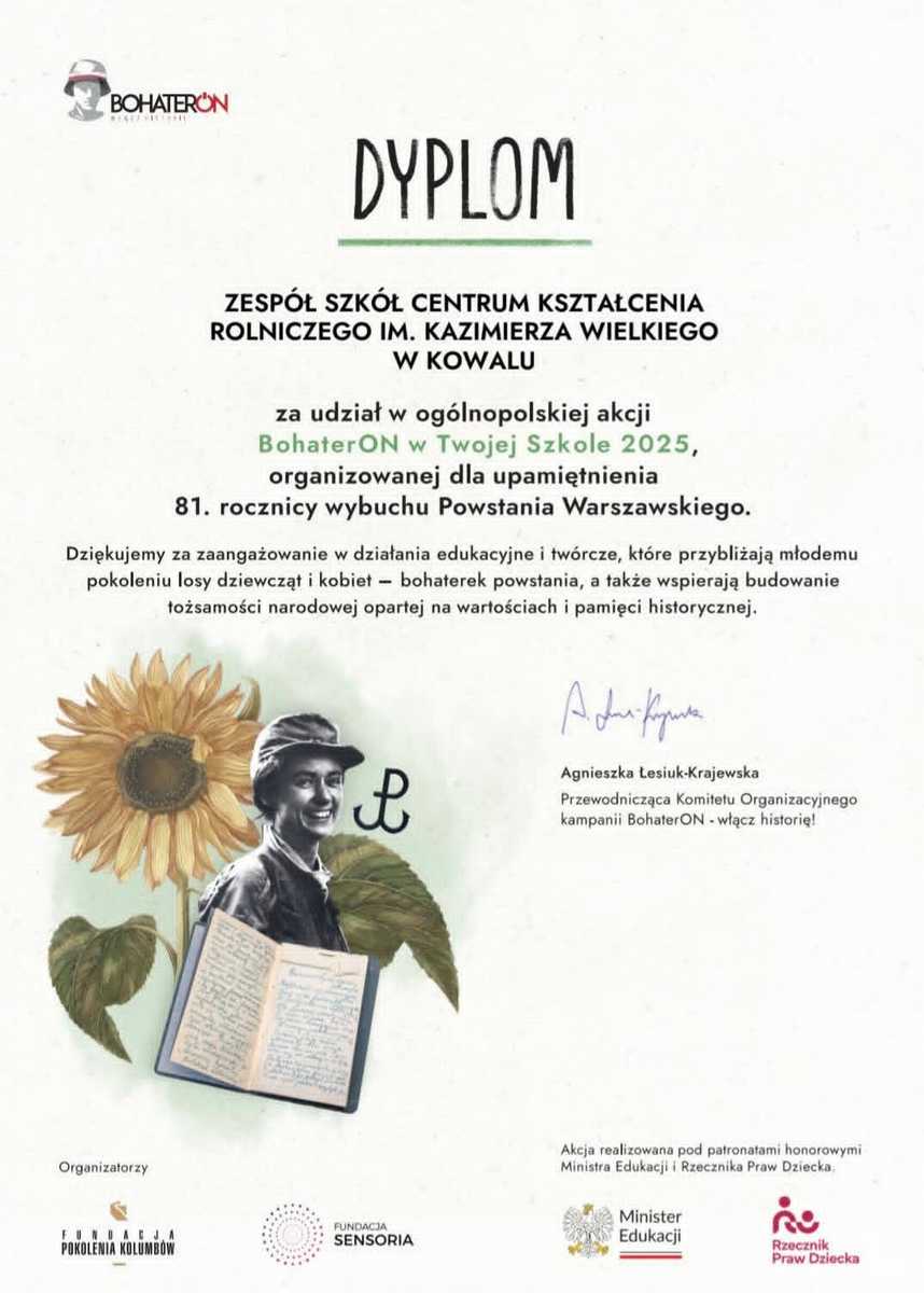 Uczniowie i nauczyciele ZS CKR w Kowalu otrzymali dyplom i podziękowania za zaangażowanie i aktywne włączenie się w ogólnopolską akcję BohaterOn!